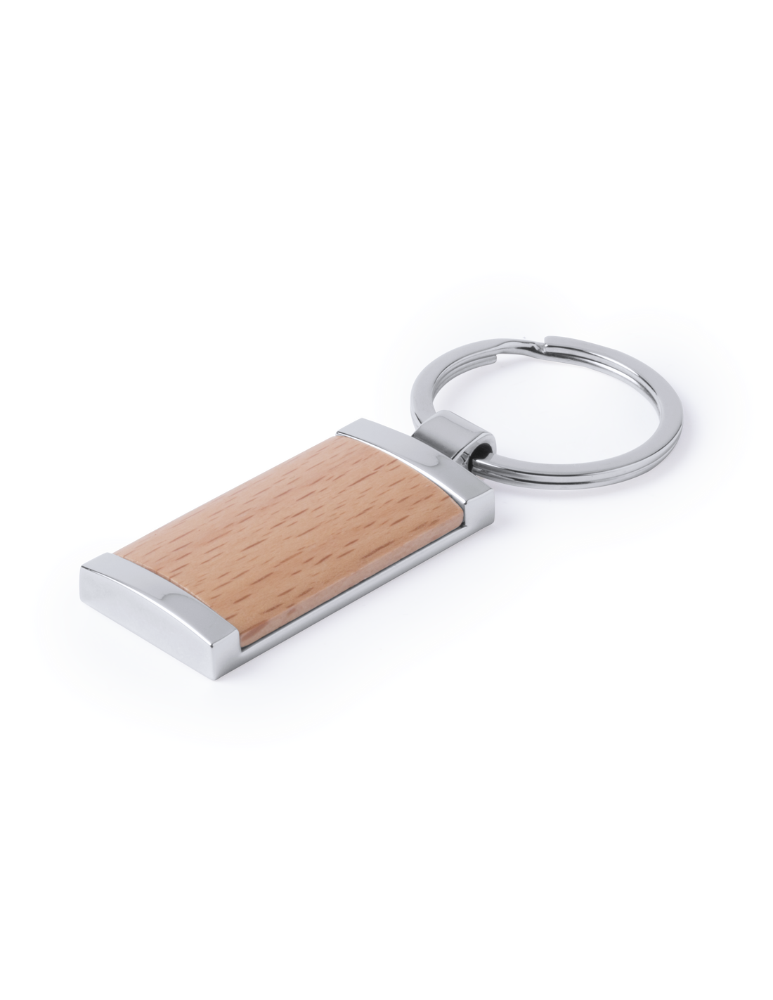 Llavero en combinación de materiales metal de acabado brillante y madera natural. Con amplia superficie para marcaje y presentado en bolsita con refuerzo de cartón en color plateado. Disponible en diseños circular y rectangular.