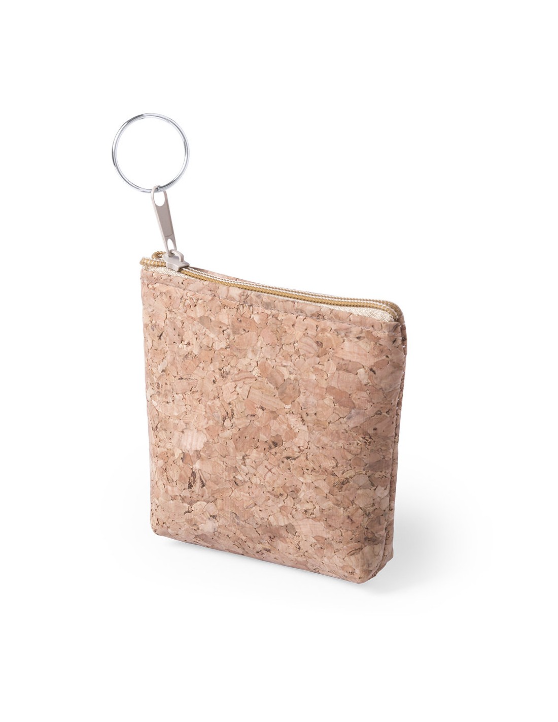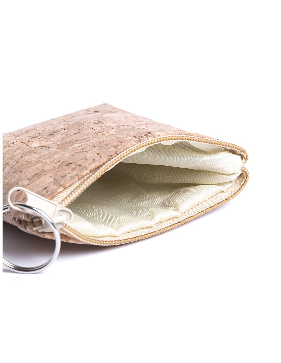 Monedero ecológico de diseño cuadrado en corcho natural y con suave forro interior. Compartimento principal con apertura de cremallera a juego y anilla llavero para transporte.