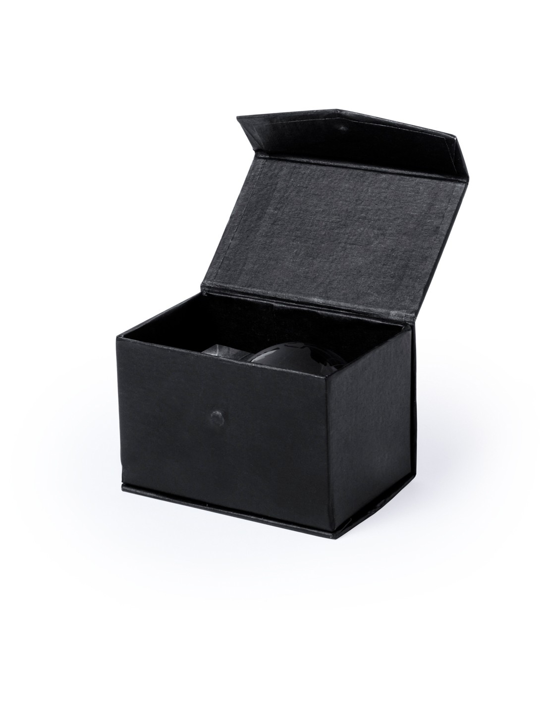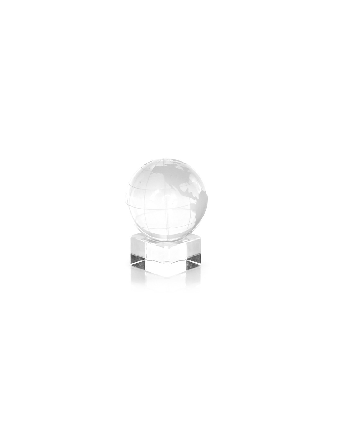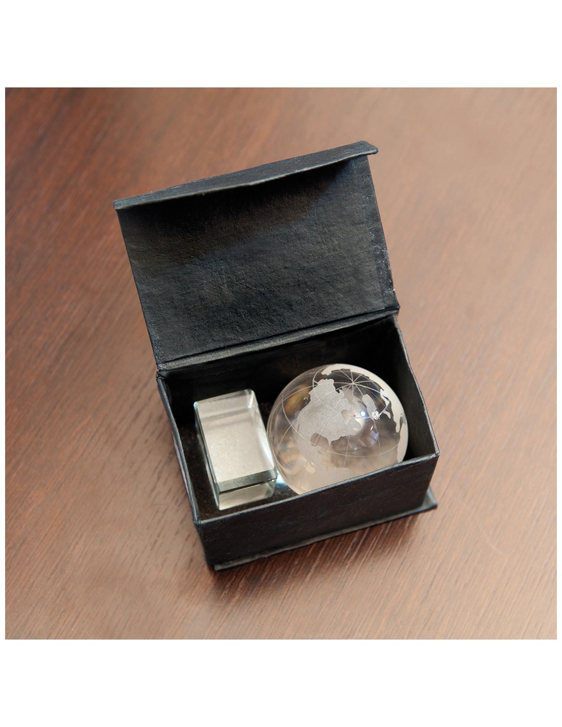 Bola de cristal con forma de planeta Tierra con base para marcaje en láser. Presentada en estuche de protección individual.