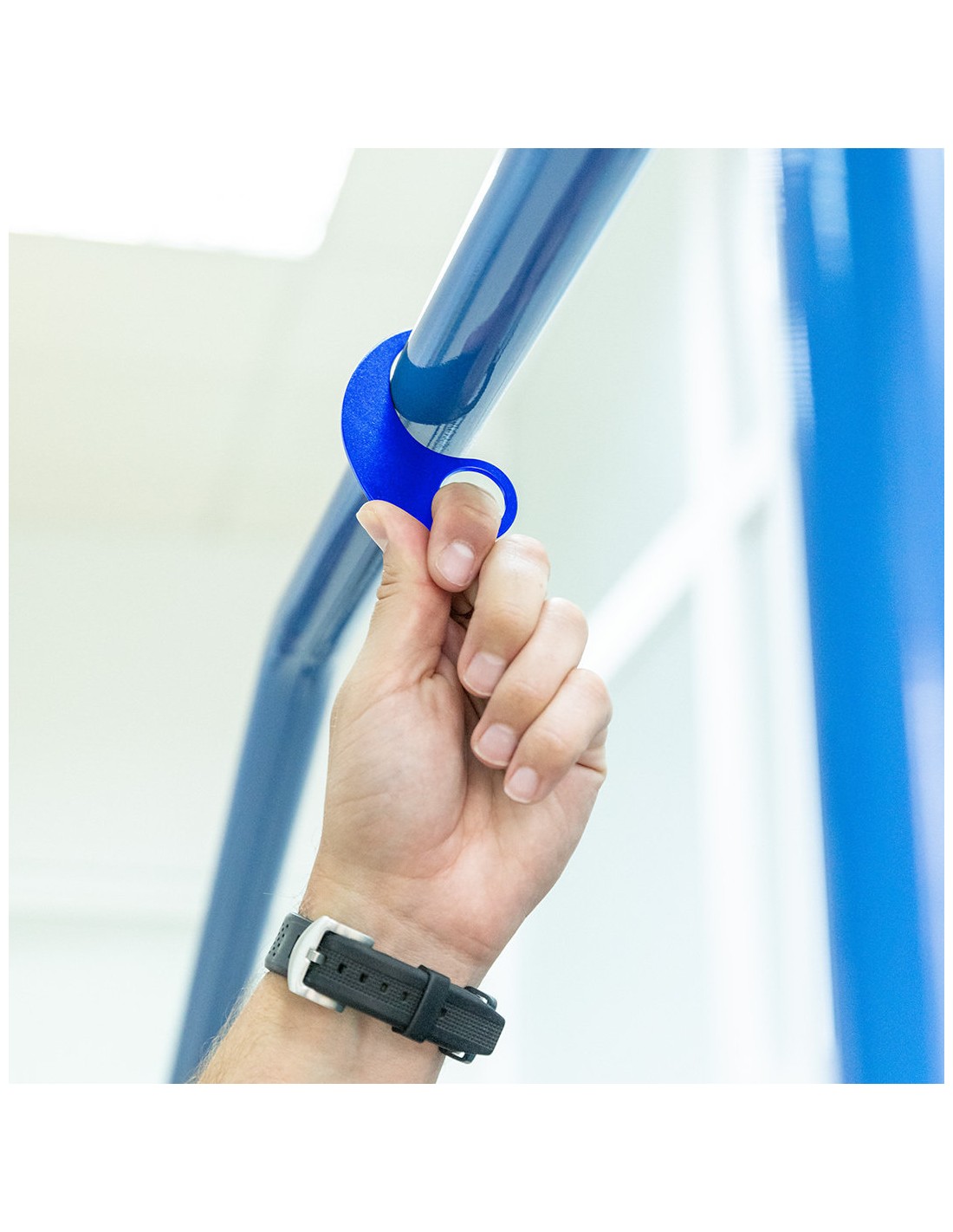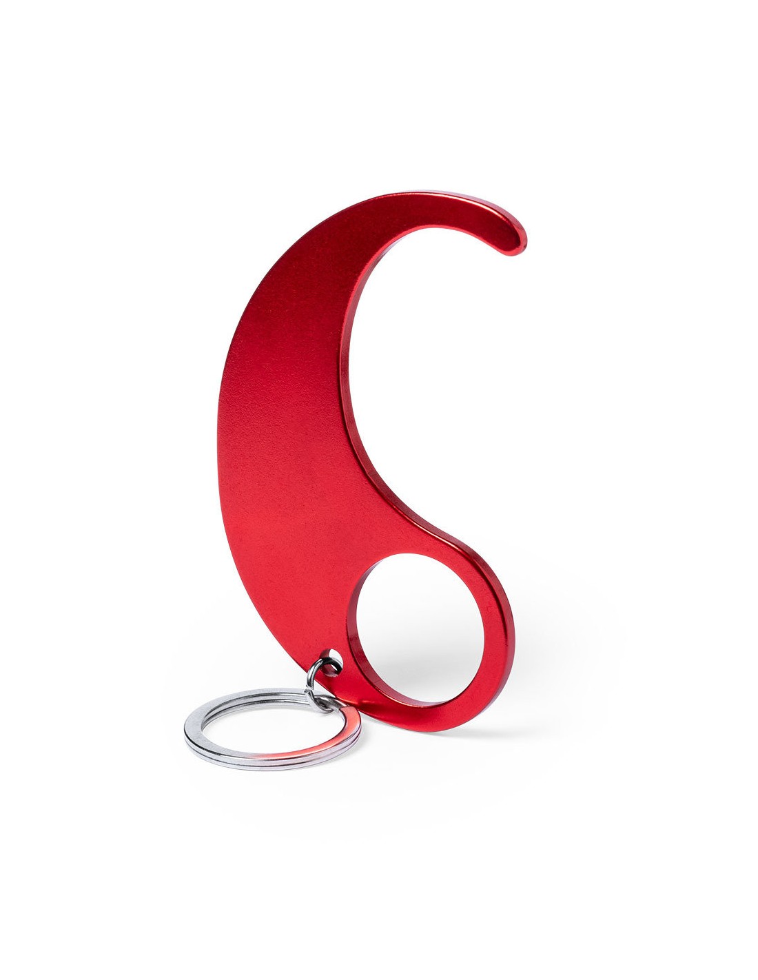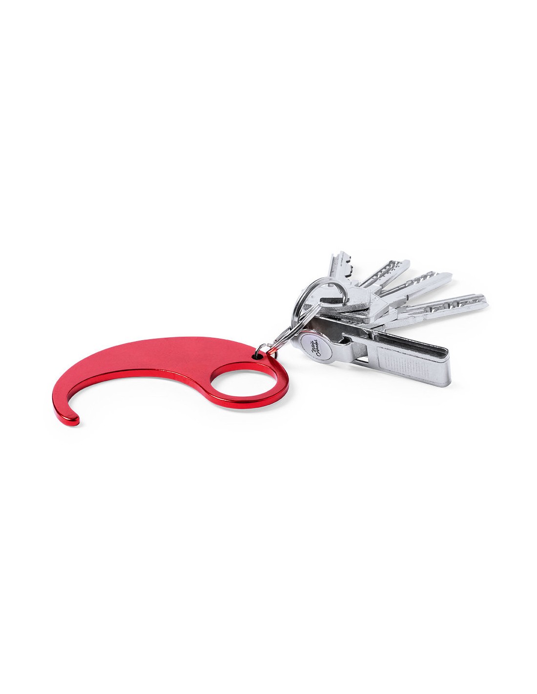 Llavero higiénico anti-contacto, fabricado en resistente Aluminio. El único llavero diseñado especialmente para uso en transporte público y evitar tocar con las manos superficies de uso común (picaportes de puertas, interruptores, grifos de uso público, cajeros automáticos...). Dispone de amplia zona de marcaje y cómodo troquel para el dedo. Acabado en aluminio en vivos y variados colores. Presentado en bolsita de diseño individual.