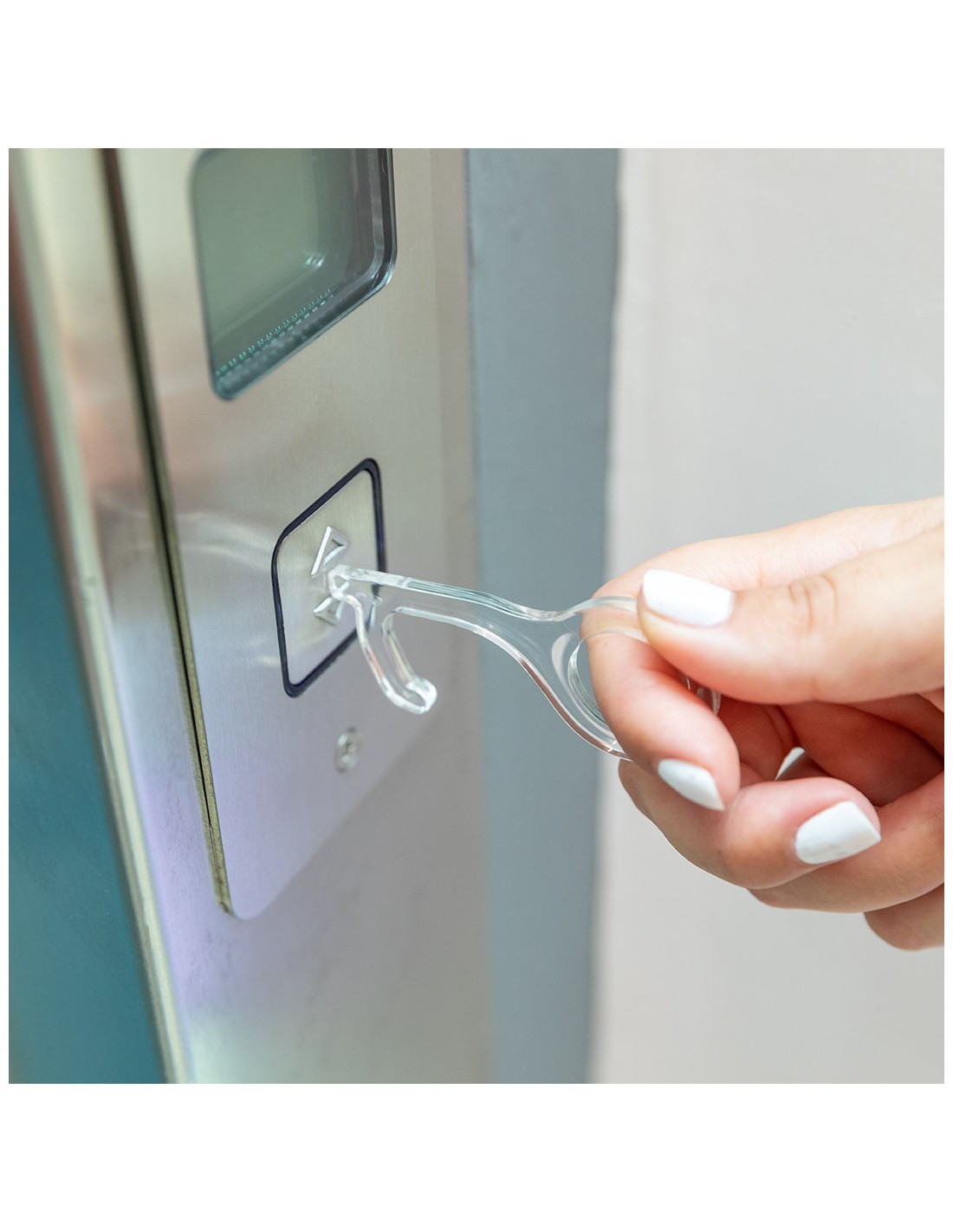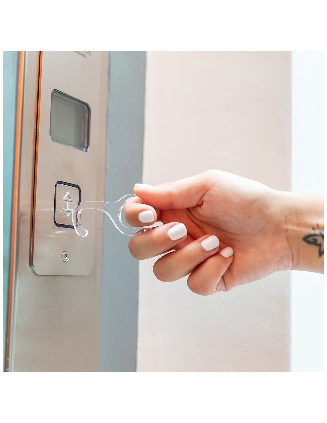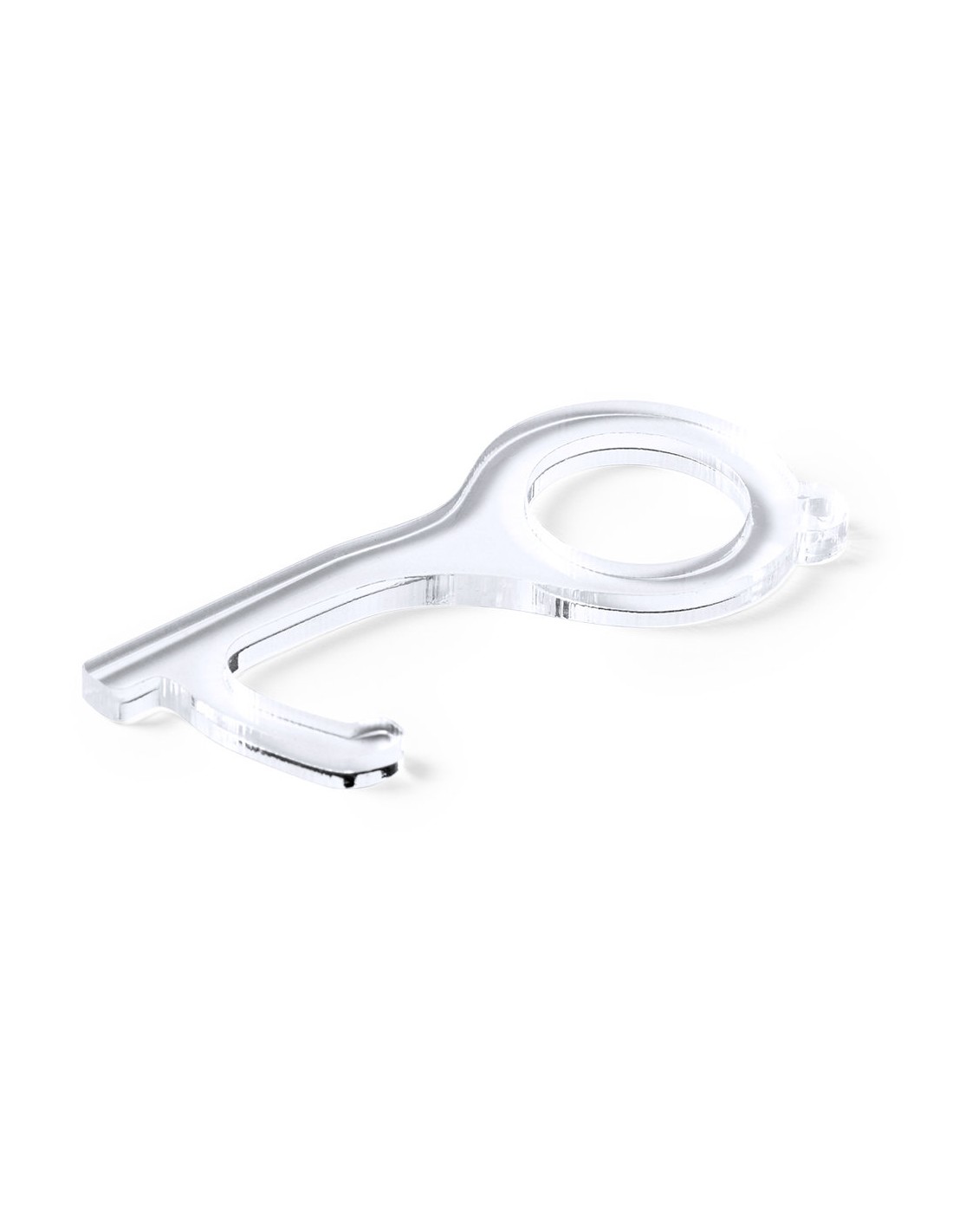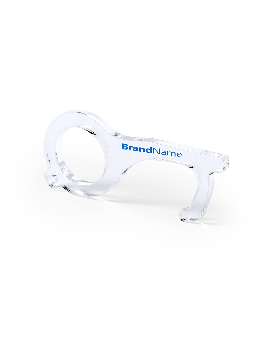 Llavero higiénico anti-contacto, fabricado en original y resistente material acrílico de acabado transparente. Especialmente diseñado para evitar tocar con las manos superficies de uso común (picaportes de puertas, interruptores, grifos de uso público, cajeros automáticos...). Con cómodo troquel para el dedo y presentado en bolsa individual de diseño. Recomendado para marcaje en tampografía.