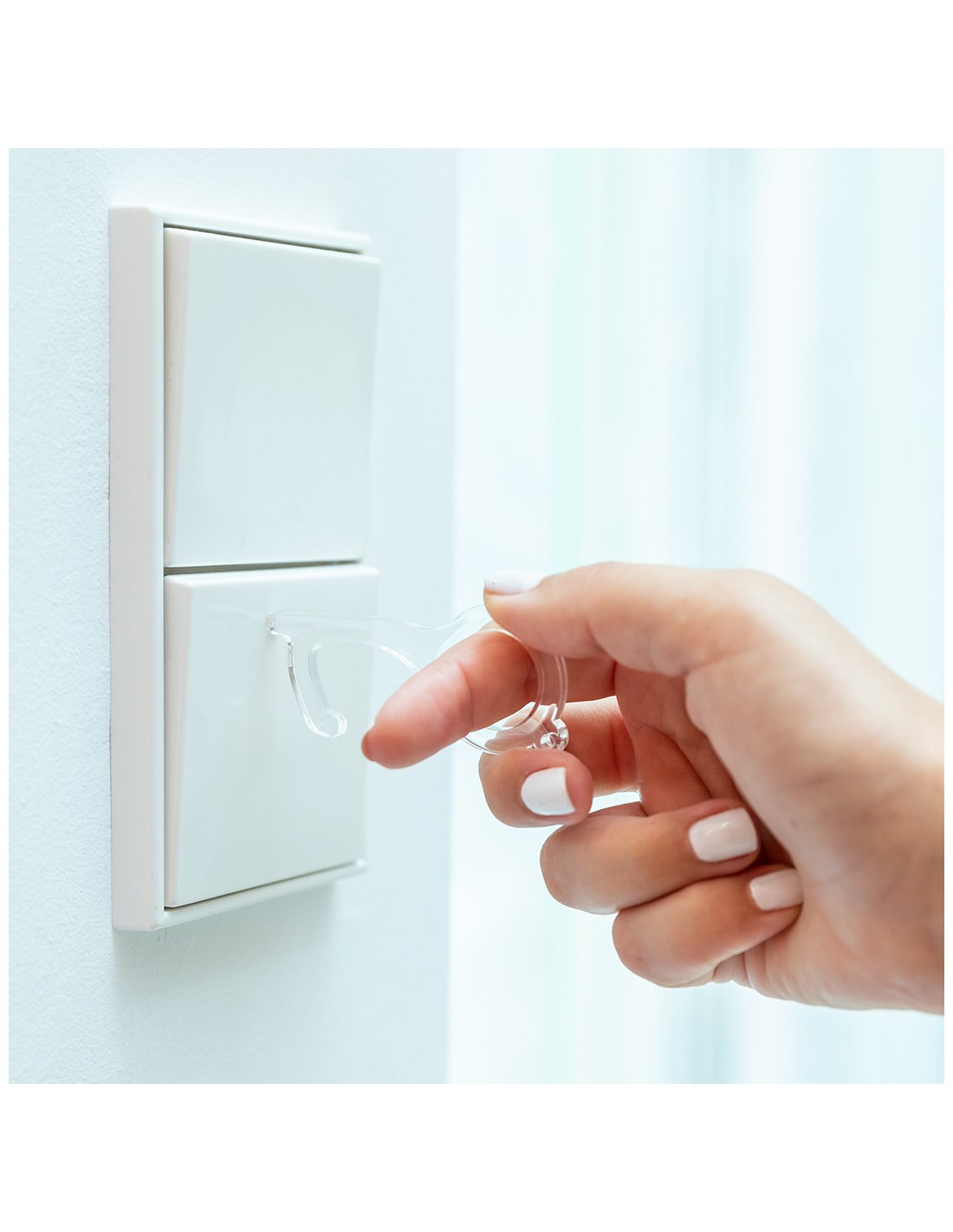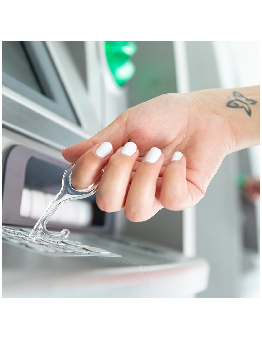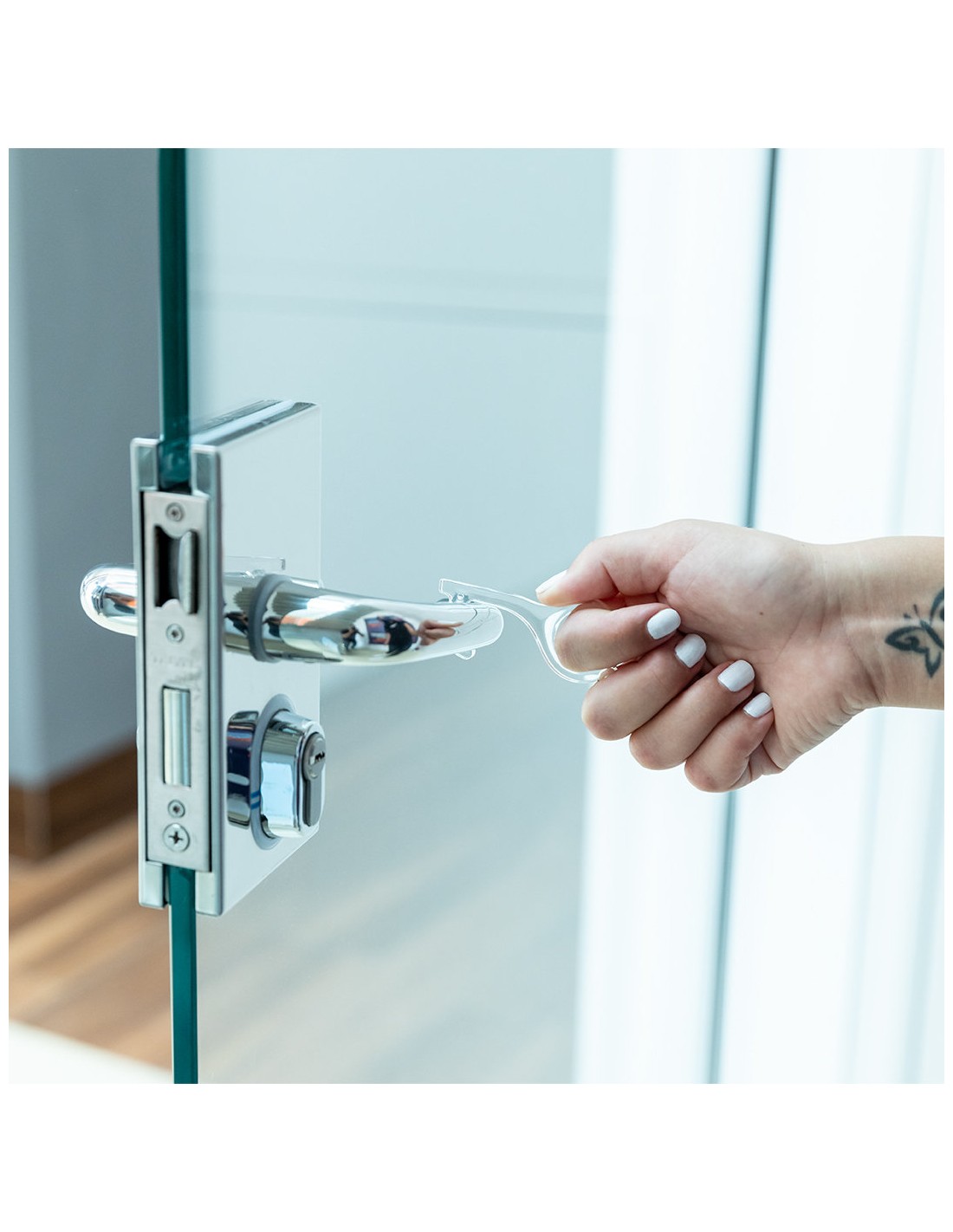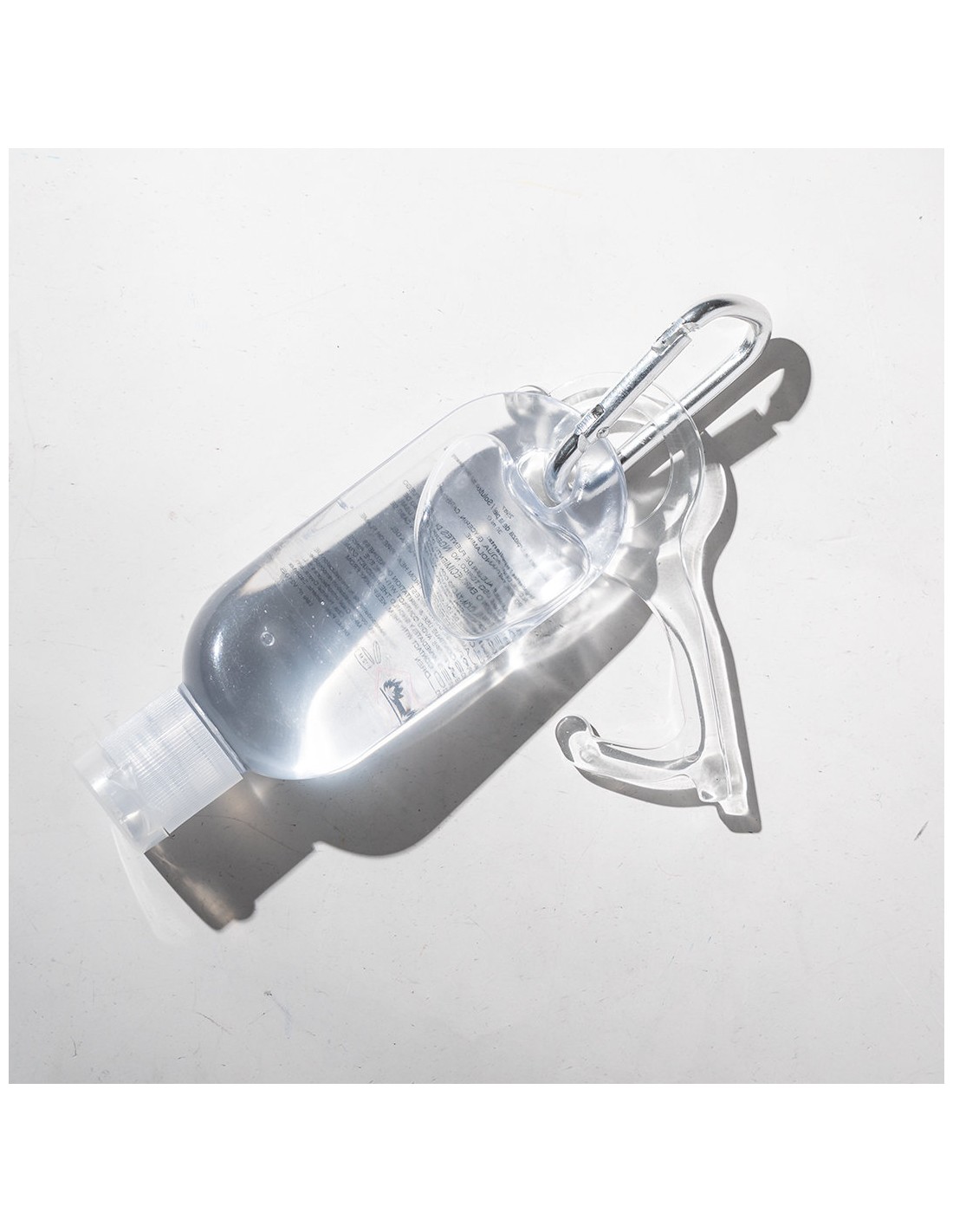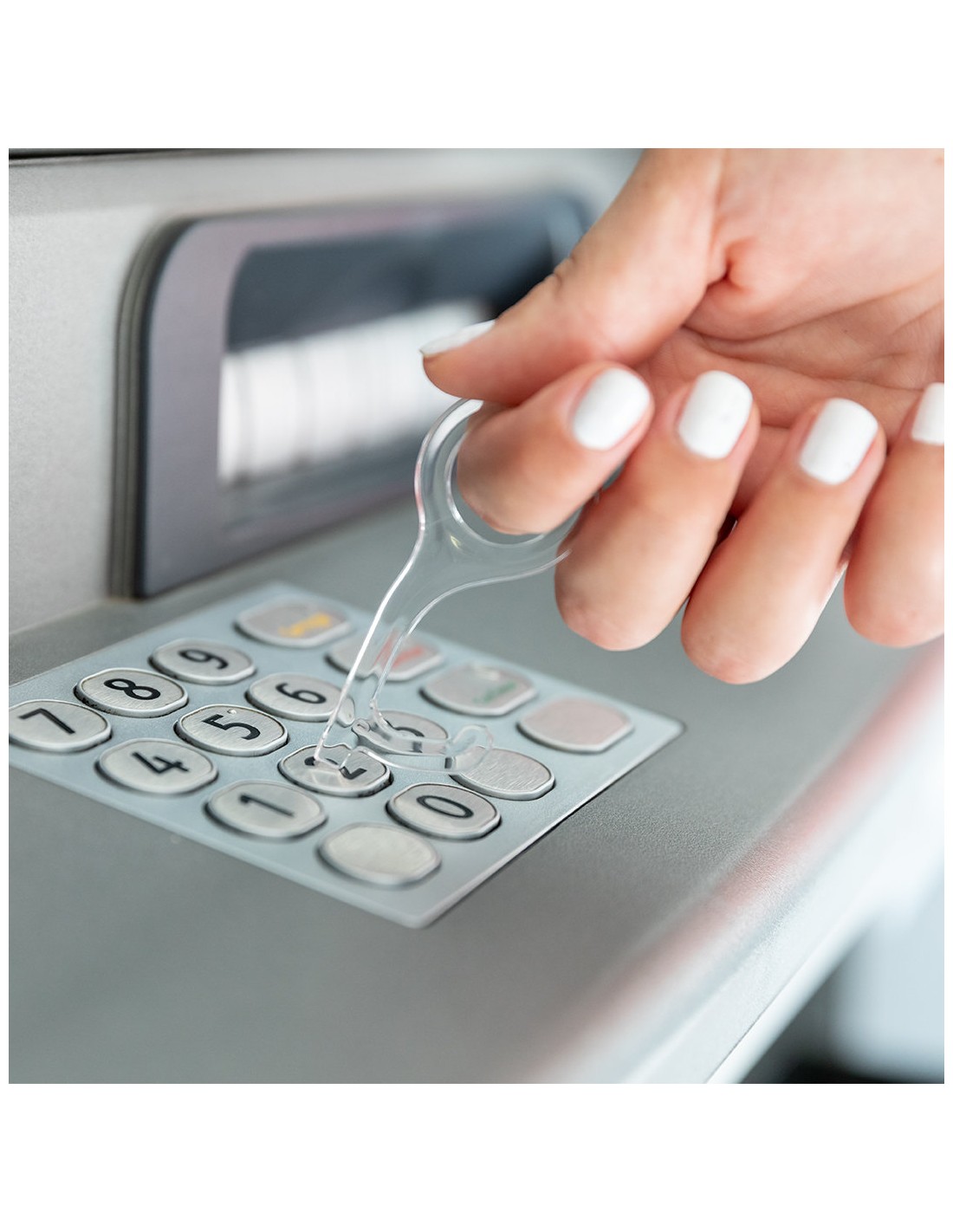 Llavero higiénico anti-contacto, fabricado en original y resistente material acrílico de acabado transparente. Especialmente diseñado para evitar tocar con las manos superficies de uso común (picaportes de puertas, interruptores, grifos de uso público, cajeros automáticos...). Con cómodo troquel para el dedo y presentado en bolsa individual de diseño. Recomendado para marcaje en tampografía.