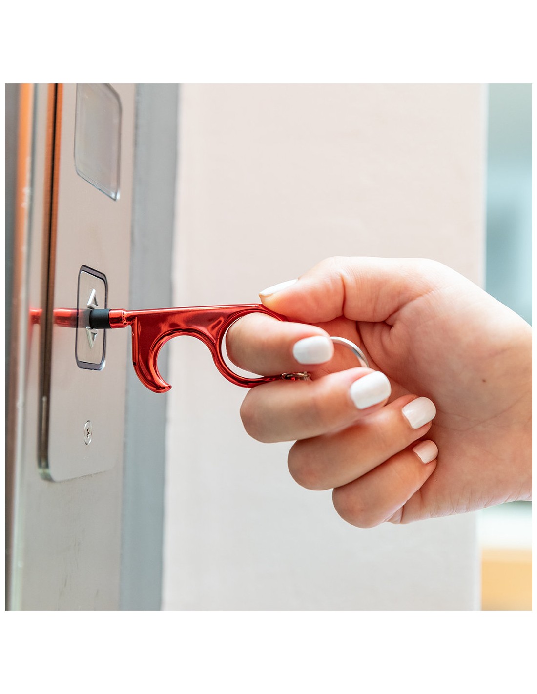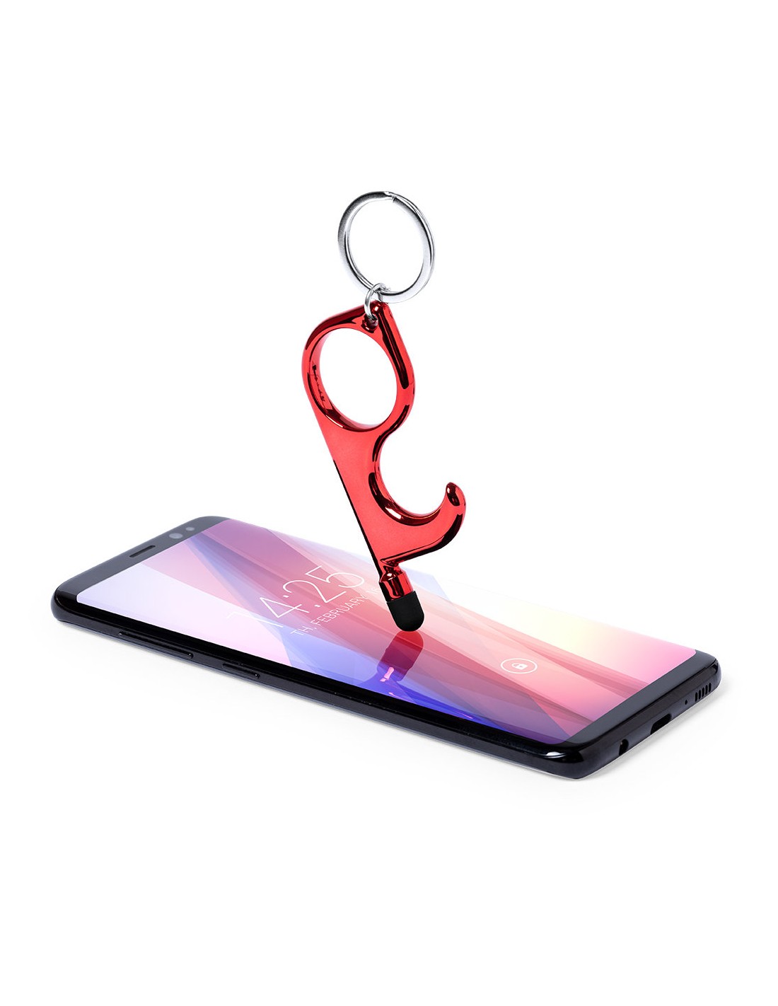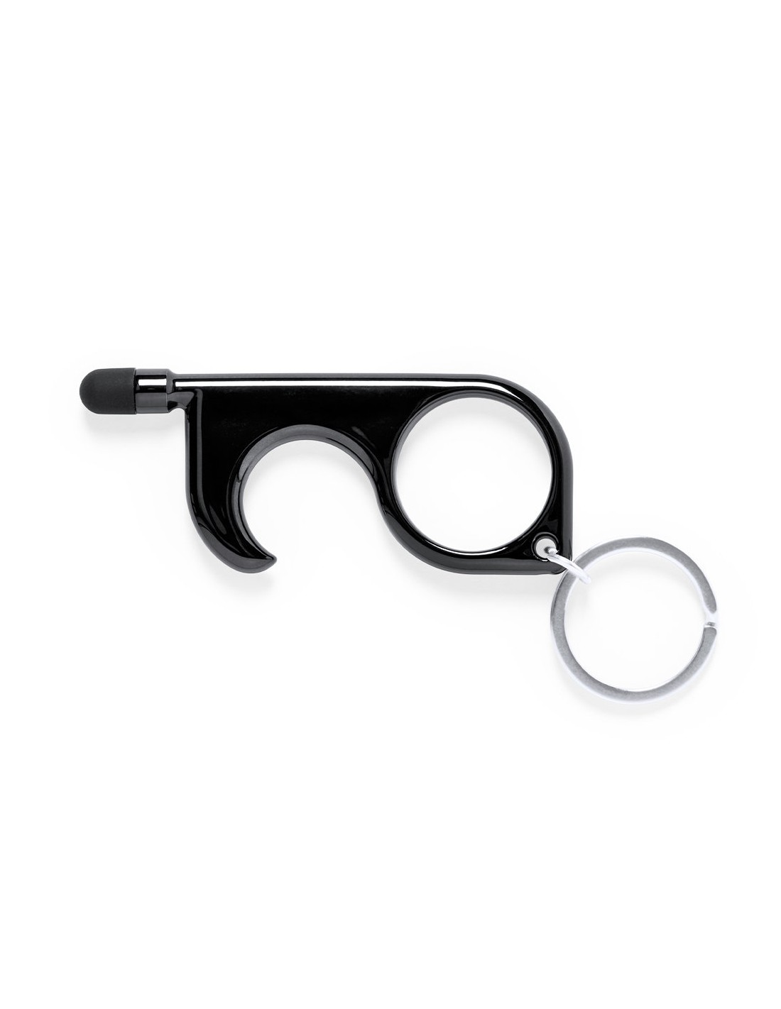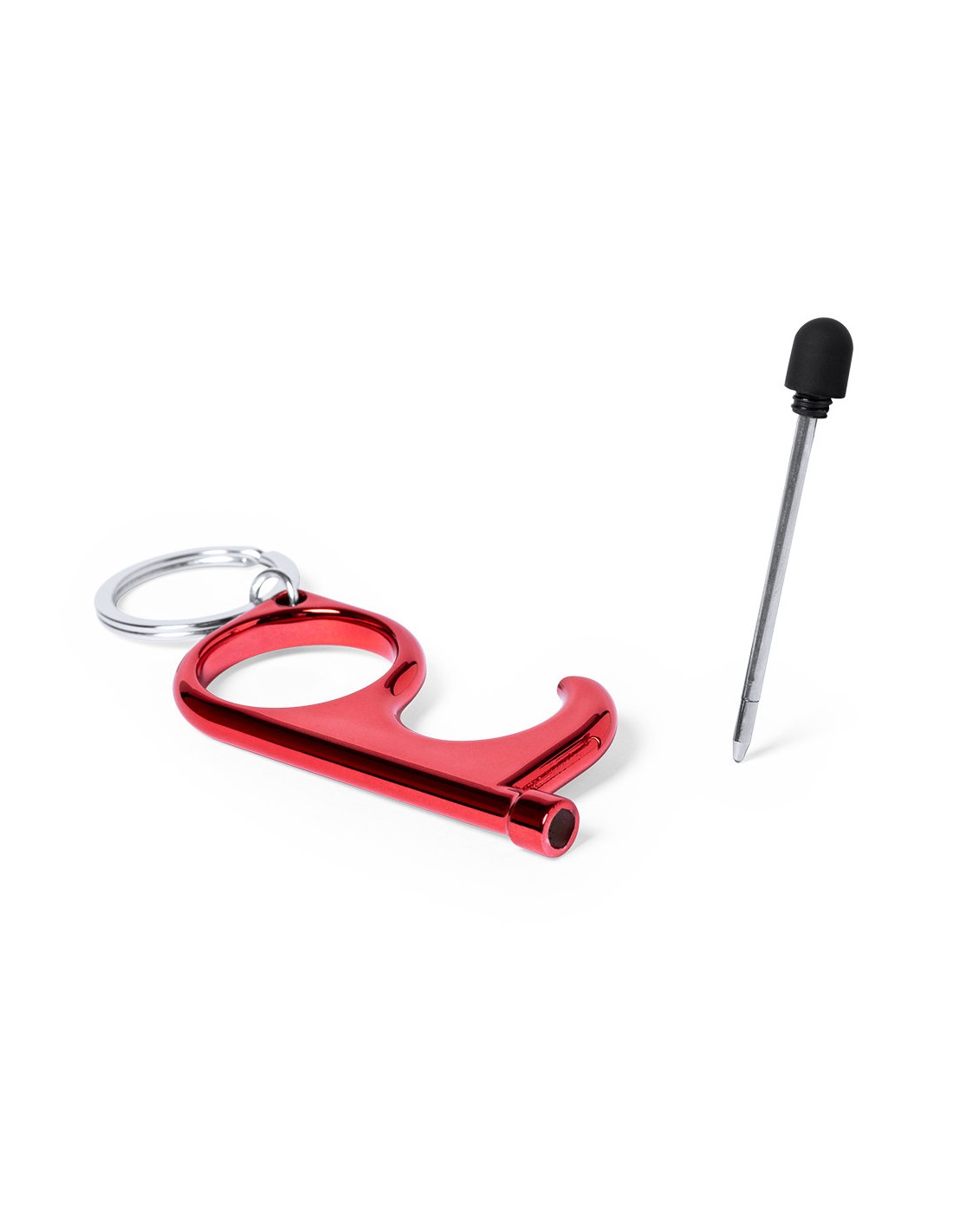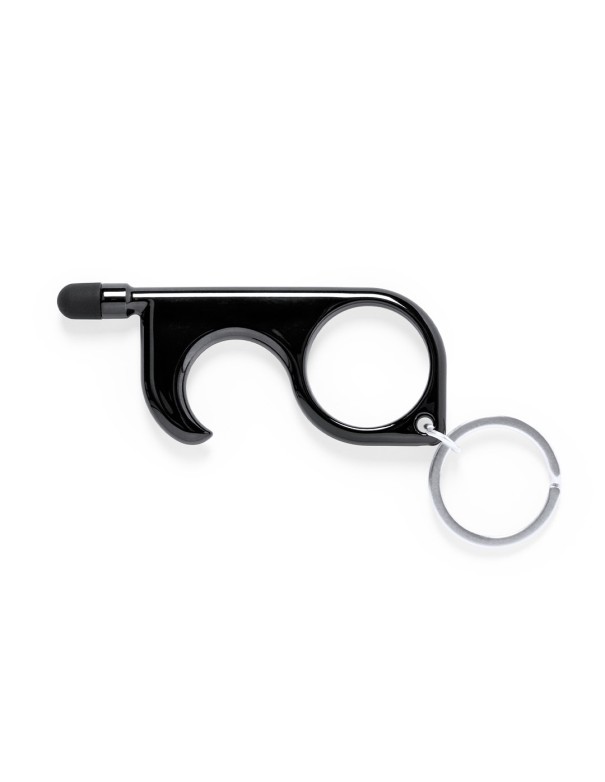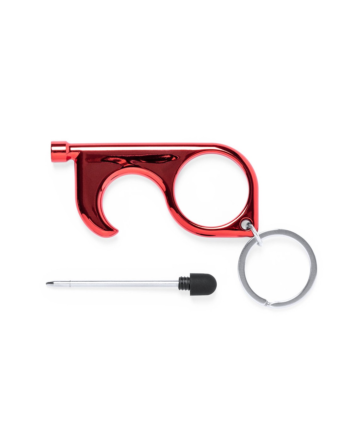 Llavero higiénico anti-contacto con bolígrafo y puntero integrados. Fabricado en resistente ABS de acabado metalizado y disponible en variada gama de colores. Especialmente diseñado para evitar tocar con las manos superficies de uso común (picaportes de puertas, interruptores, grifos de uso público, cajeros automáticos...). Con cómodo troquel para el dedo y presentado en bolsa individual de diseño. Recomendado para marcaje en tampografía.