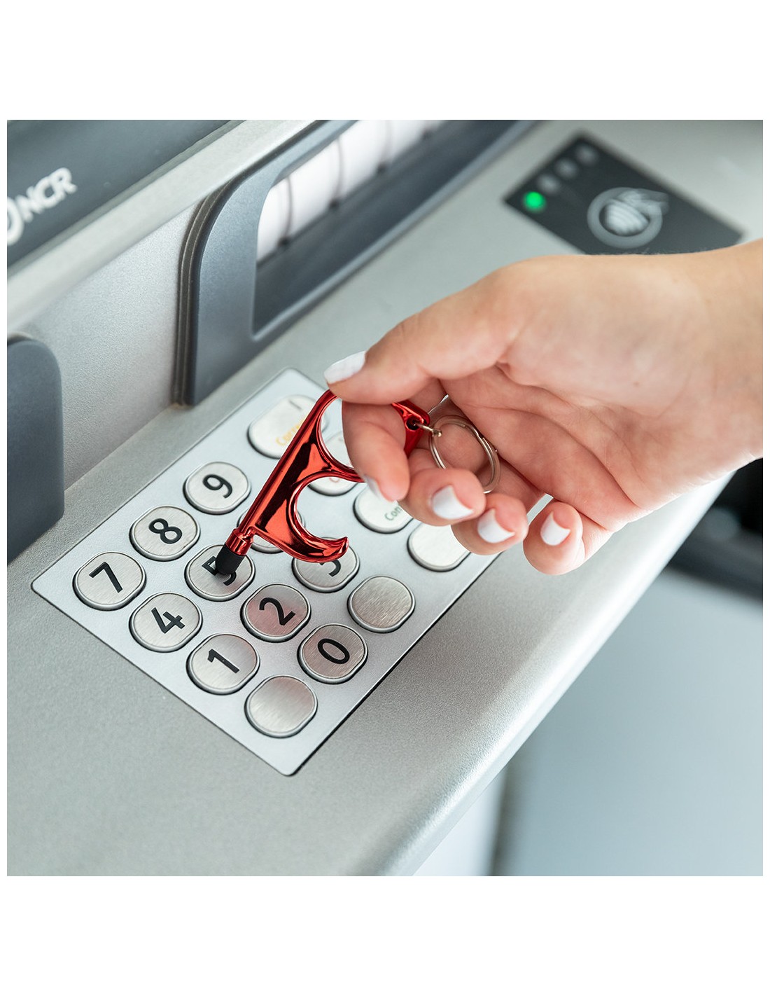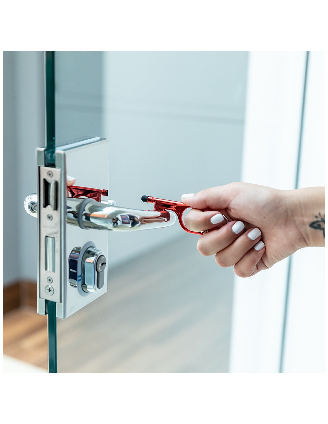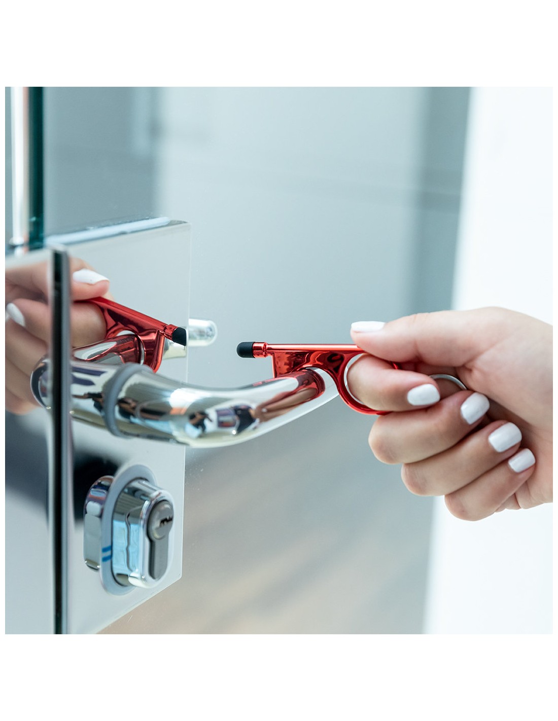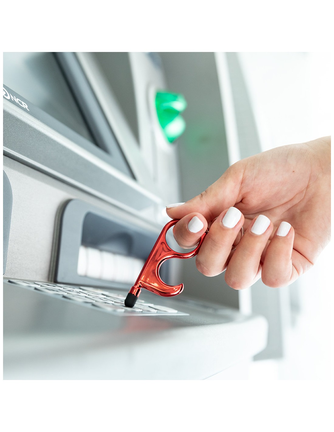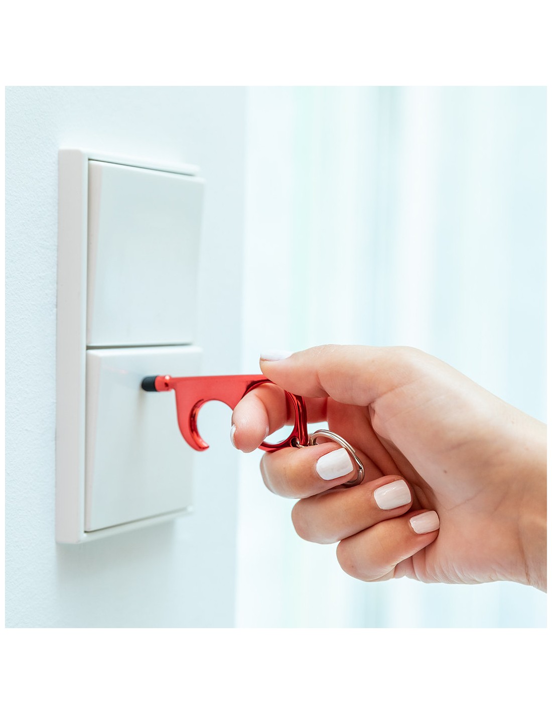 Llavero higiénico anti-contacto con bolígrafo y puntero integrados. Fabricado en resistente ABS de acabado metalizado y disponible en variada gama de colores. Especialmente diseñado para evitar tocar con las manos superficies de uso común (picaportes de puertas, interruptores, grifos de uso público, cajeros automáticos...). Con cómodo troquel para el dedo y presentado en bolsa individual de diseño. Recomendado para marcaje en tampografía.