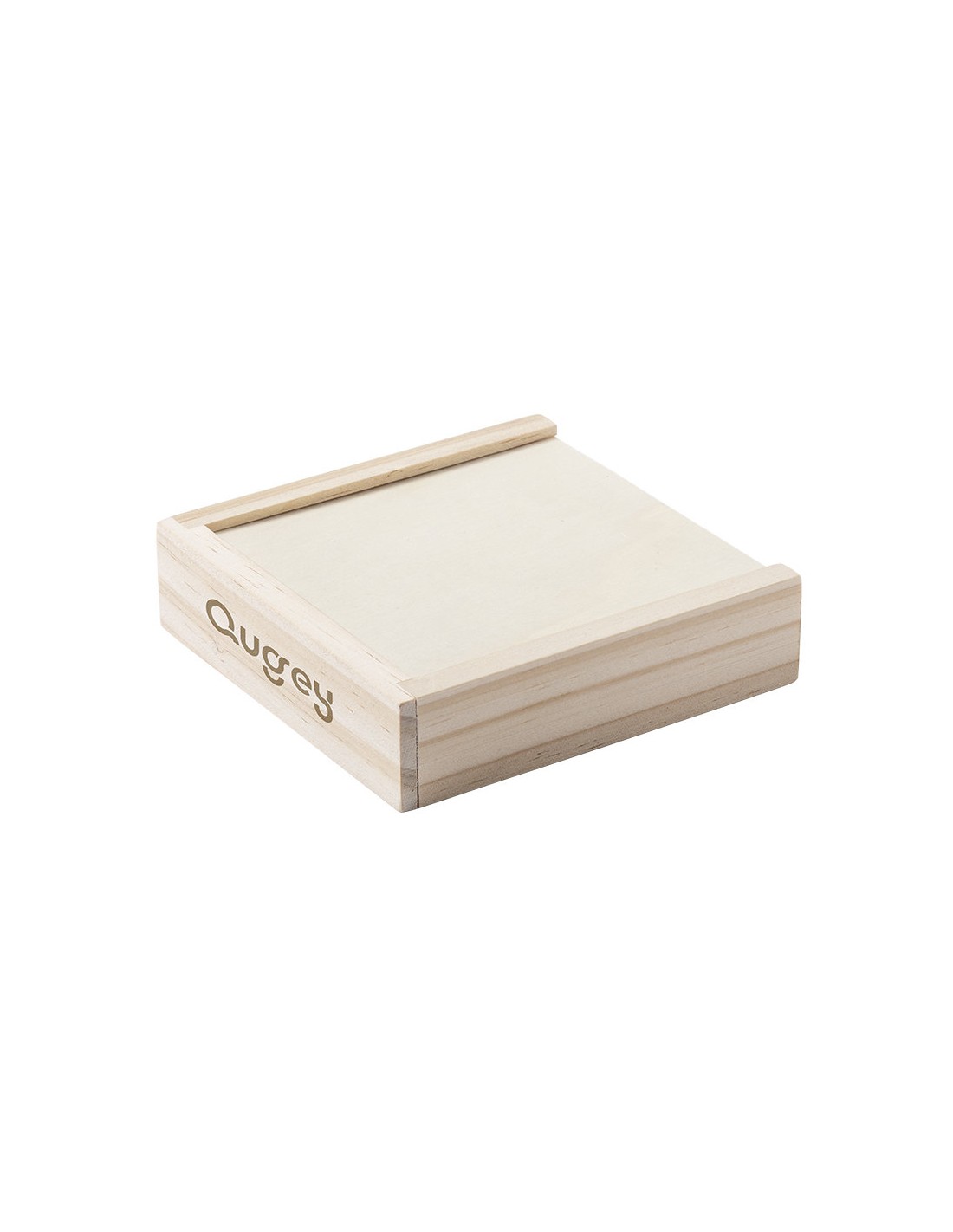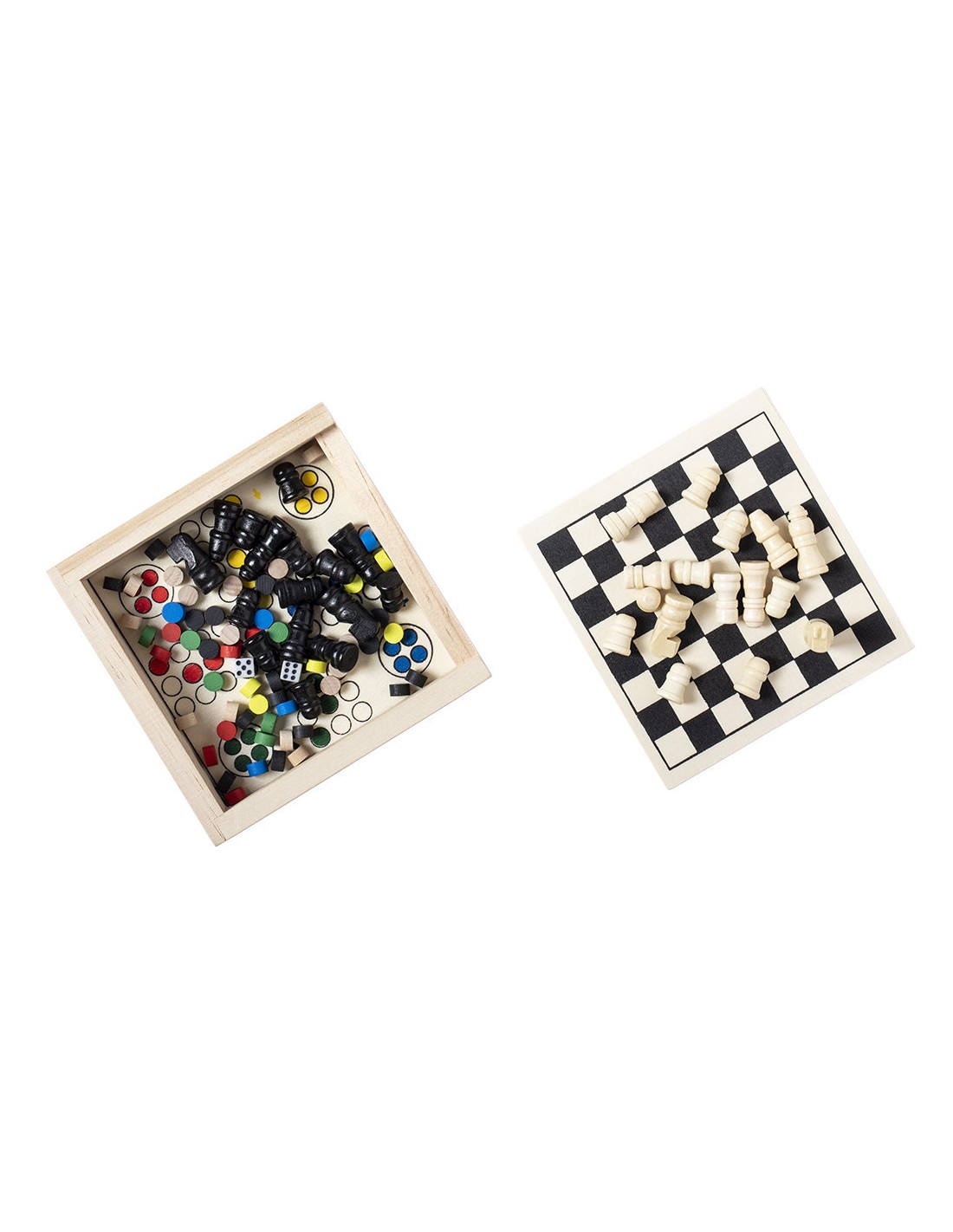 Set de juegos de línea nature. Incluye ajedrez, parchís y damas. Set presentado en estuche de madera con doble tablero de apertura deslizante.