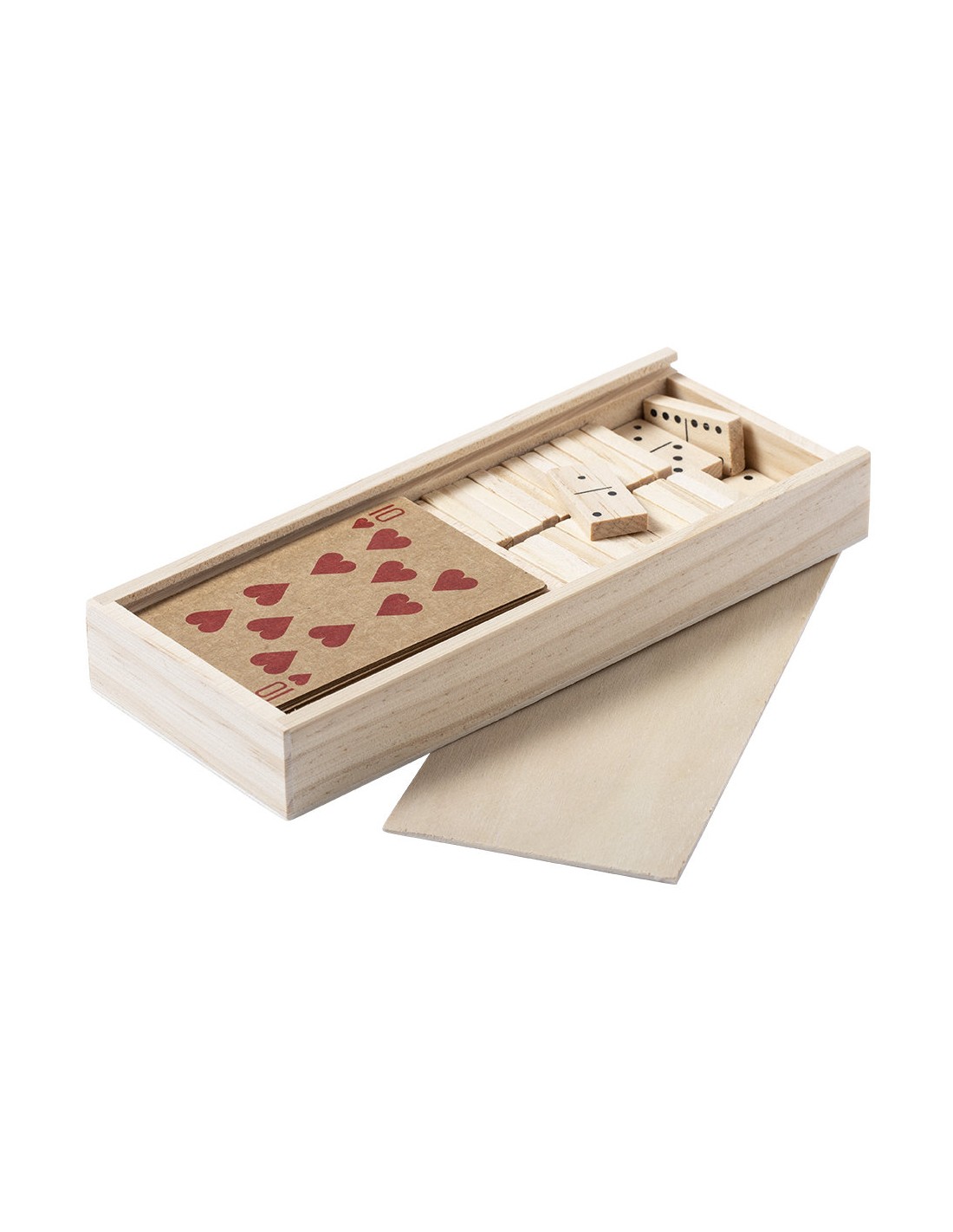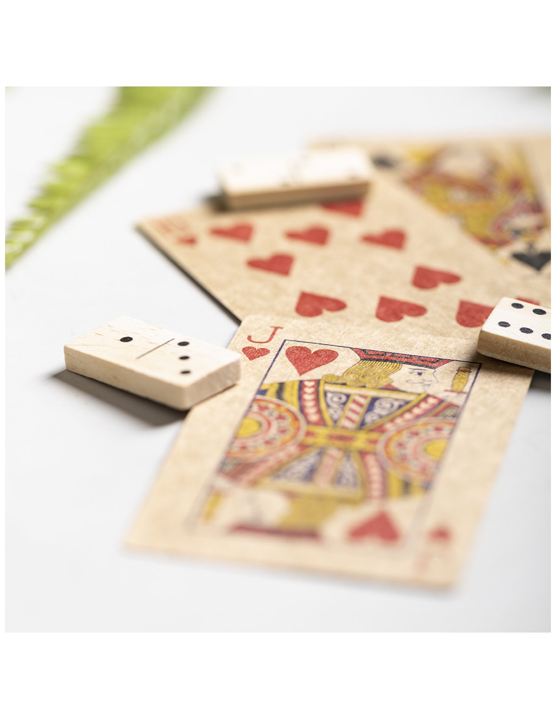 Set de juegos de línea nature. Incluye baraja de naipes francesa en cartón reciclado y dominó en madera. Set presentado en estuche de madera con compartimentos individuales para cada juego y tapa con apertura deslizante.