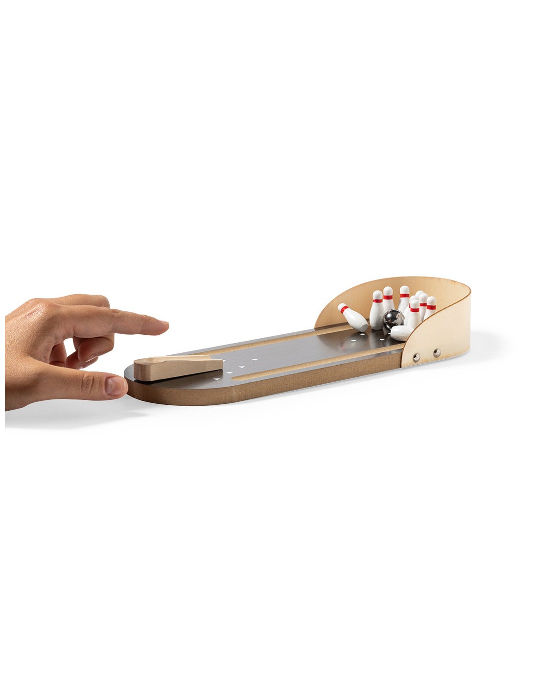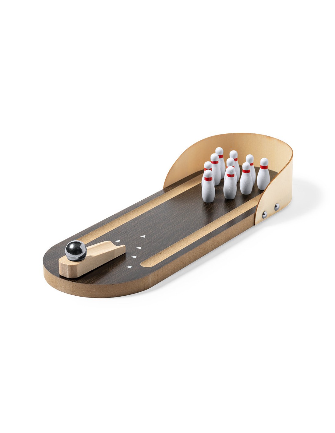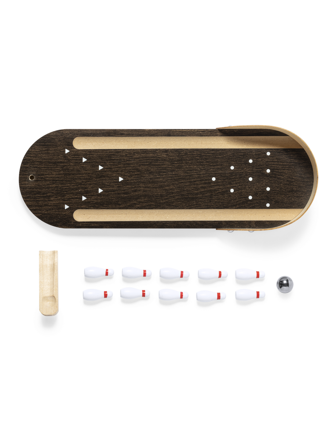 Minijuego de bolos, fabricado en resistente madera. Incluye 10 bolos y bola metálica, con rampa de lanzamiento orientable. Pon a prueba tu habilidad con este divertido y adictivo juego. Presentado en atractiva caja individual de diseño y con acabado kraft.