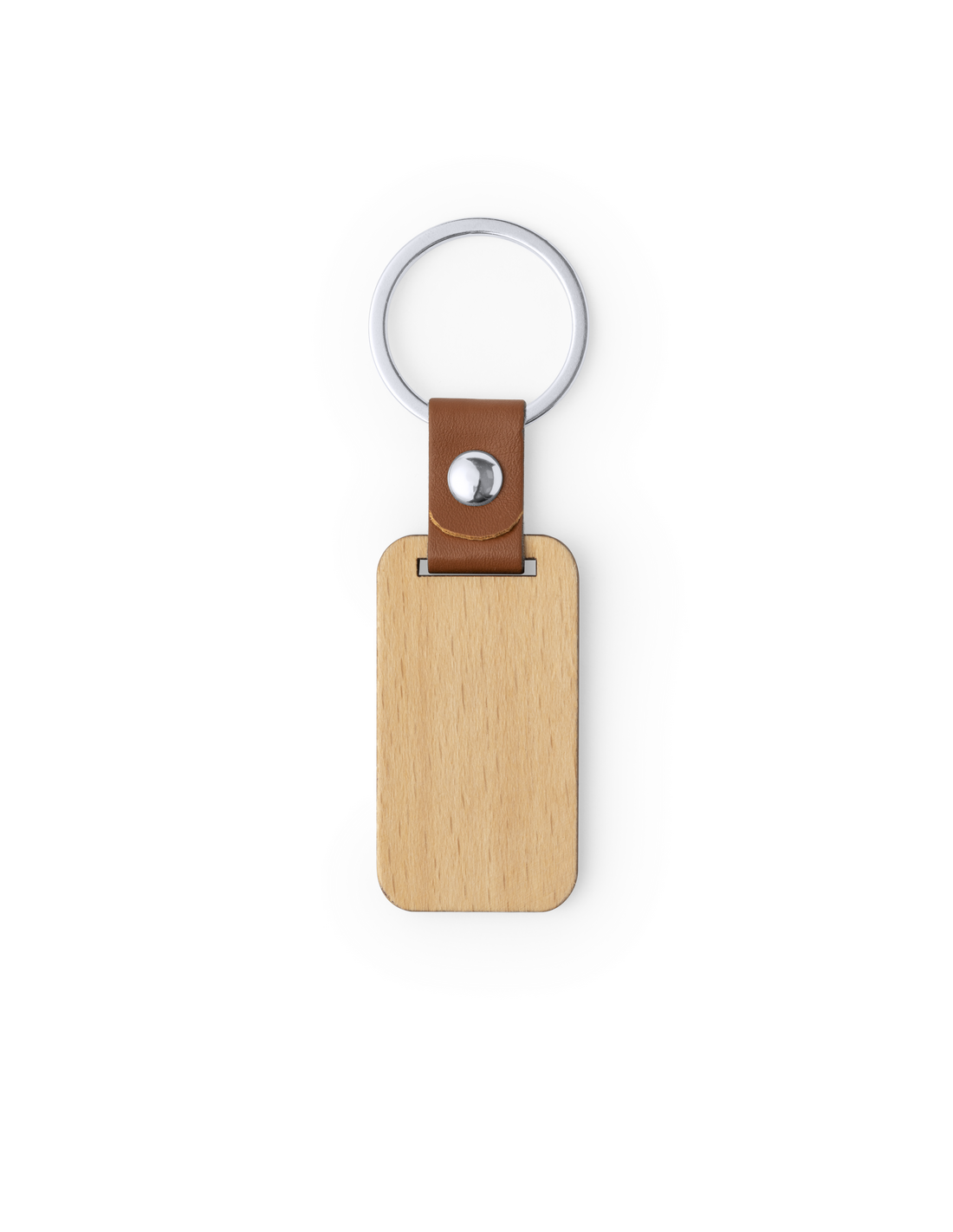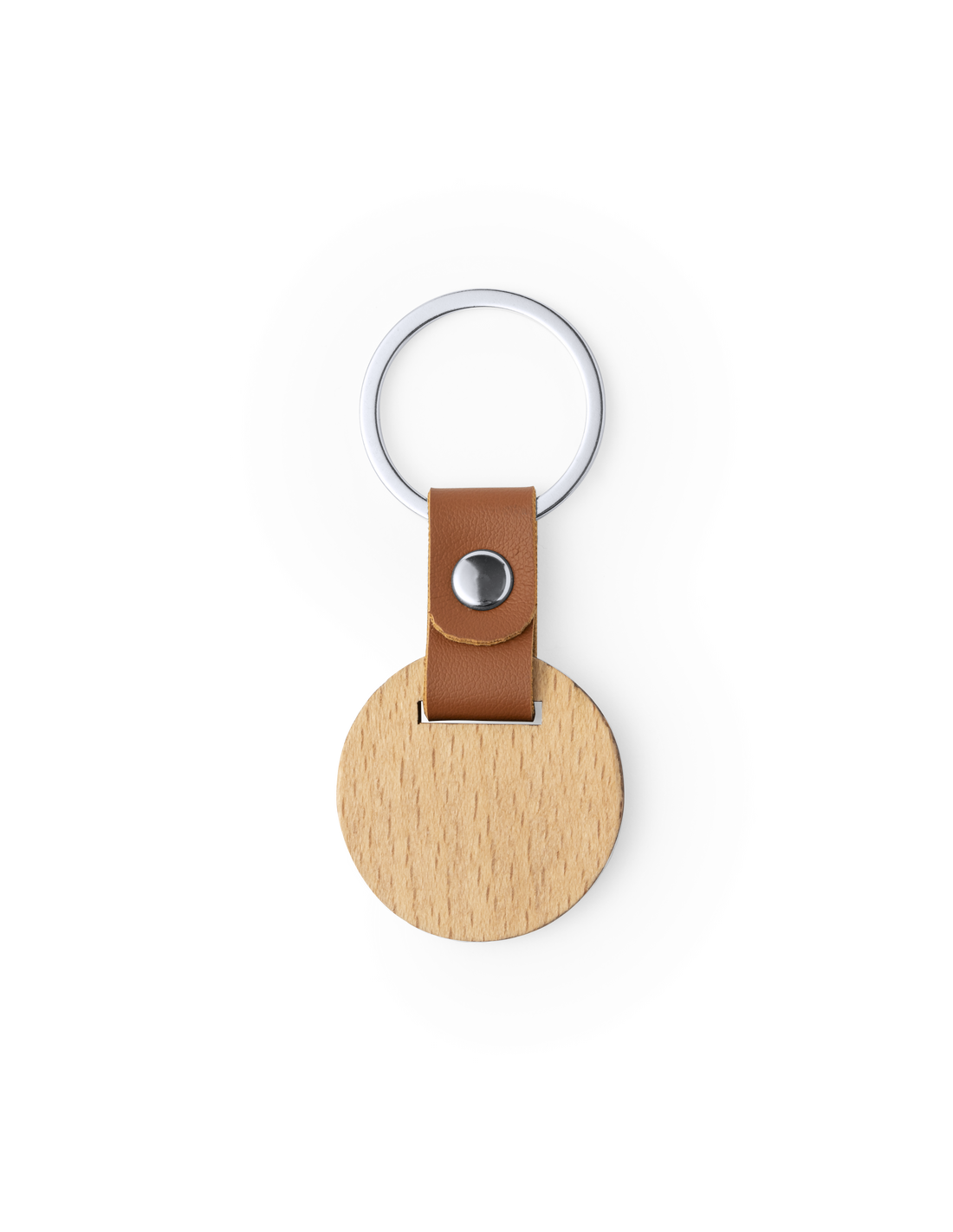Llavero de línea nature fabricado en madera natural, con original cinta en polipiel marrón y remache cromado. Disponible en diseños rectangular y circular.