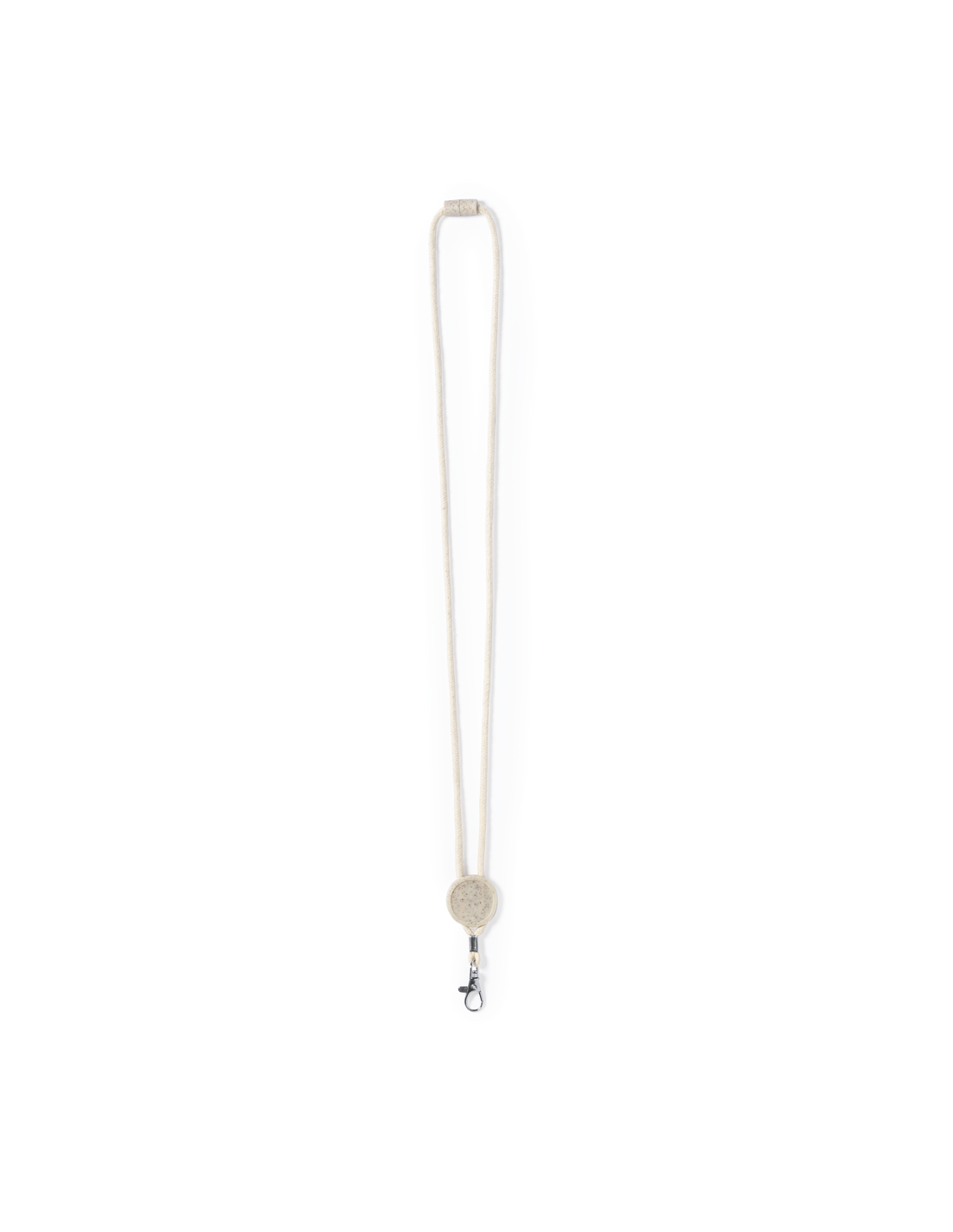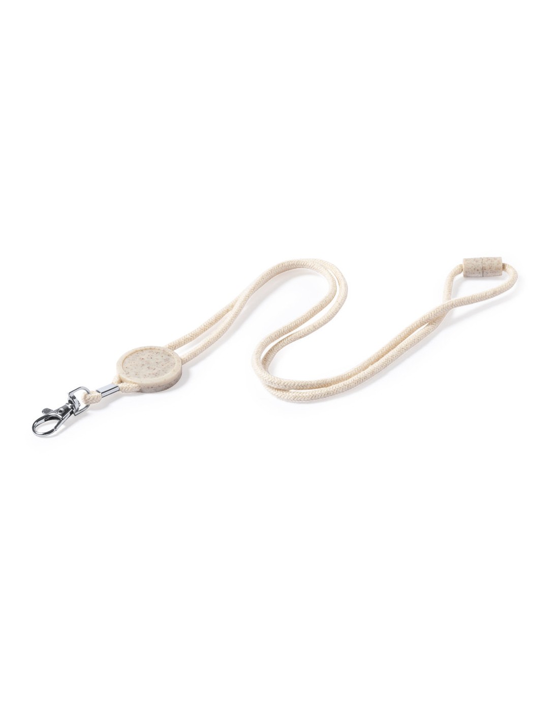 Lanyard de línea nature fabricado en resistente algodón 100%. Accesorio circular para personalización y cierre de seguridad en cuello fabricados en caña de trigo, con mosquetón metálico giratorio.La caña de trigo fomenta la utilización de materias primas naturales, reduciendo así las emisiones contaminantes.