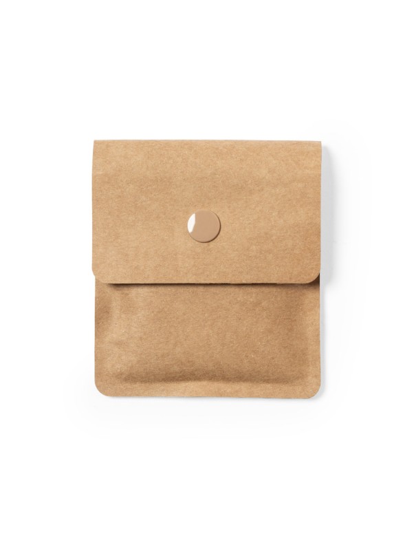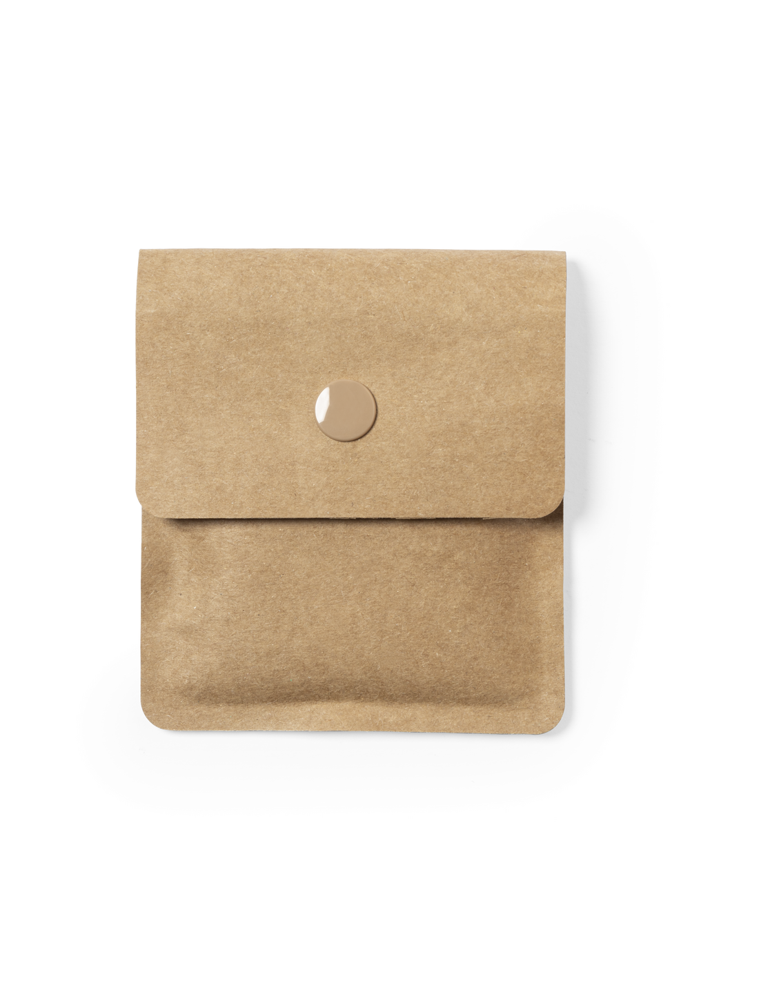 Cenicero de bolsillo de línea nature, con exterior en papel reciclado laminado e interior en aluminio ignífugo. Solapa con cierre de corchete a juego.