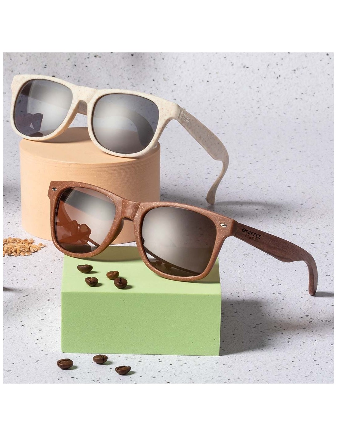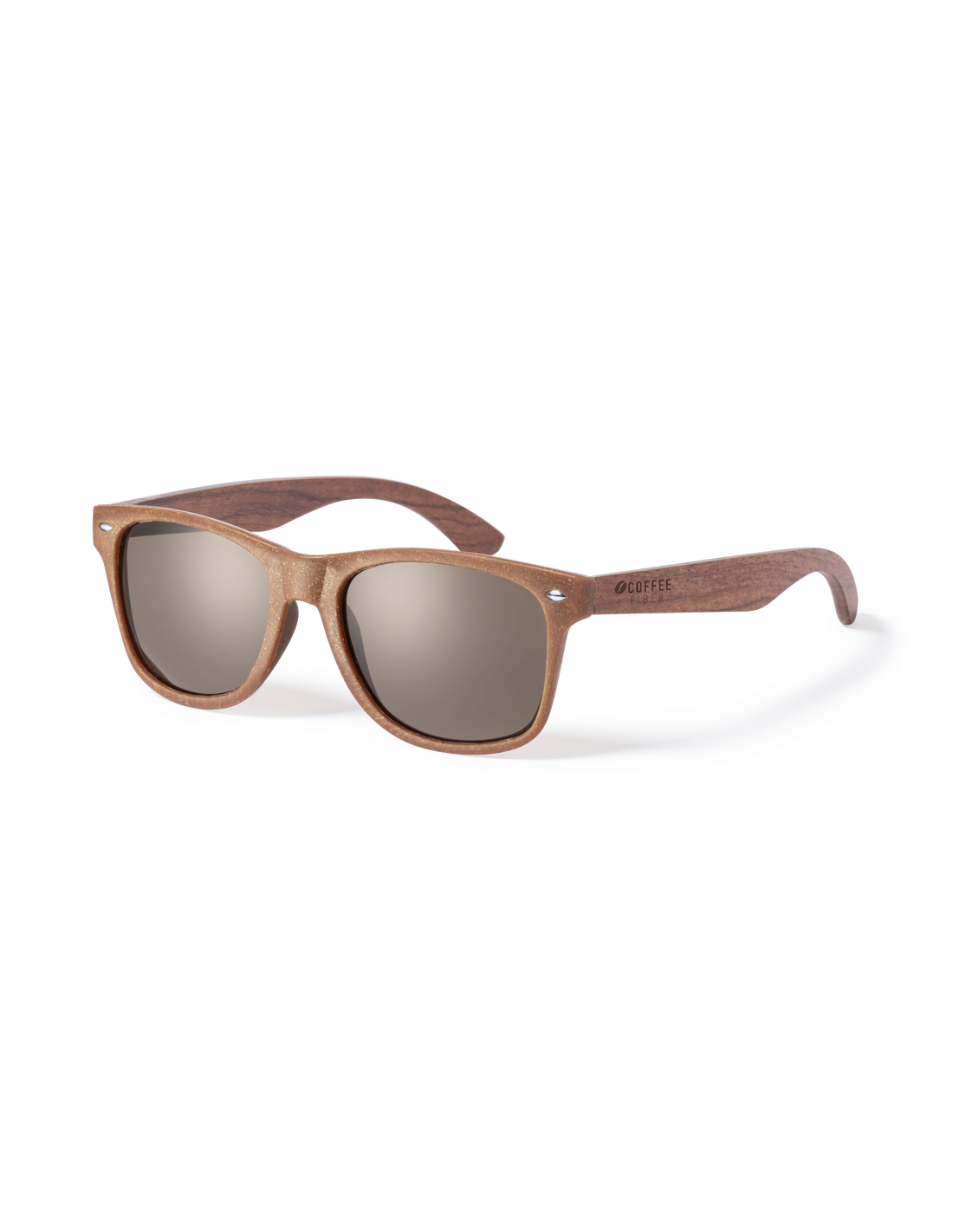 Gafas de sol de línea nature con protección UV 400. Montura fabricada en fibra de café y patillas en madera natural a juego, con lentes en tono marrón. Distintivo fibra de café inyectado en molde de patilla izquierda. Presentación en caja individual de diseño kraft.La fibra de café es una solución circular que se obtiene de la utilización de los residuos producidos en la obtención del café. Una alternativa sostenible que favorece la reducción del uso de plásticos, ahorrando energía en su proceso de fabricación y contribuyendo al cuidado del medio ambiente.