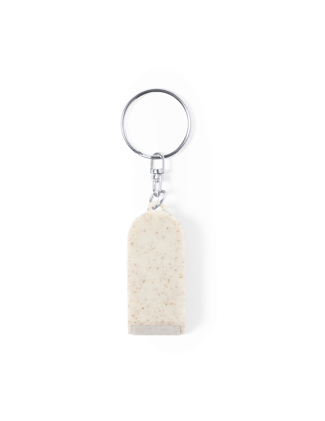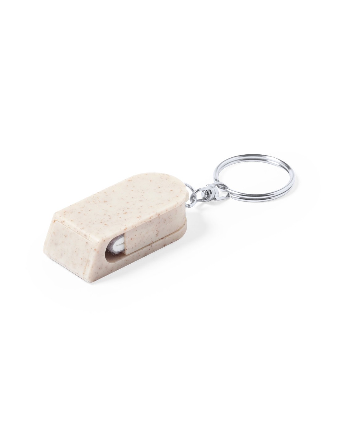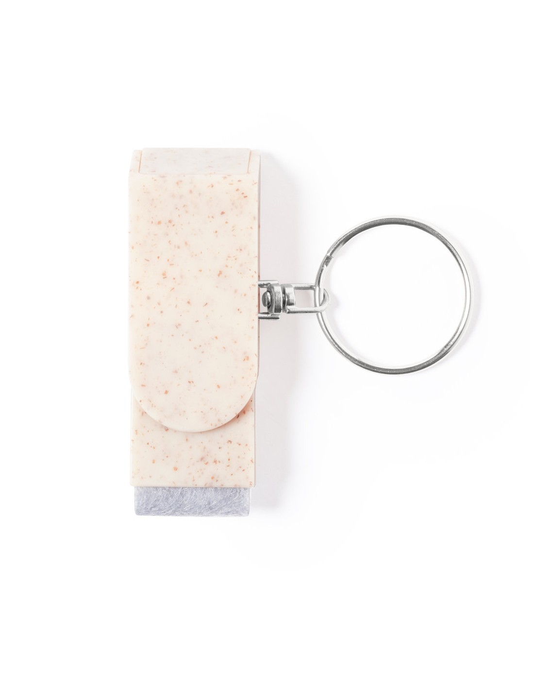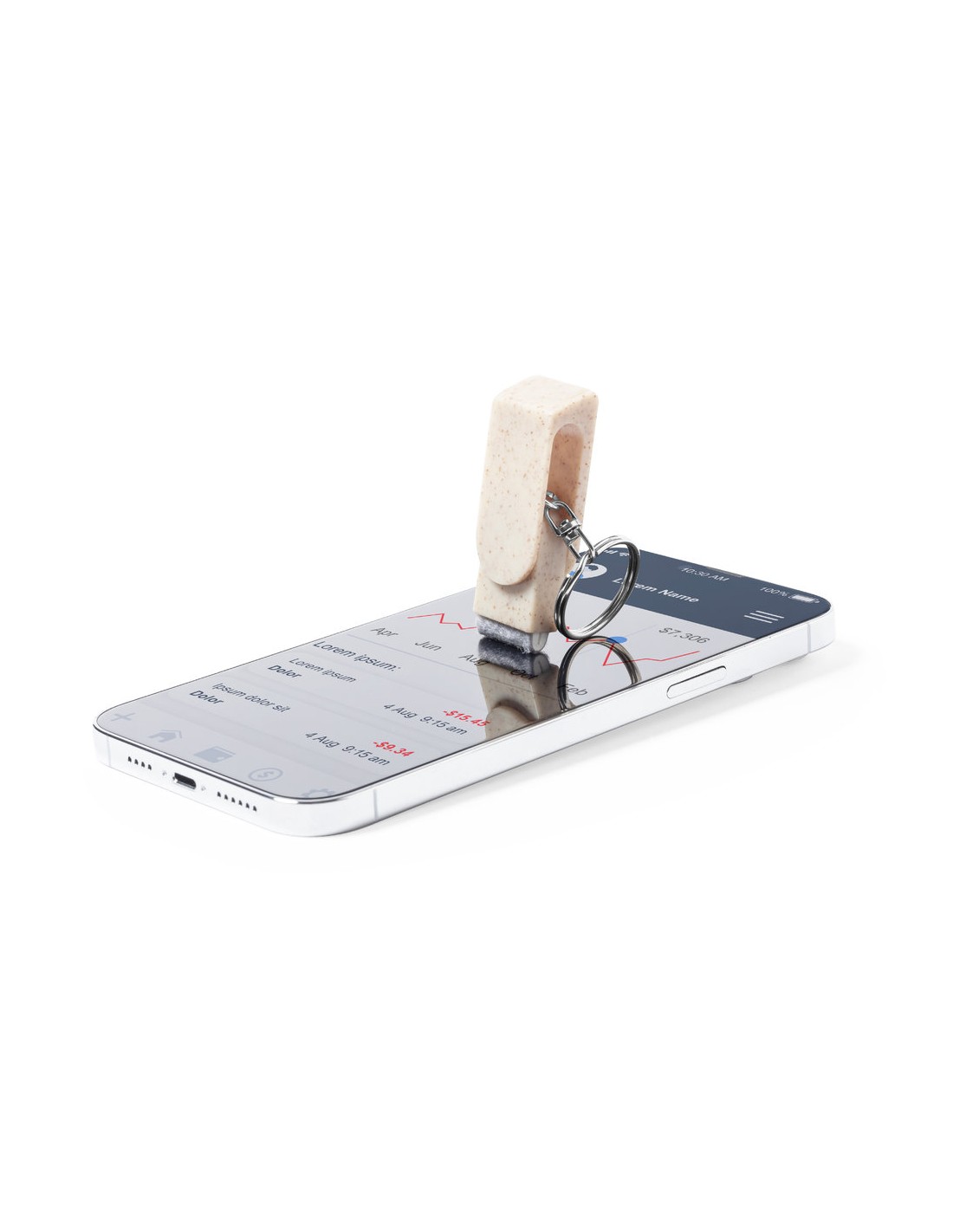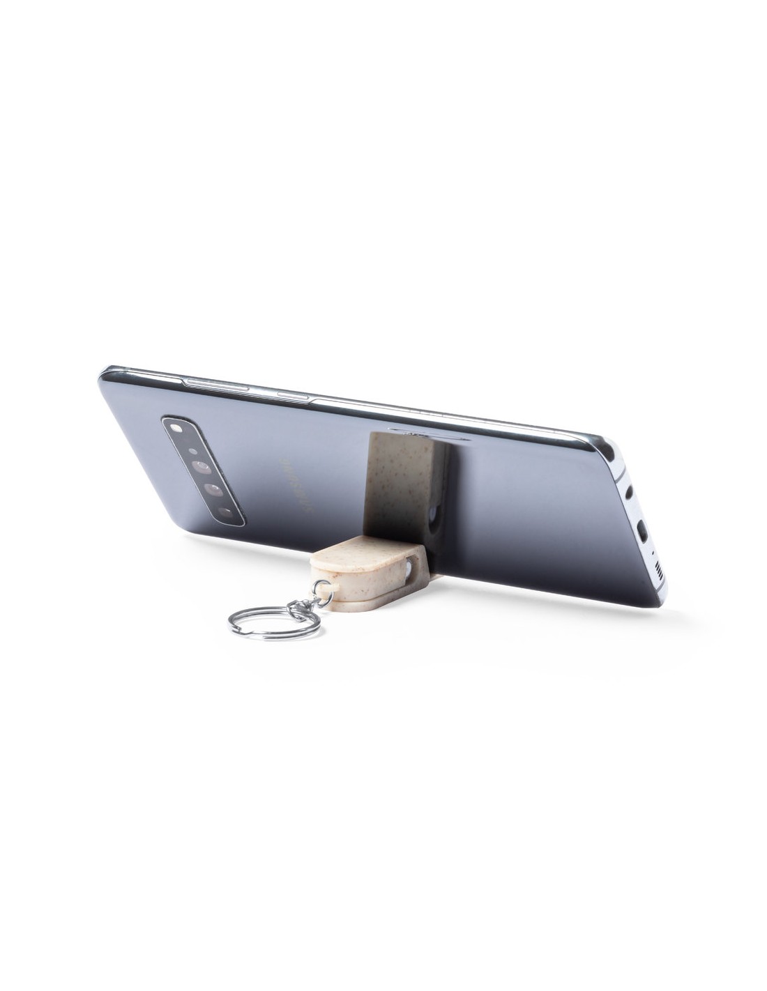 Llavero soporte para smartphone de línea nature, fabricado en caña de trigo. Con mecanismo giratorio y accesorio limpiapantallas incluido. Anilla metálica cromada.La caña de trigo fomenta la utilización de materias primas naturales, reduciendo así las emisiones contaminantes.
