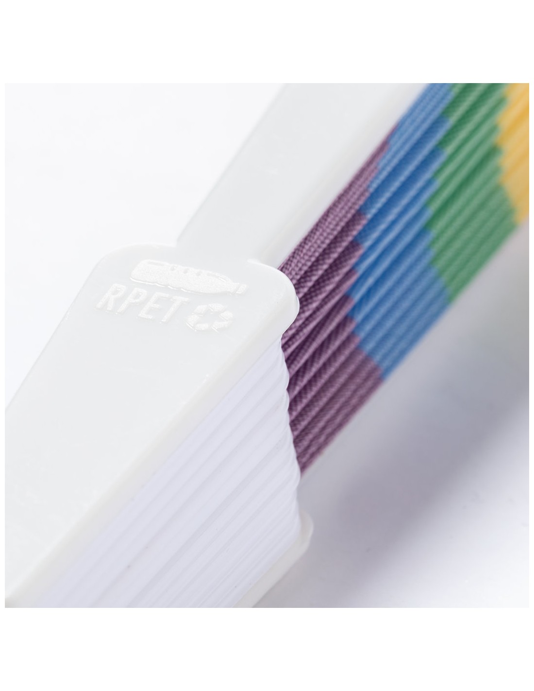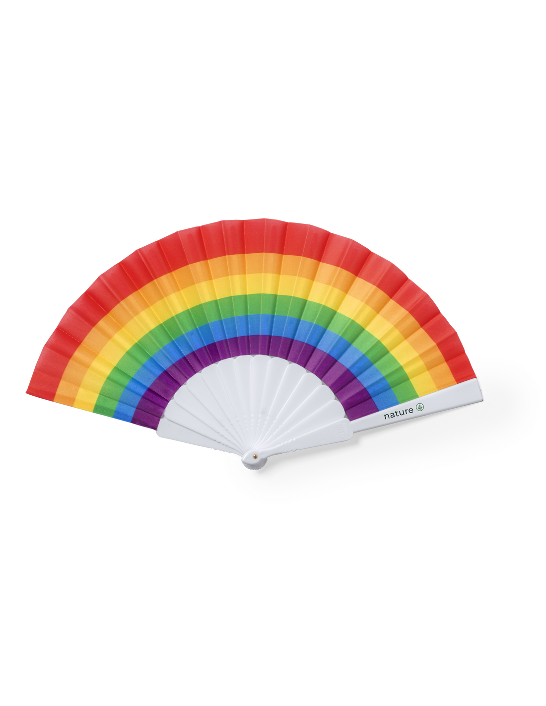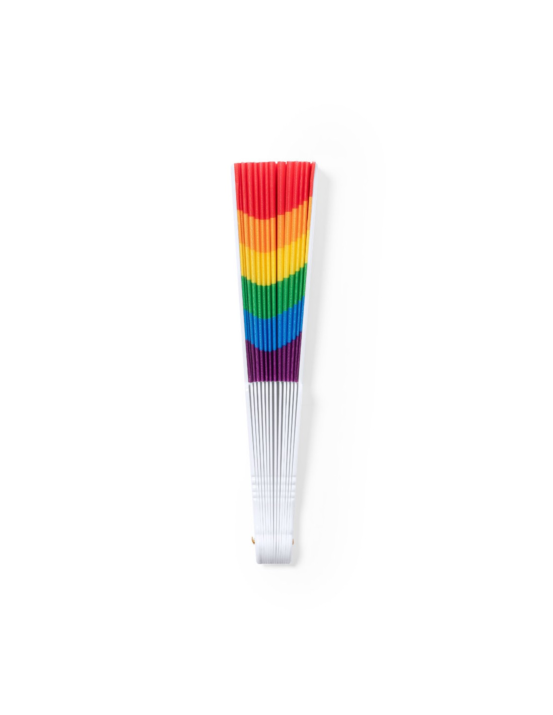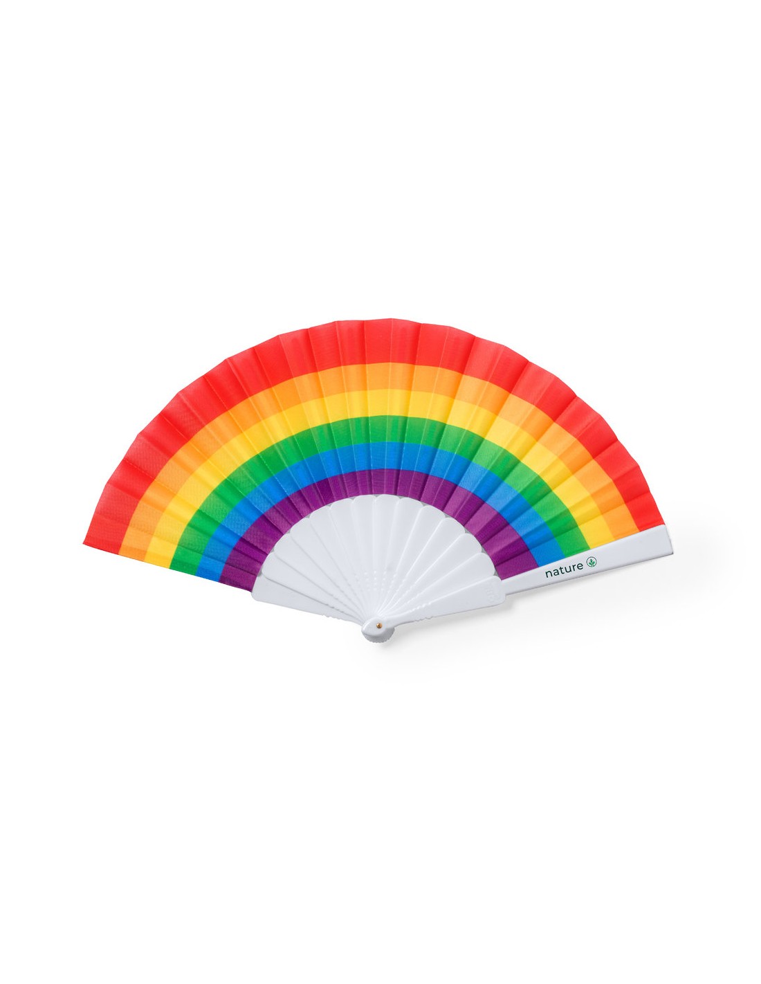Abanico Rainbow con tela multicolor y varillas blancas en RPET. Todo un orgullo de abanico, con distintivo RPET en varilla e inyectado en molde. Presentación en caja individual blanca con ventana. El material RPET se elabora a partir de plástico reciclado, para así fomentar la reutilización de residuos plásticos y ayudar a la sostenibilidad del planeta.