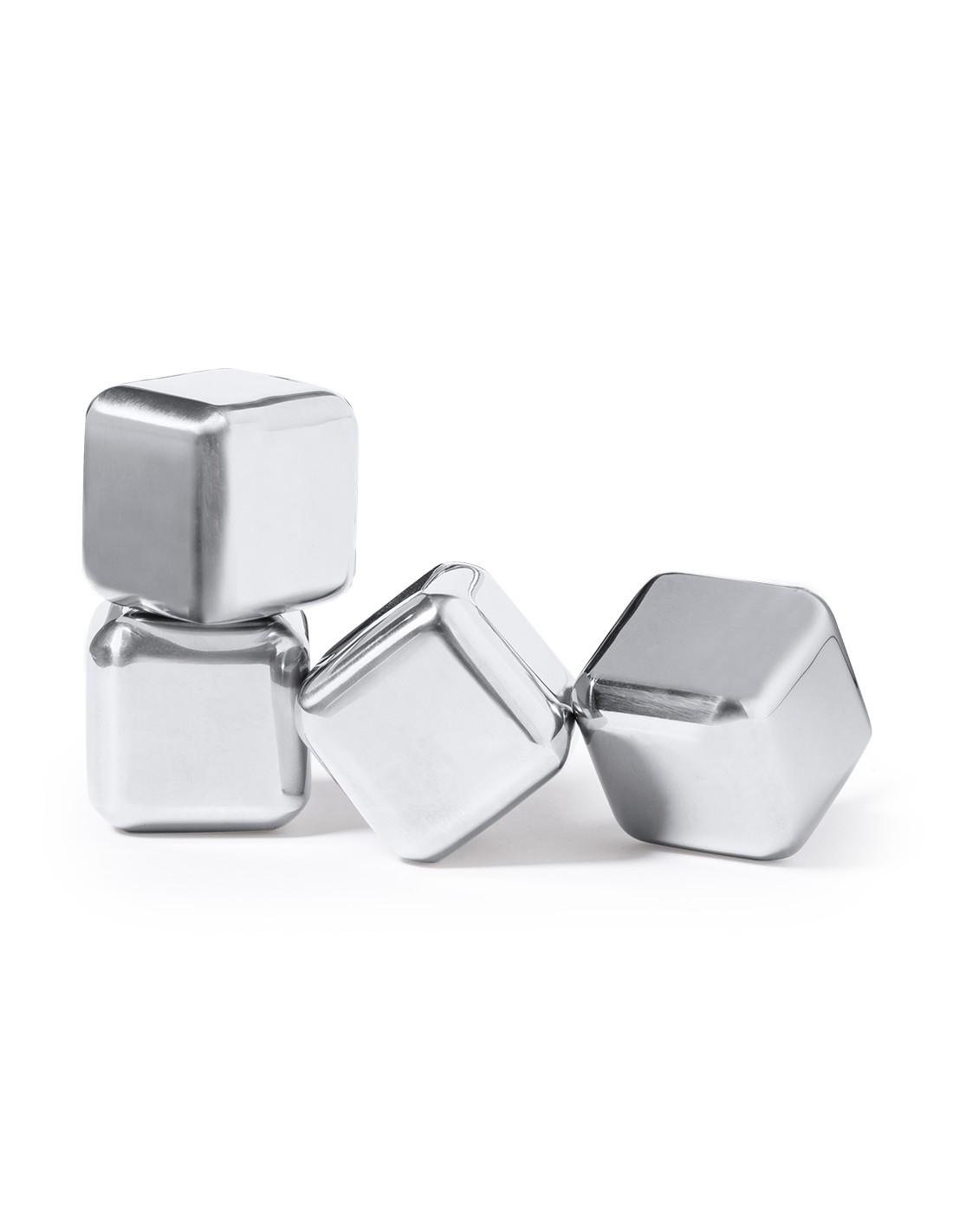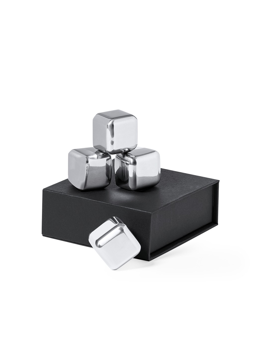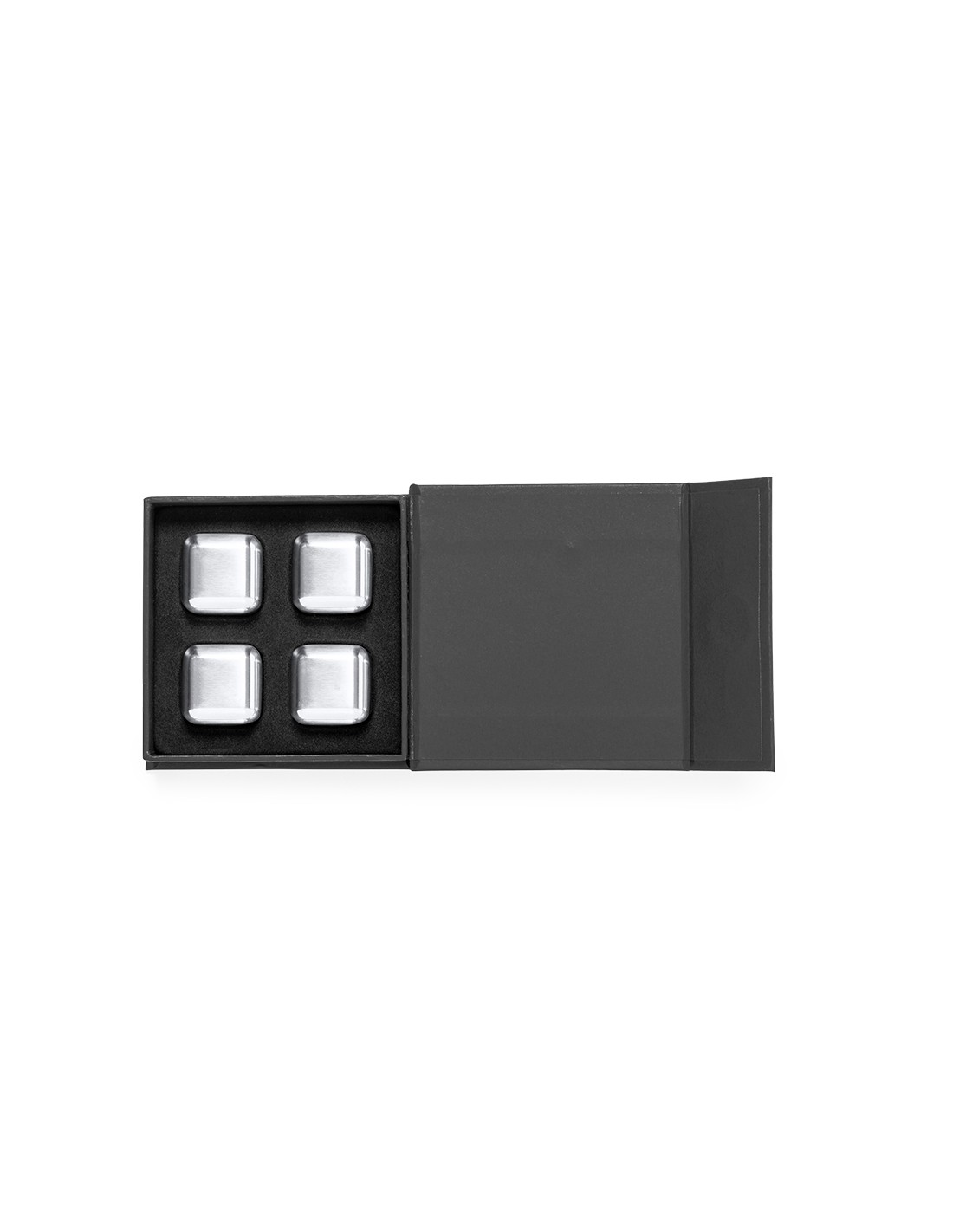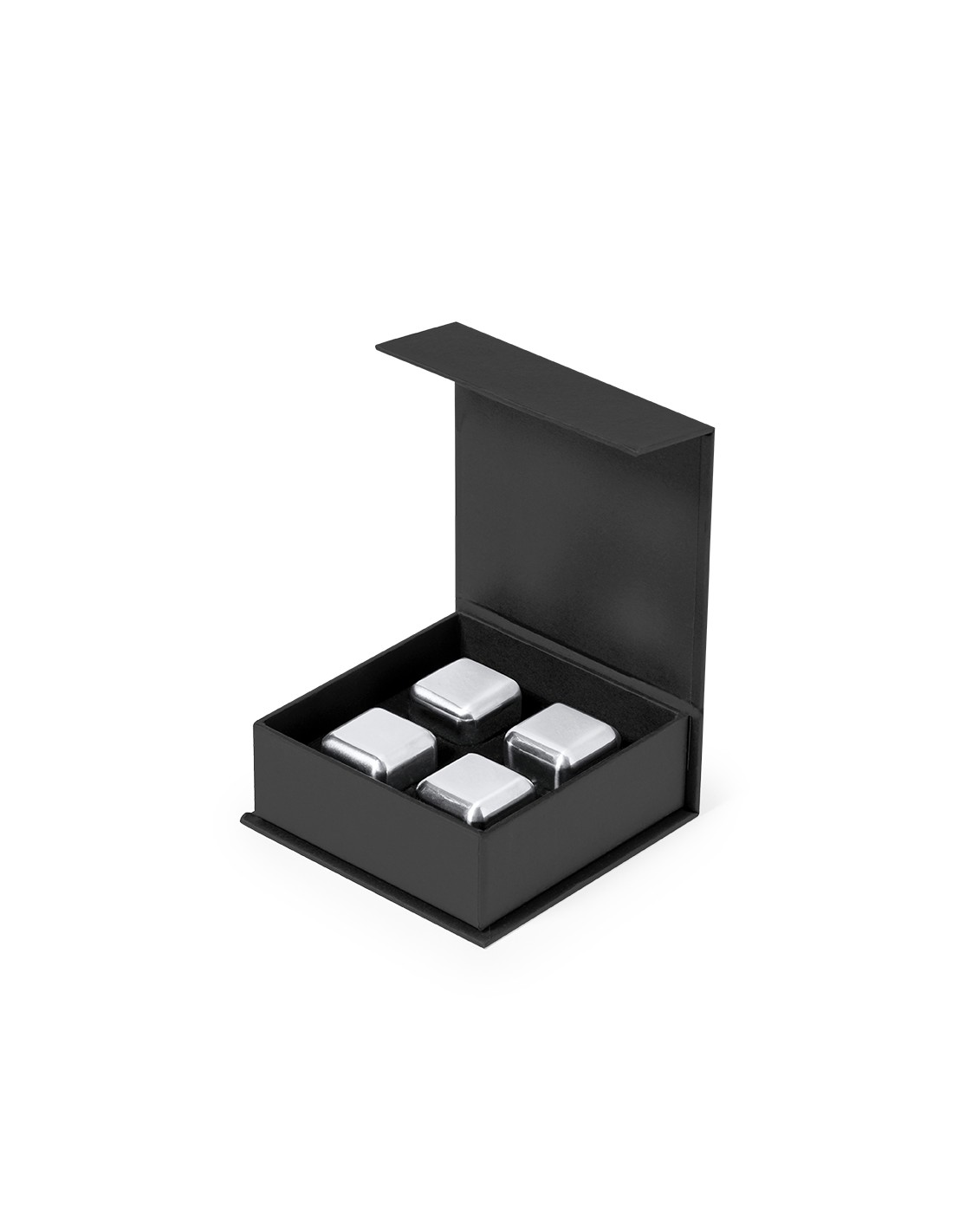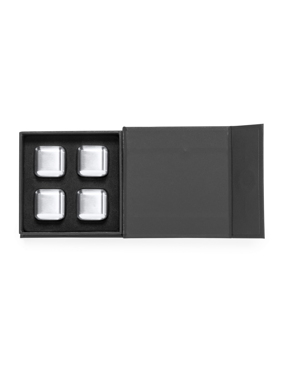 Set de 4 cubitos reutilizables. Fabricados en acero inoxidable, manteniendo la bebida fría sin alterar sus propiedades al no diluir su contenido en agua, además de mantener el sabor original de la misma. Presentados en elegante estuche color negro con interior troquelado.