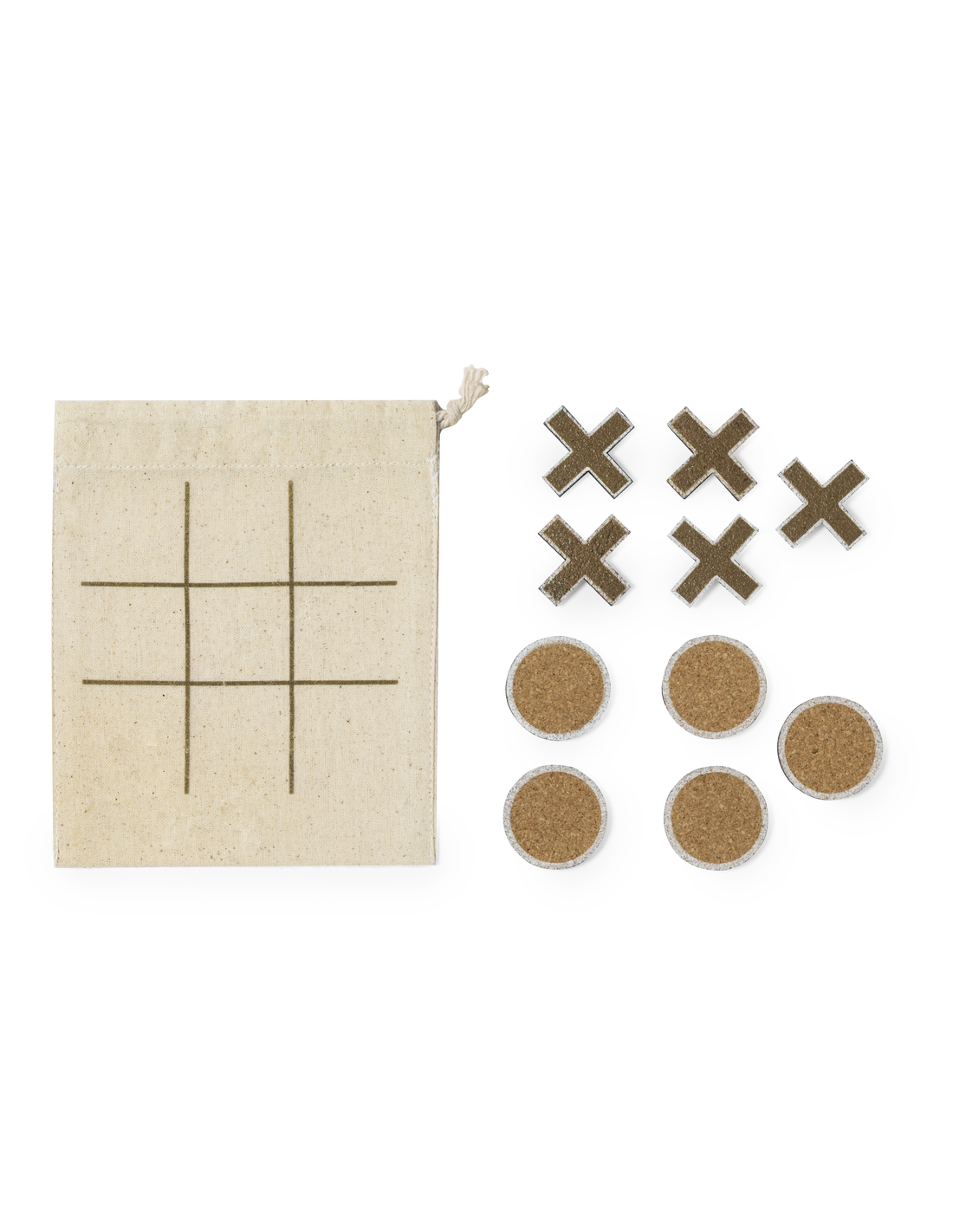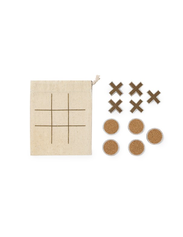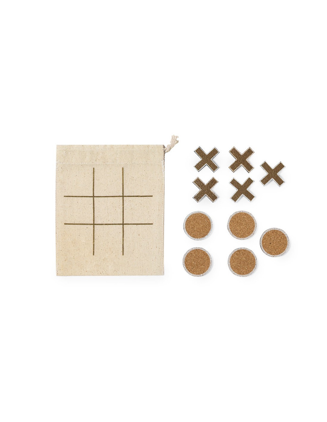 Juego tres en raya fabricado en corcho natural. Incluidas 5 fichas circulares y 5 fichas en cruz. Presentado en bolsa de algodón con cierre de cordón que sirve como tablero para jugar.
