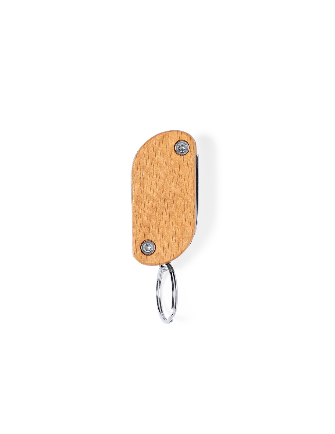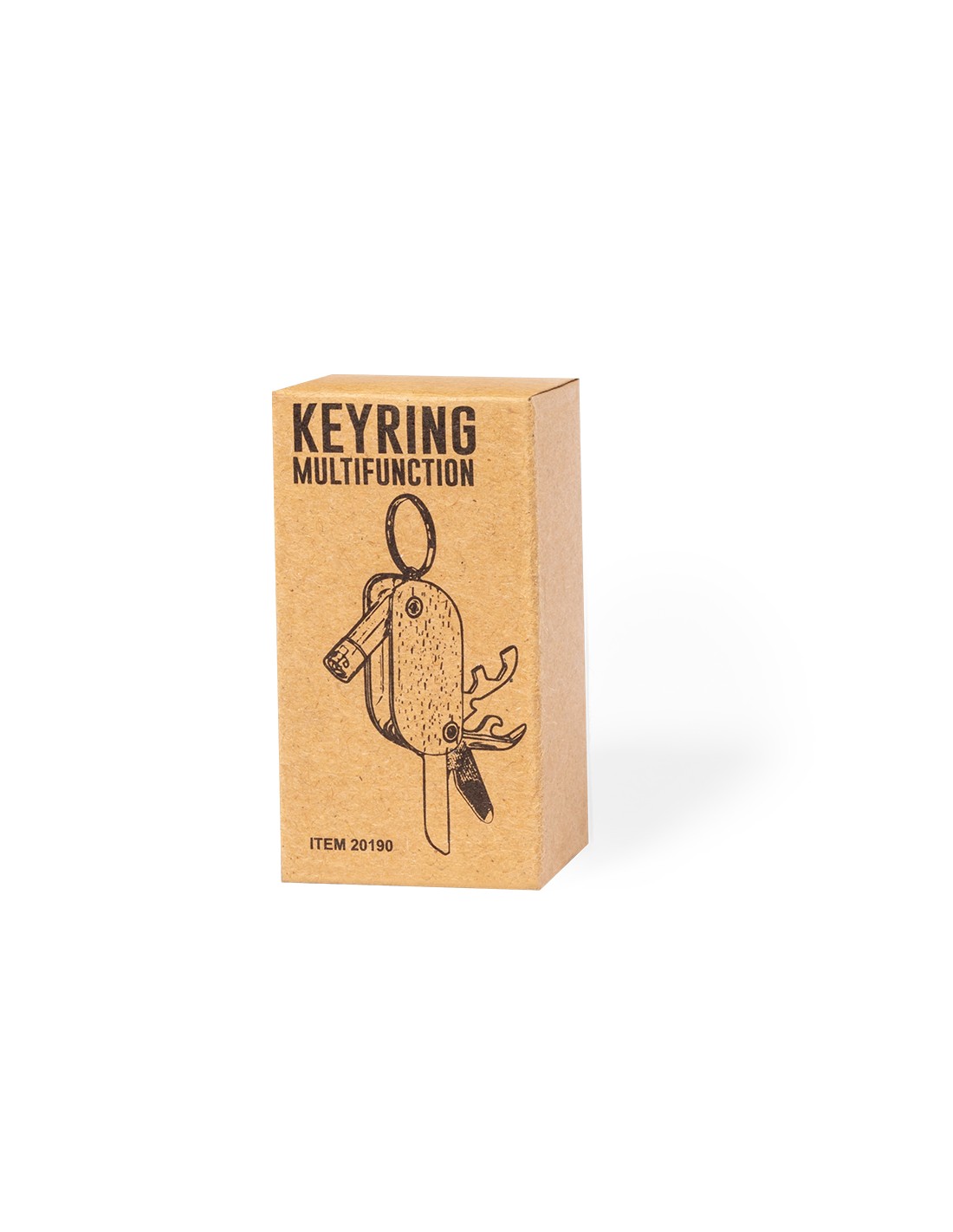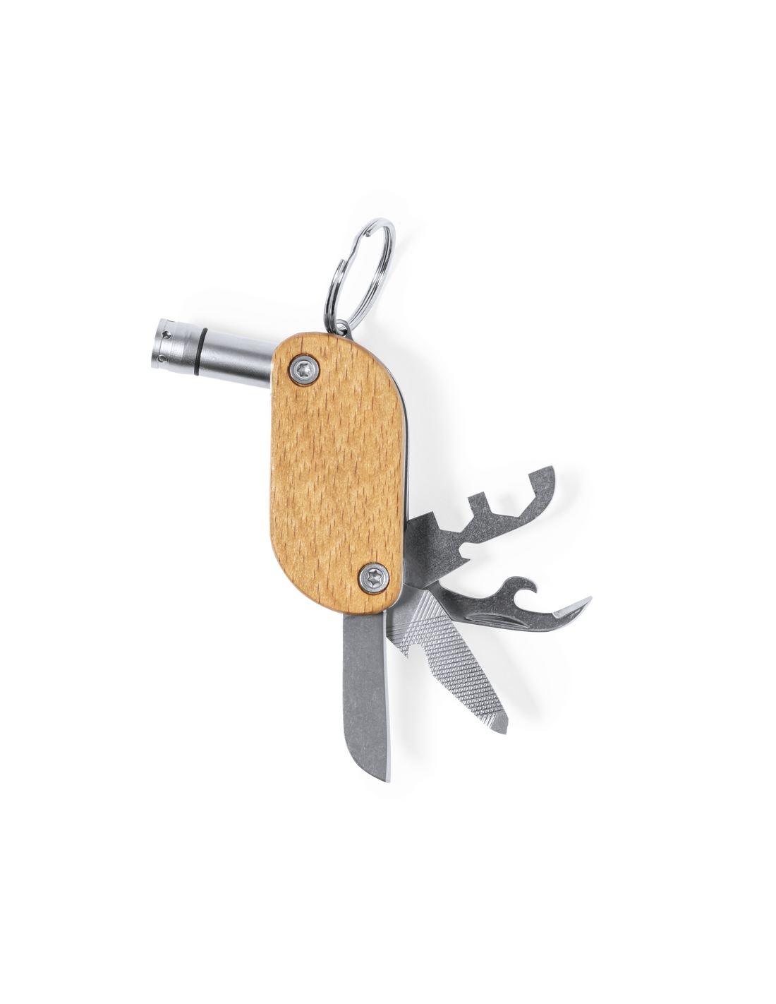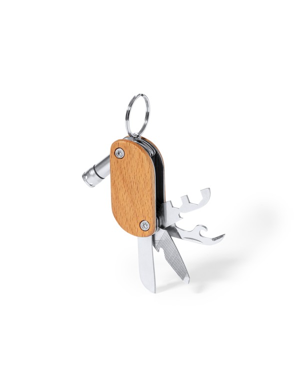 Práctico llavero multiherramienta fabricado en resistente acero inox y madera. Con 9 funciones: destornillador, abrebotellas, cuchillo, abrelatas, lima, distintas llaves y linterna de un led. Alimentación a pilas (3 pilas de botón incluidas) y presentado en caja individual de diseño kraft.