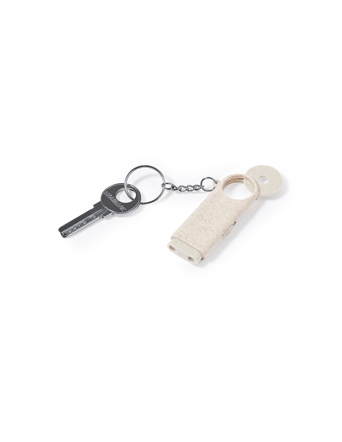 Llavero moneda con linterna integrada, fabricado en caña de trigo y ABS. Con práctica moneda, 2 LEDs y alimentación a pilas (de botón incluidas). Con distintivo Wheat Straw y presentado en bolsa individual reciclada.Elaborado con elementos vegetales para así fomentar la utilización de materias primas naturales y reducir las emisiones contaminantes.