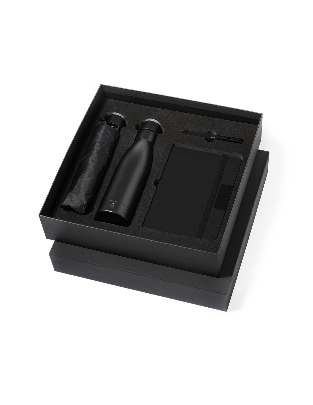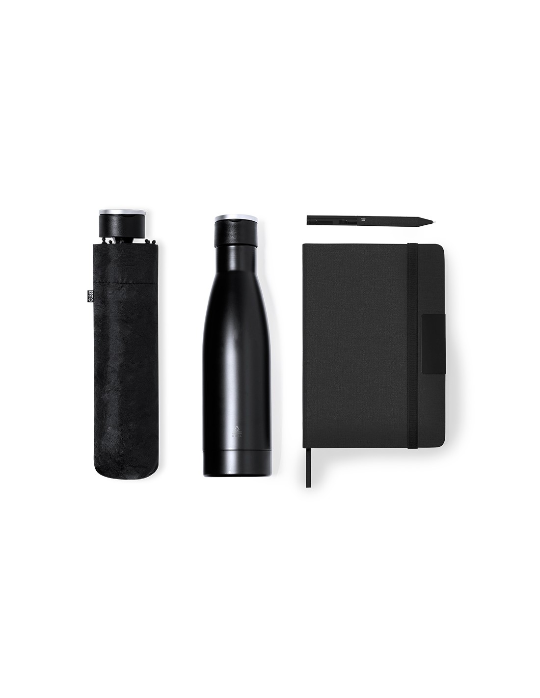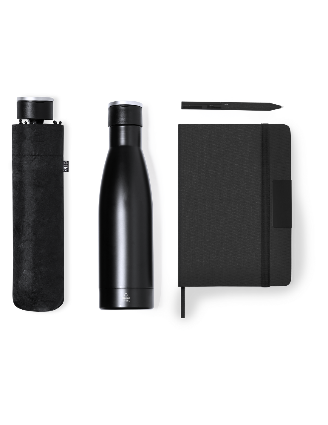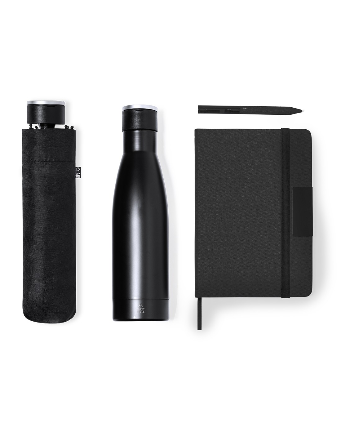 Elegante set premium que incluye:Termo de doble capa en acero inoxidable reciclado de acabado negro mate y de 500 ml de capacidad, con asa rígida de metal color plata mate. Con distintivo acero inoxidableBloc de notas en RPET en elegante color negro, con detalle metálico especial para marcaje en láser. Incluye cierre elástico y marcapáginas de tela. Interior con 80 hojas de disposición a una raya. Con distintivo RPETParaguas plegable de color negro con 98cm de diámetro. En material pongee 190T RPET. De apertura manual, con sistema anti viento y varillas fibra de vidrio. Con funda de transporte y cintas a juego. Con etiqueta distintiva RPET.Bolígrafo en RPET de acabado negro mate, de mecanismo giratorio y tinta azul. El material RPET se elabora a partir de plástico reciclado, para así fomentar la reutilización de residuos plásticos y ayudar a la sostenibilidad del planeta. Set presentado en estuche individual de acabado mate, con troquelado interior para cada uno de los elementos del set.