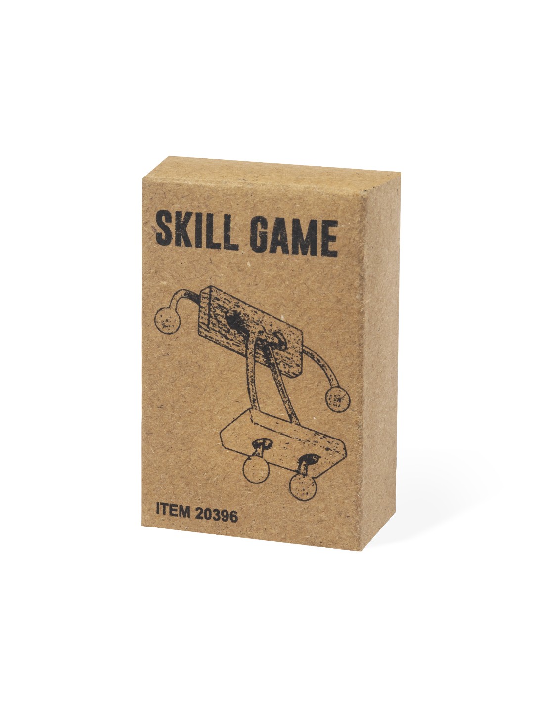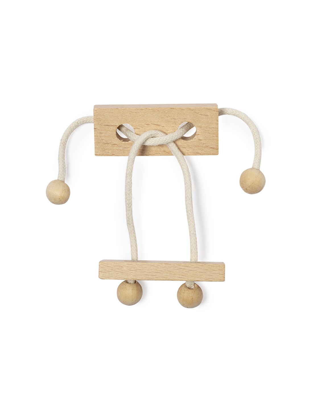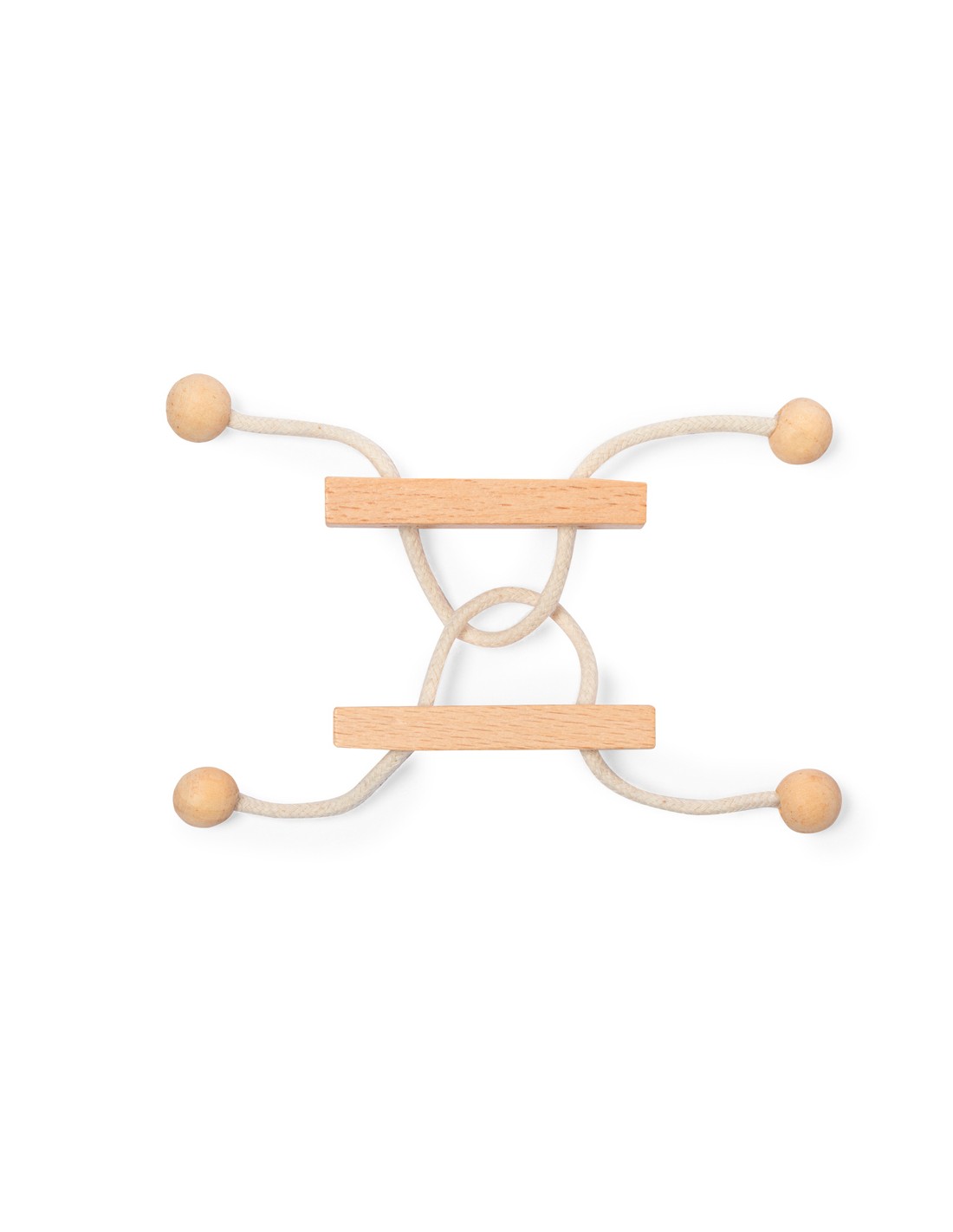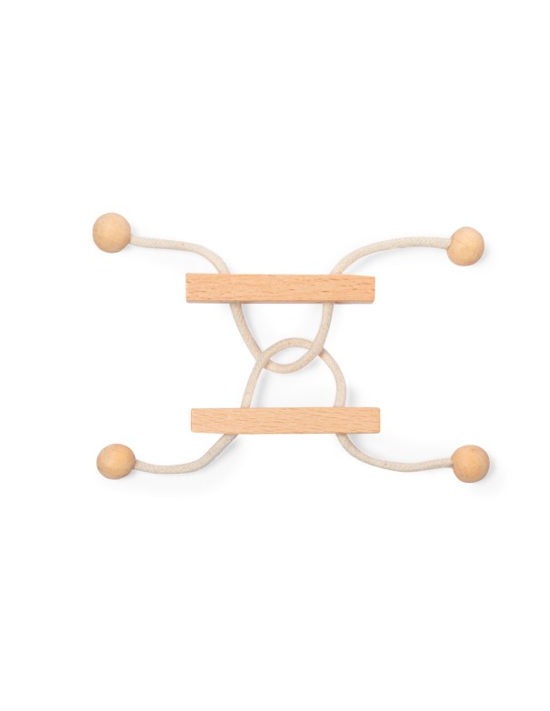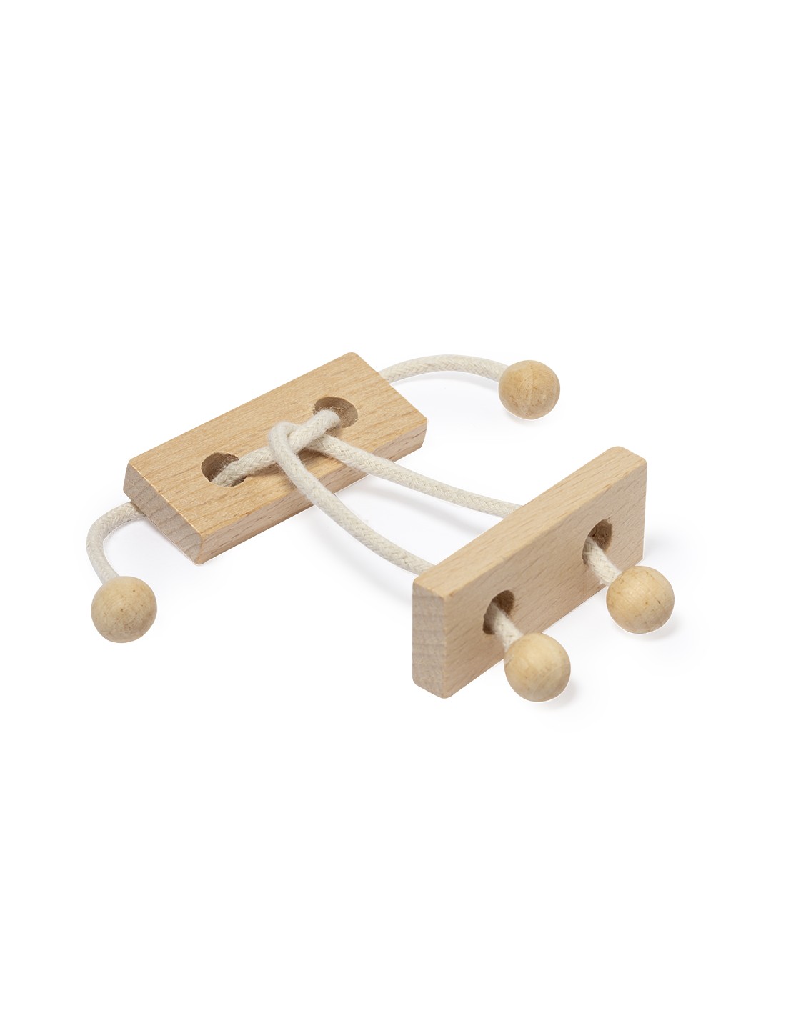 Juego de habilidad de 2 piezas fabricado en madera. Divertido rompecabezas de dos piezas unidas por un cordón de madera, cuyo objetivo es descubrir la forma de separar ambas piezas. Presentado individualmente en una caja de diseño kraft.