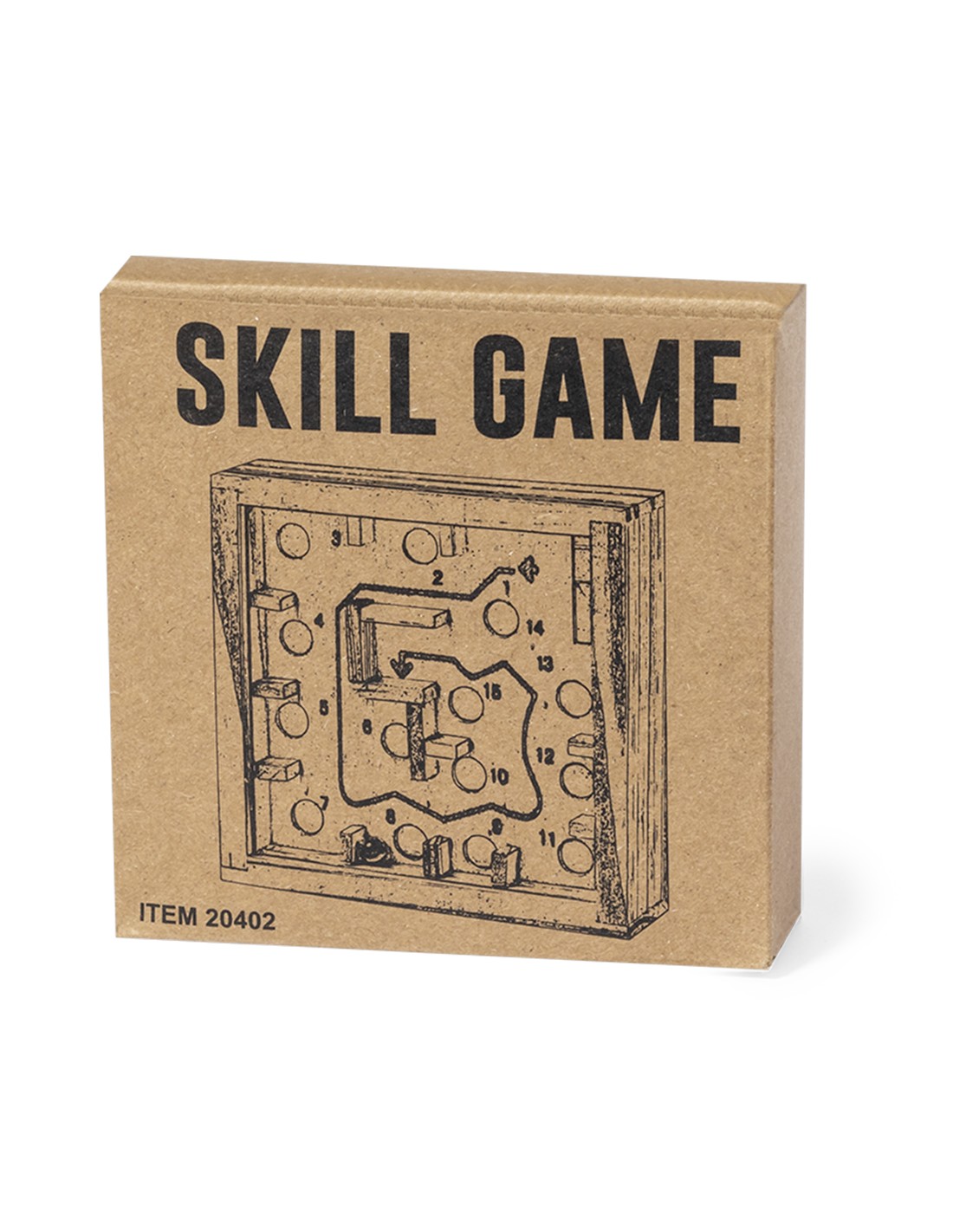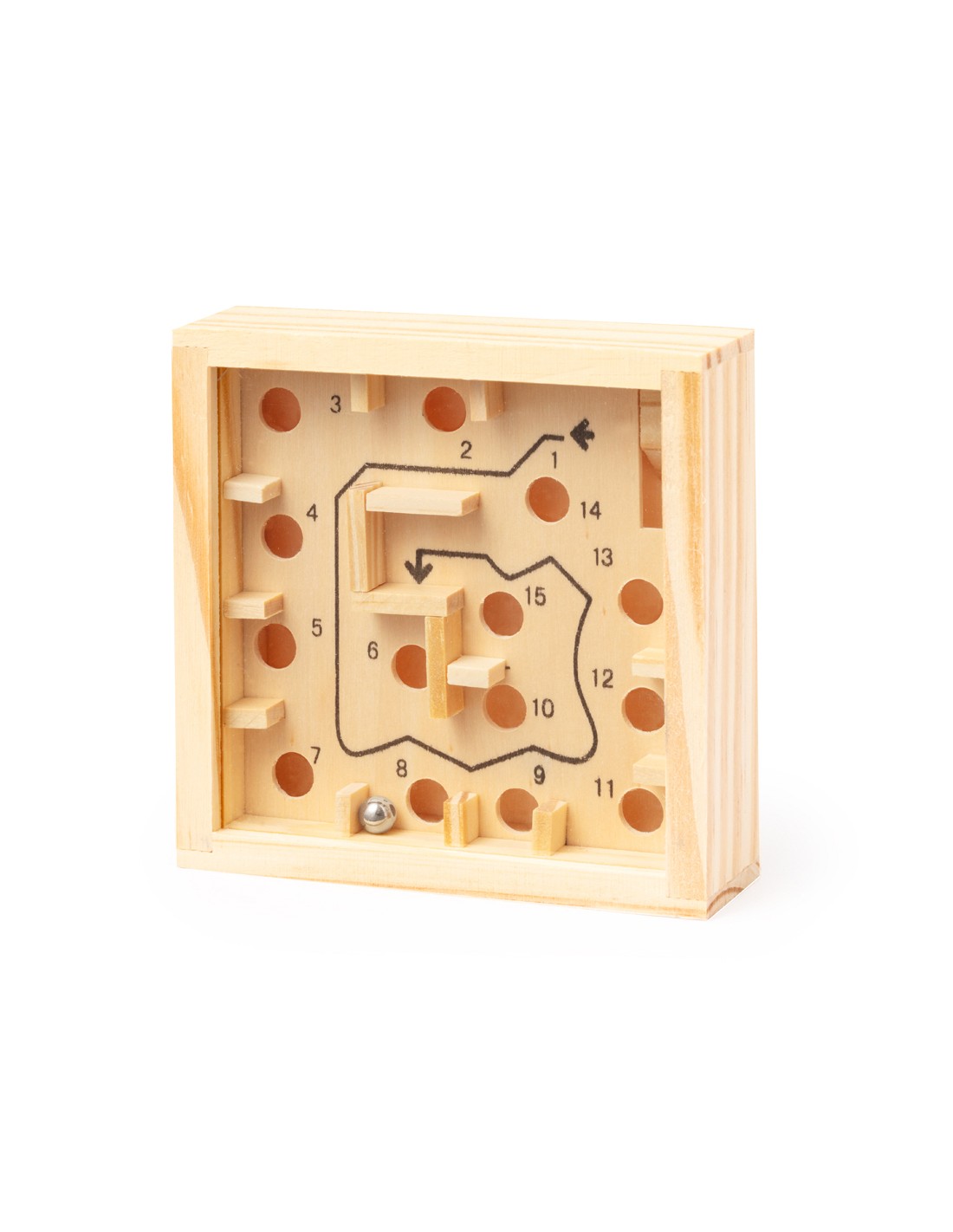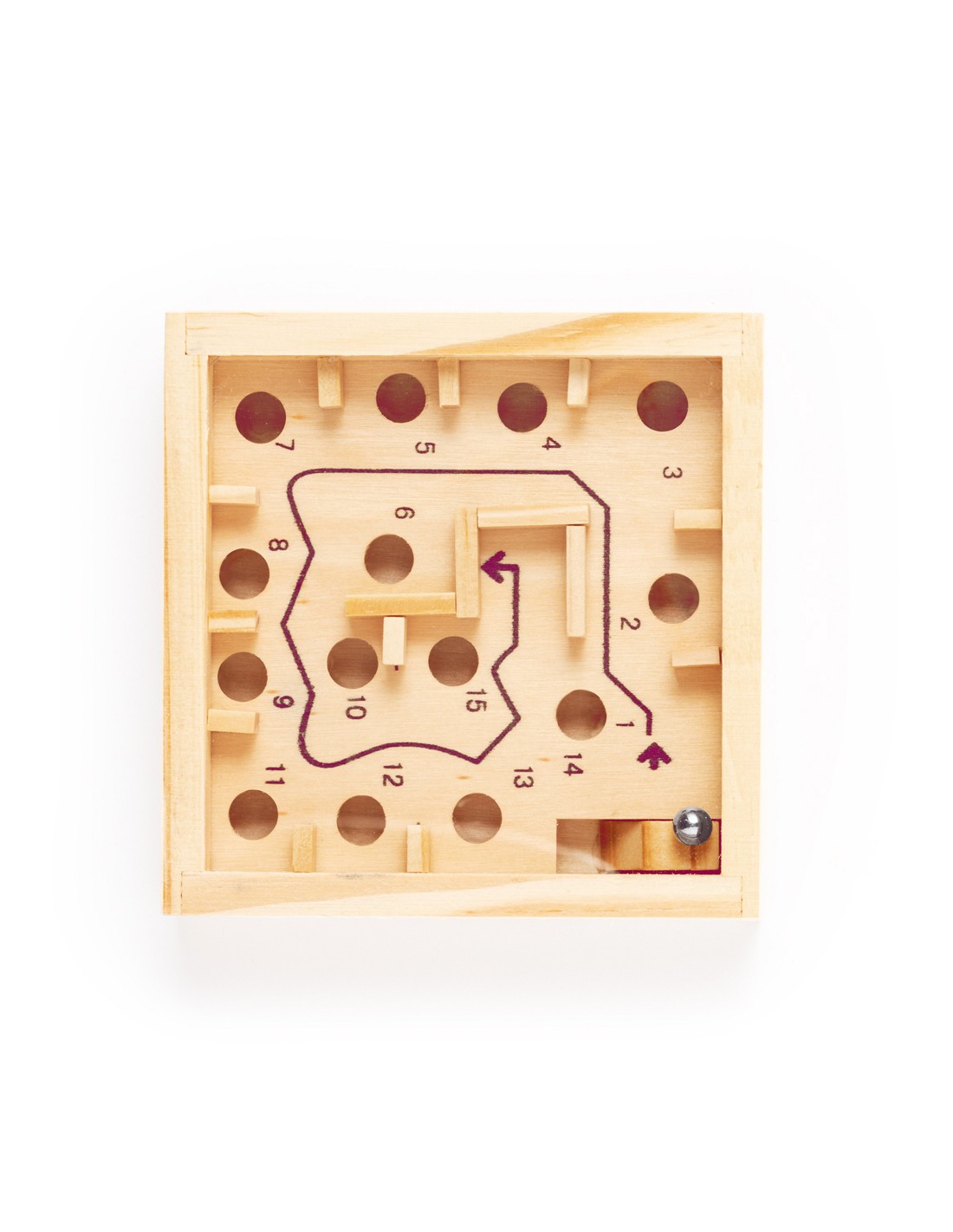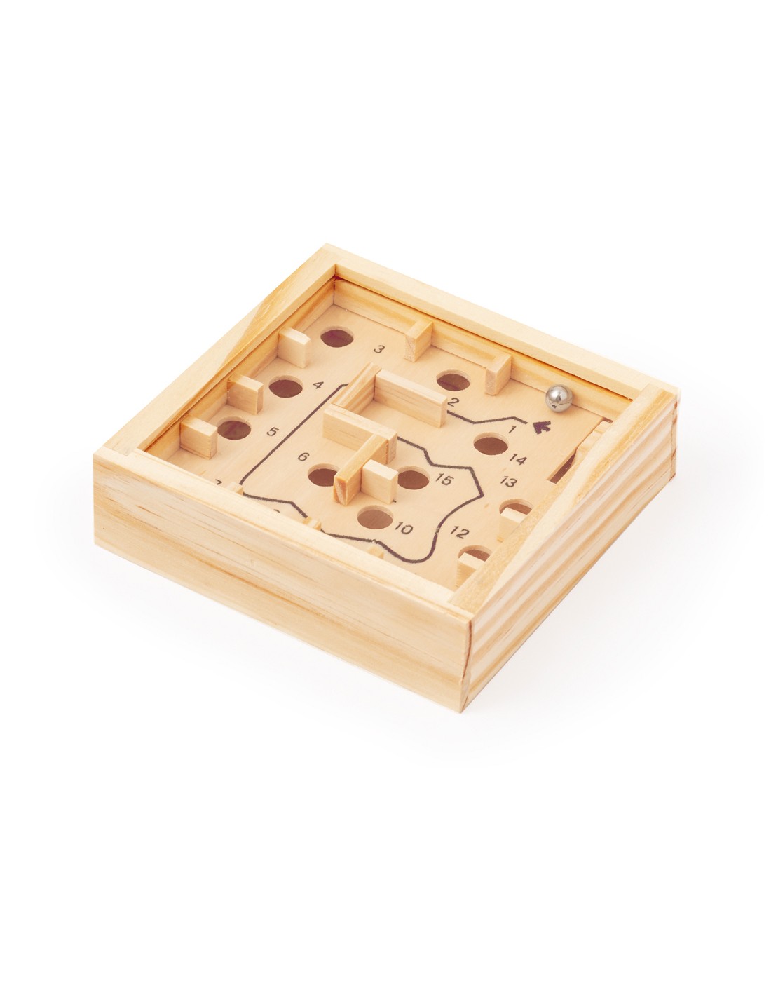 Divertido juego de habilidad fabricado en madera y cuyo objetivo es superar un desafiante laberinto con 15 obstáculos, evitando que la bola metálica interior caiga en los agujeros. Presentado individualmente caja de diseño kraft.