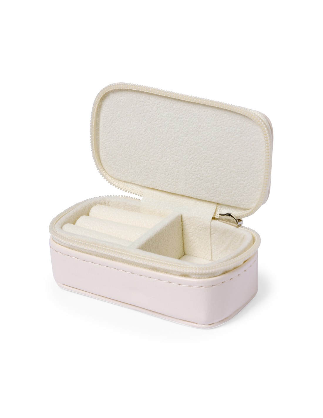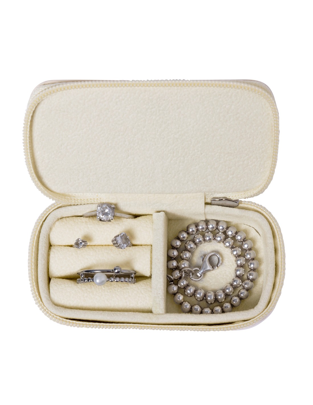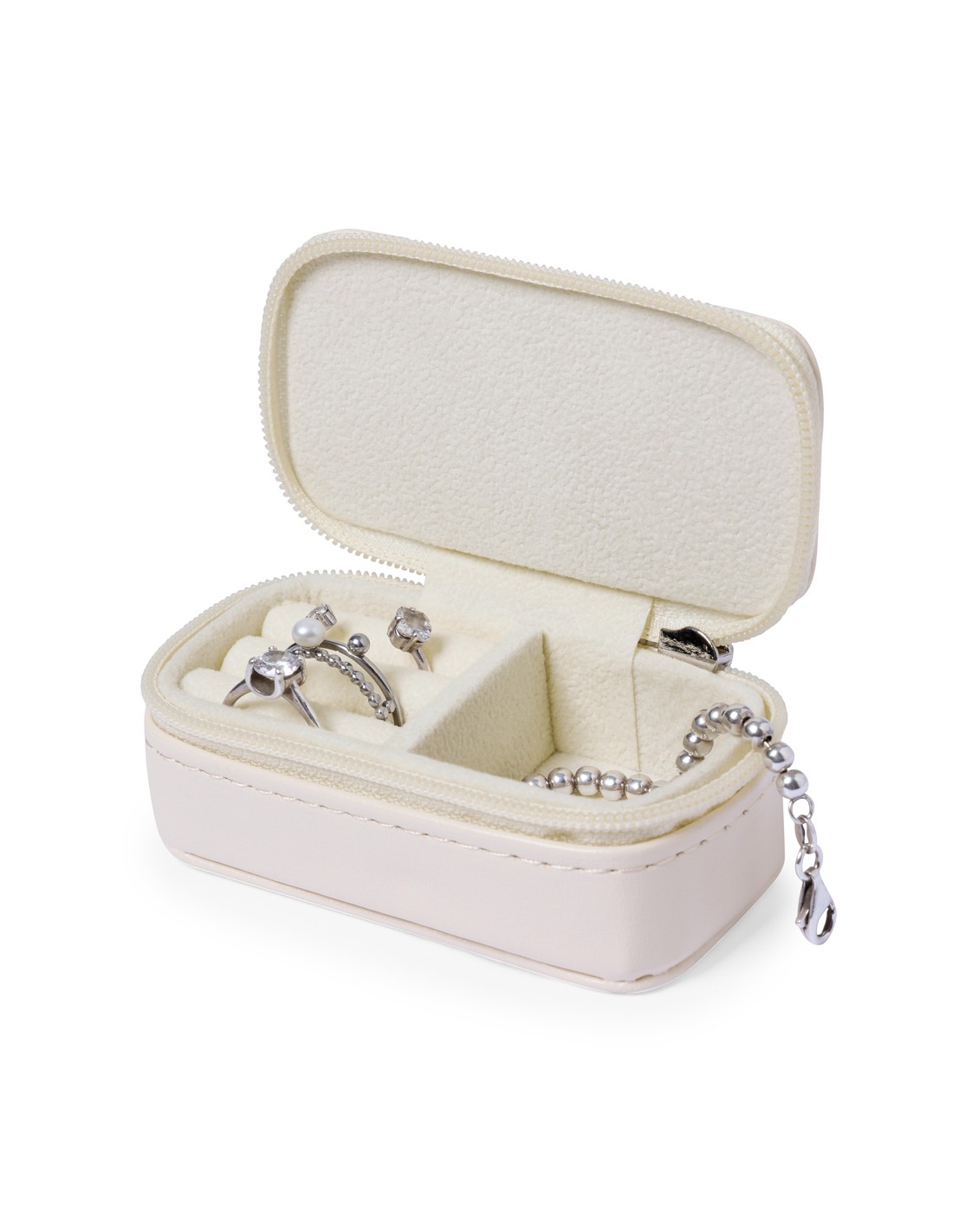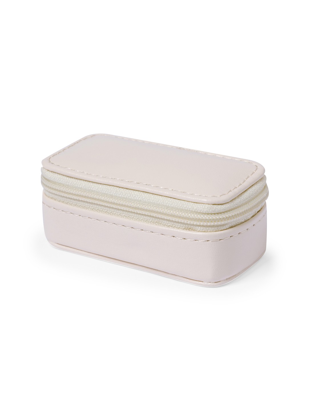 Estuche joyero fabricado en polipiel. Diseño de color natural con cierre de cremallera y dos compartimentos en su interior. Un compartimento en forma de cajita y otro compartimento con almohadillas para sujetar anillos y pendientes, forrado de suave tela. Presentado en una bolsa de papel individual.
