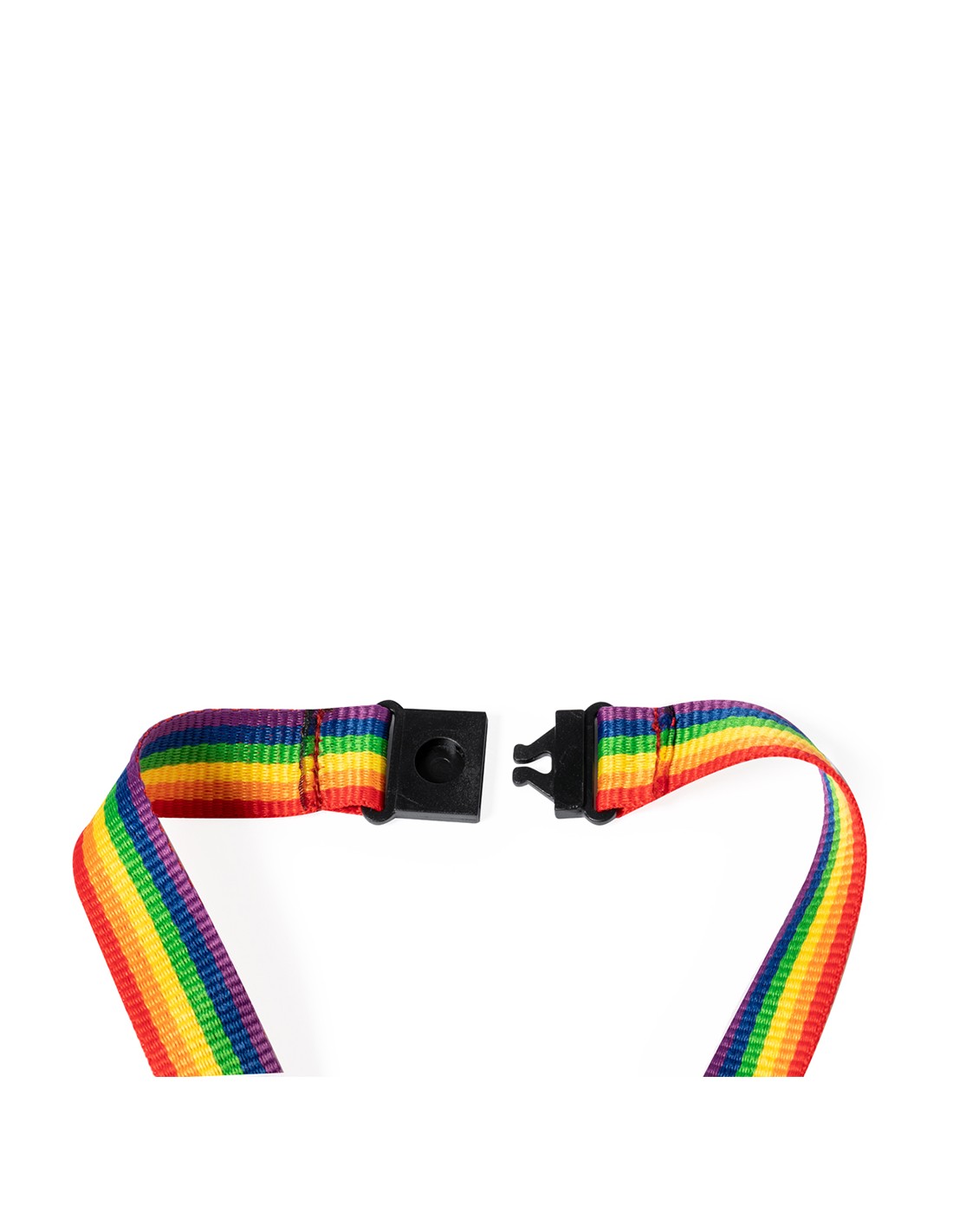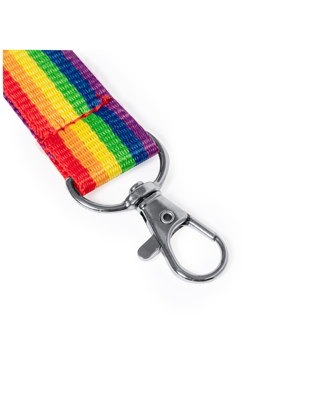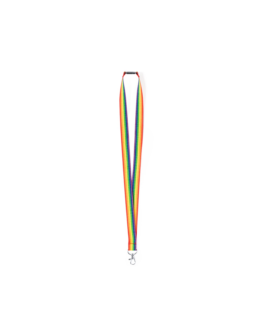 Lanyard Rainbow multicolor, fabricado en suave poliéster. Con mosquetón metálico giratorio y accesorio de seguridad en el cuello. Todo un orgullo de lanyard.