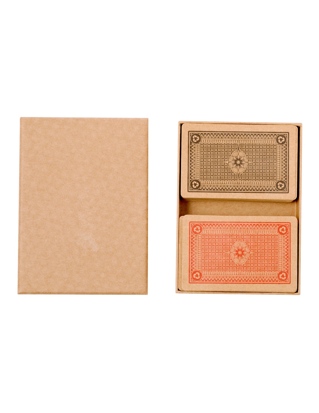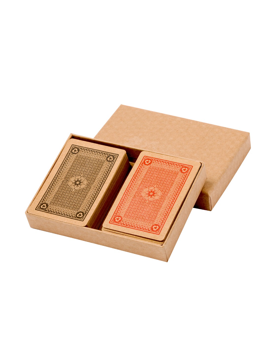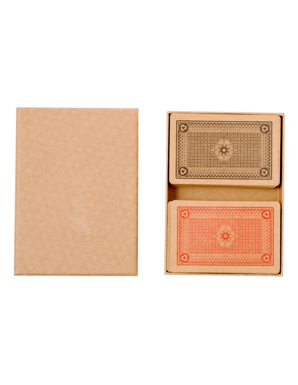 Set de baraja española y baraja francesa, fabricadas en resistente cartón reciclado. Baraja española con 50 naipes y baraja francesa con 54 naipes, presentadas en estuche de cartón acabado kraft con tapadera.