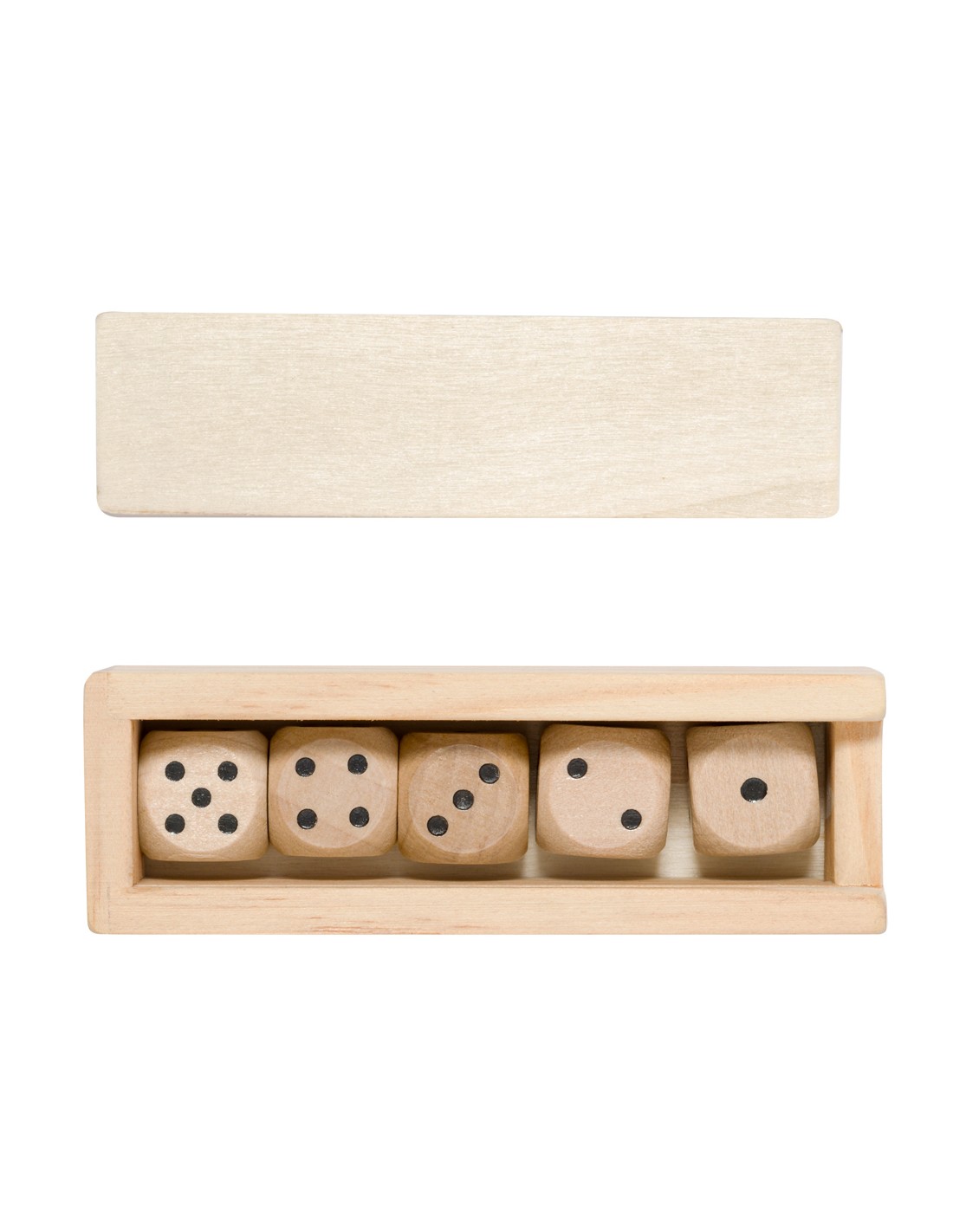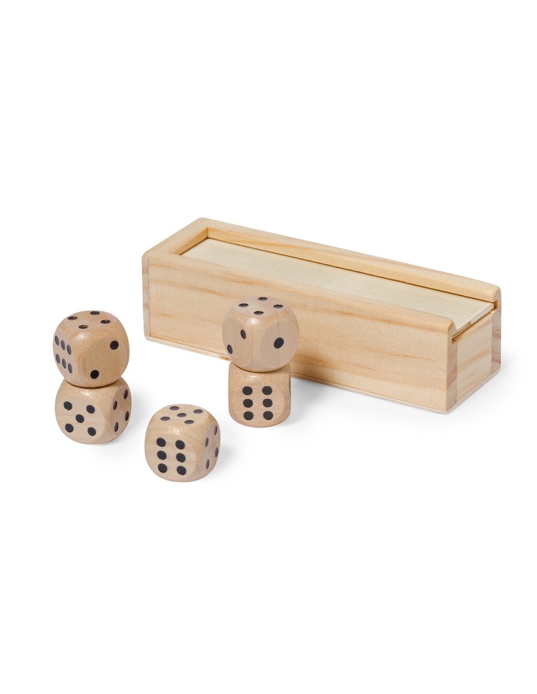 Juego de dados elaborado en madera de acabado natural. Este conjunto incluye cinco dados de seis caras, que vienen presentados en un estuche de madera con tapadera deslizante y en una bolsa individual reciclada.