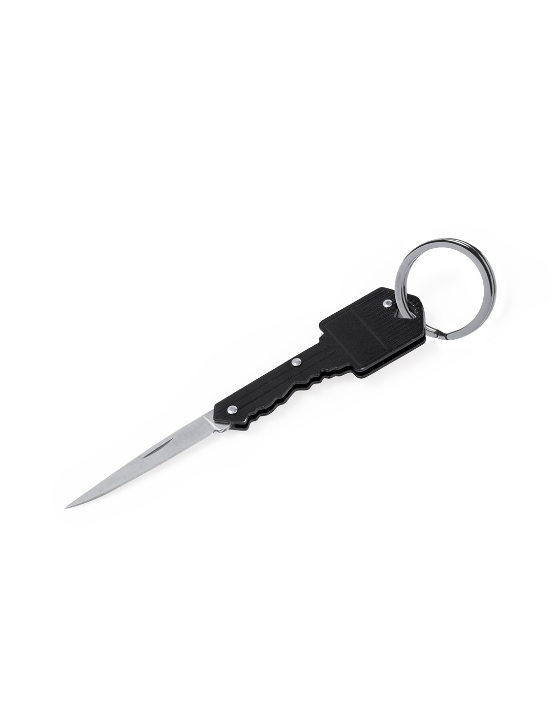 Distinguida navaja en forma de llave fabricada en aluminio y acero inox. Con anilla para llavero y hoja plegable. Presentada individualmente en caja kraft.