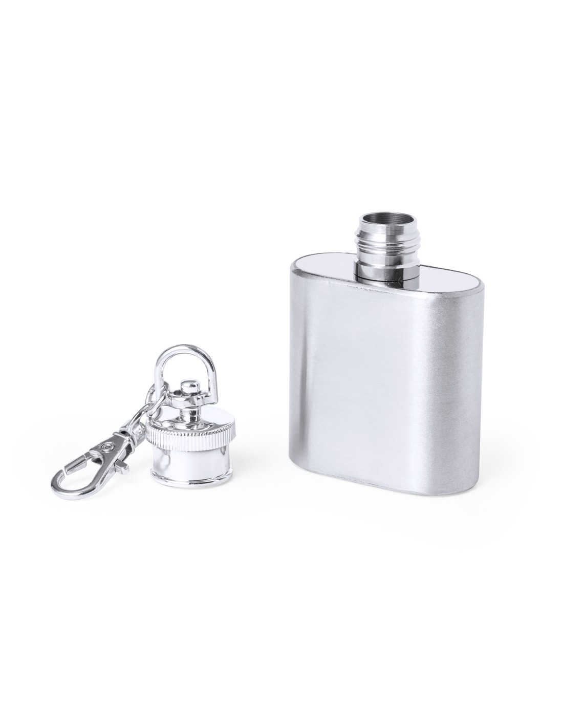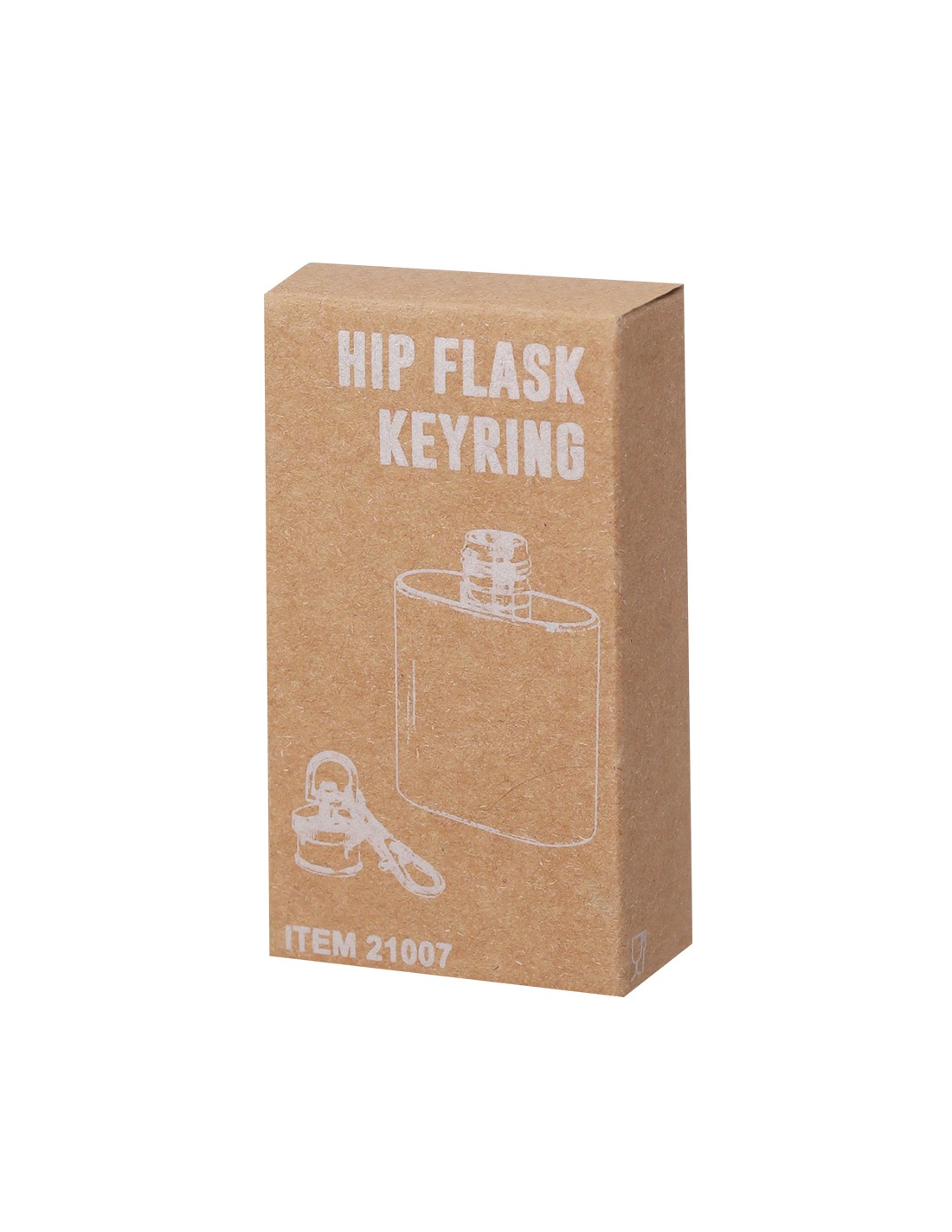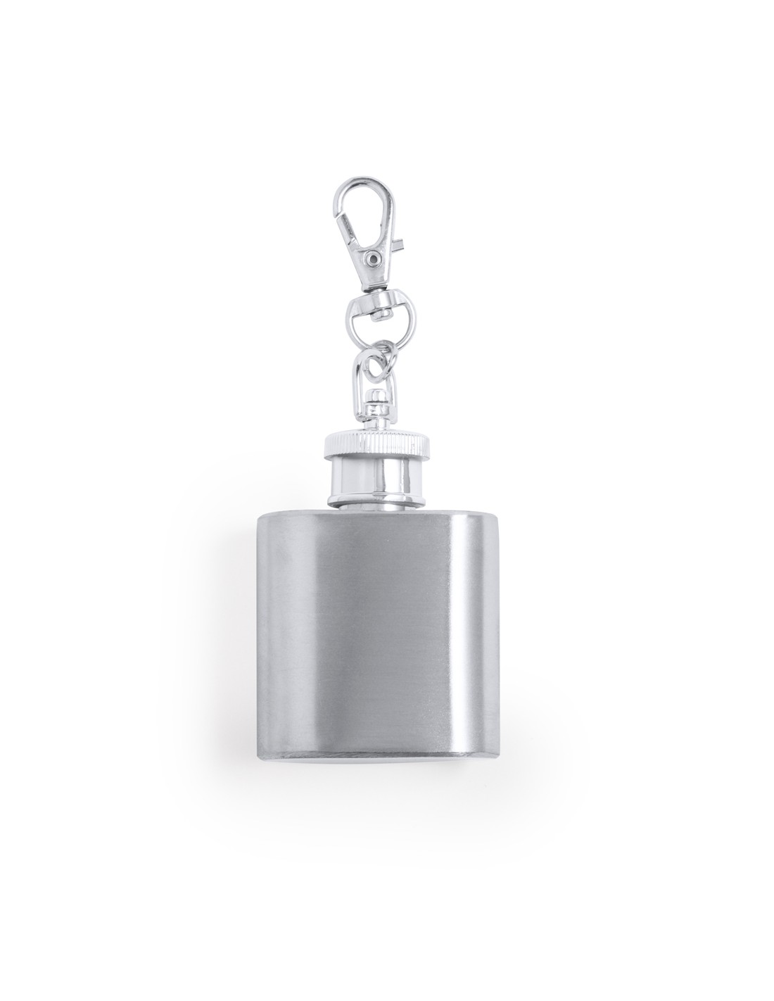Práctico llavero petaca fabricado en acero inox, de 30 ml de capacidad. Tapón con cierre de seguridad a rosca y mosquetón giratorio. Presentado en caja de diseño kraft.
