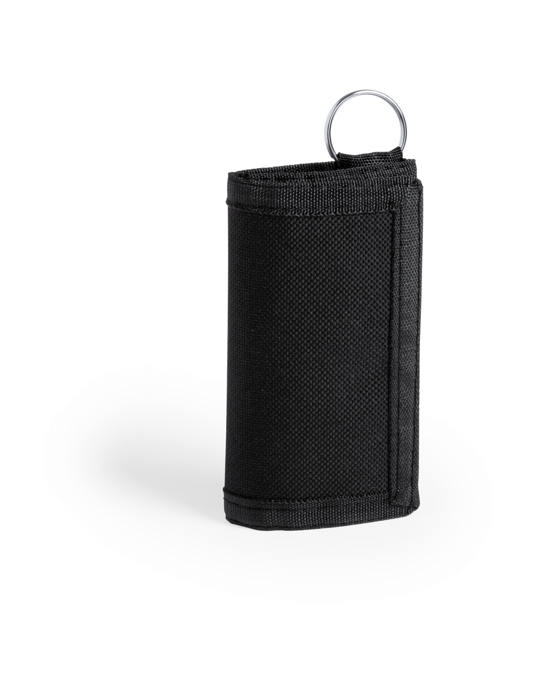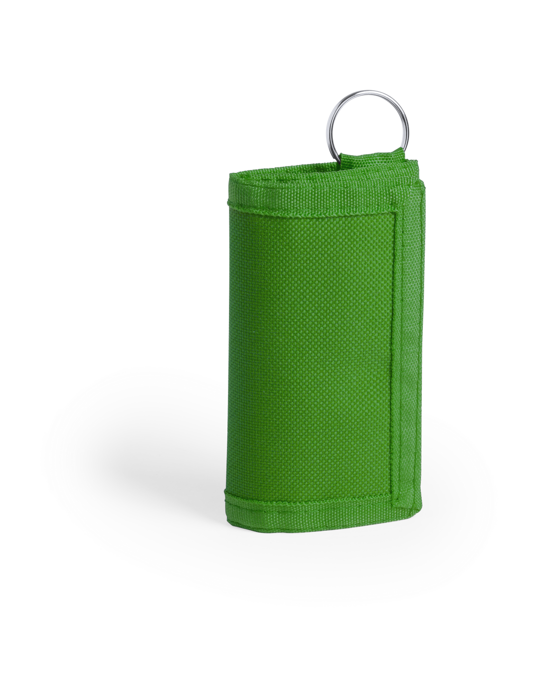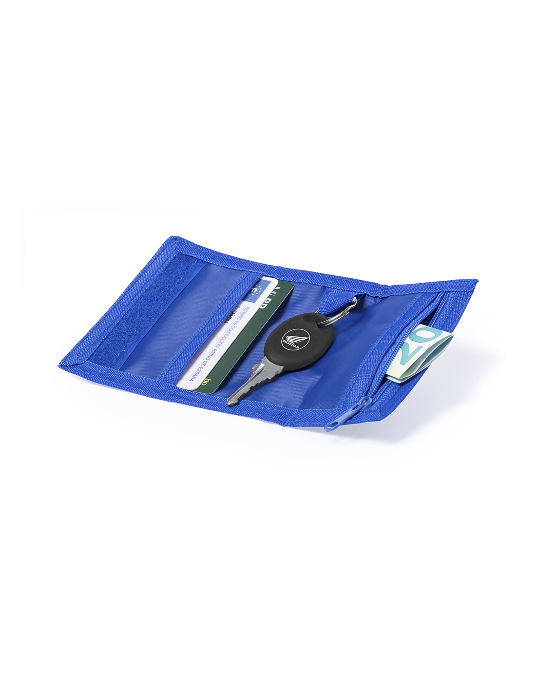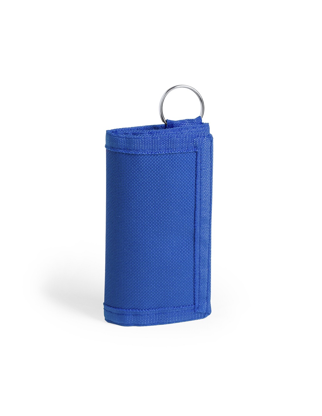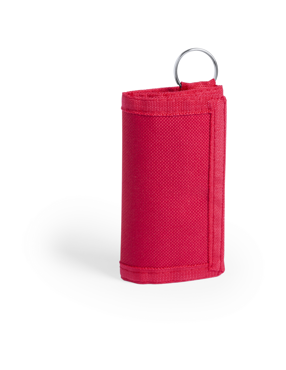 Llavero monedero en resistente poliéster 600D de vivos colores y cierre de velcro. Interior con monedero de cierre de cremallera, compartimento para tarjeta y anilla llavero.