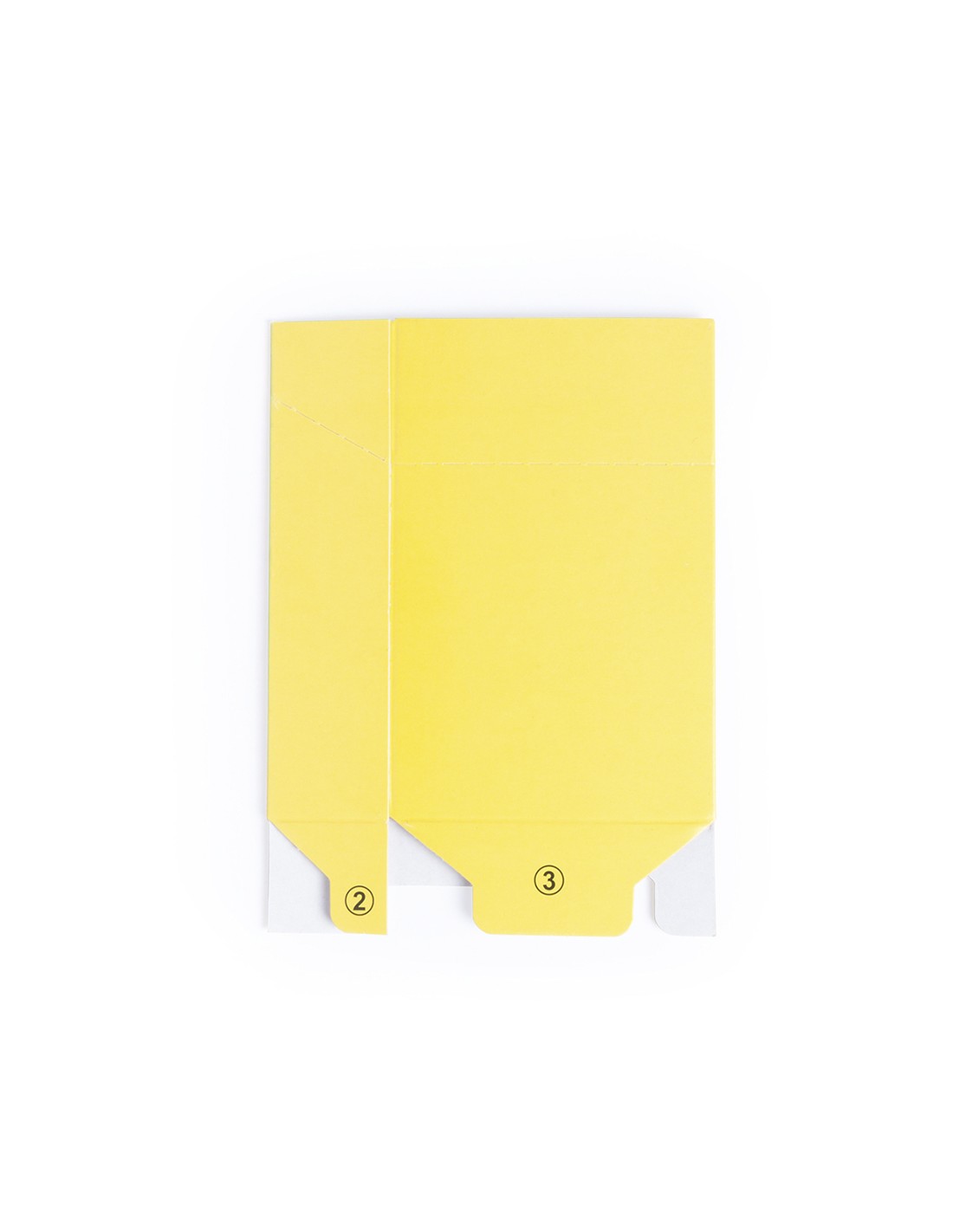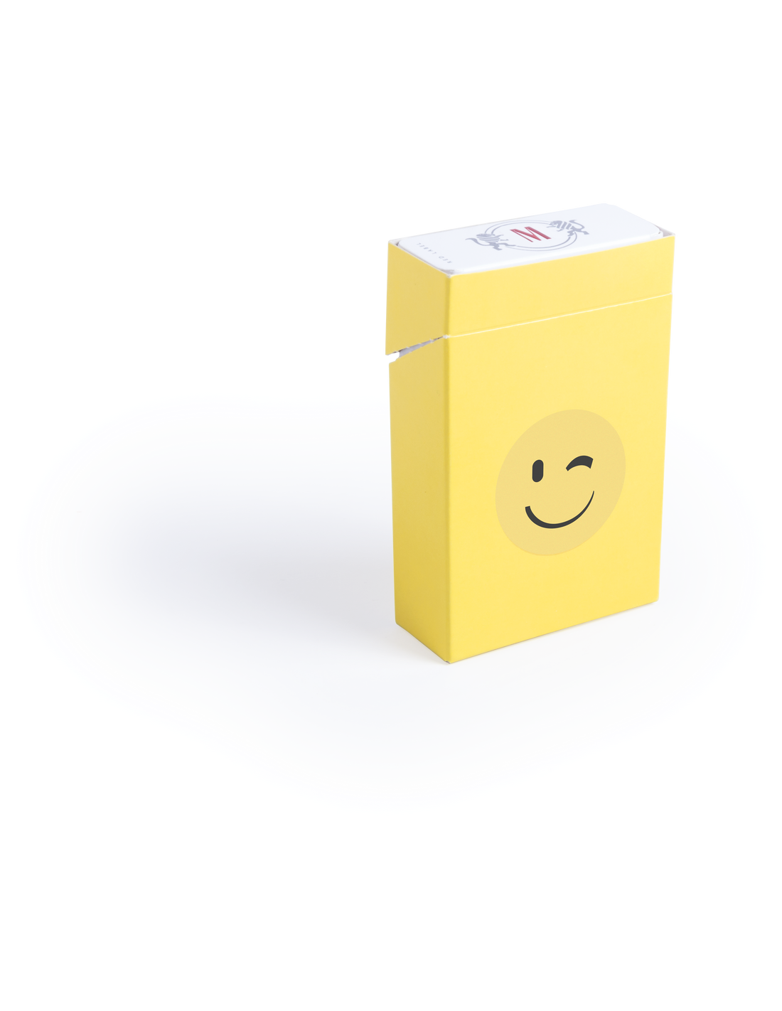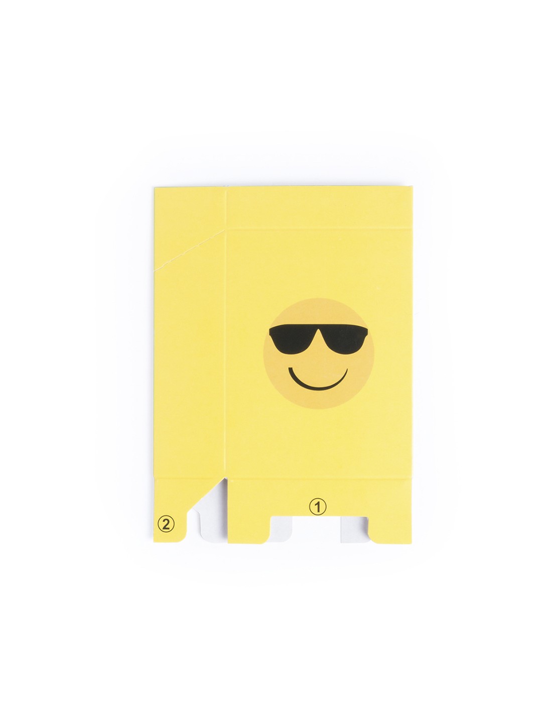 Funda para cajetilla de tabaco de divertidos diseños emoji en llamativo color amarillo. En cartón de acabado brillo con emoji en parte trasera y presentación plegada.