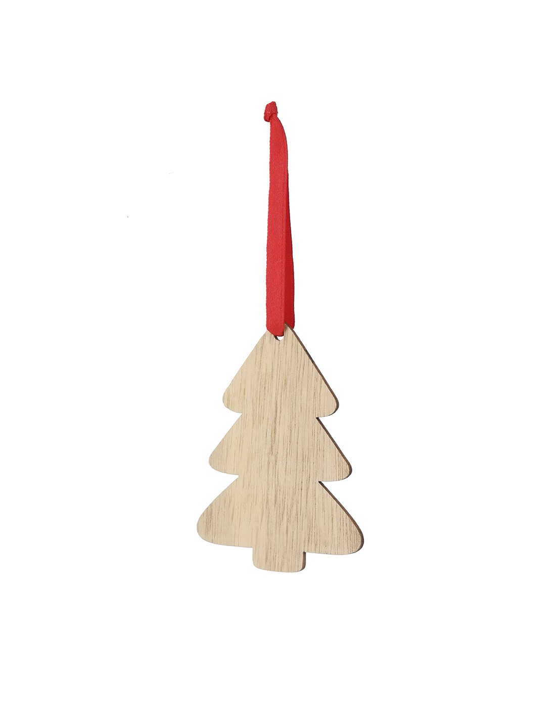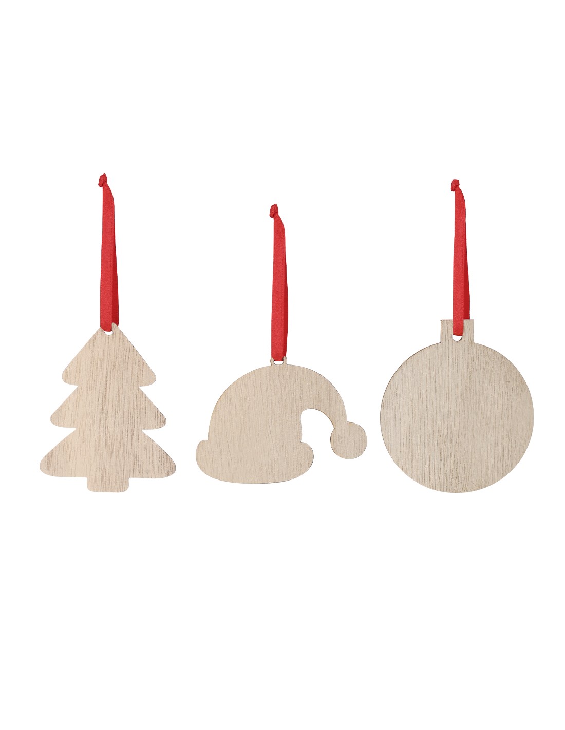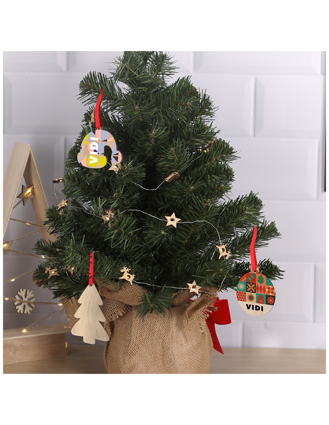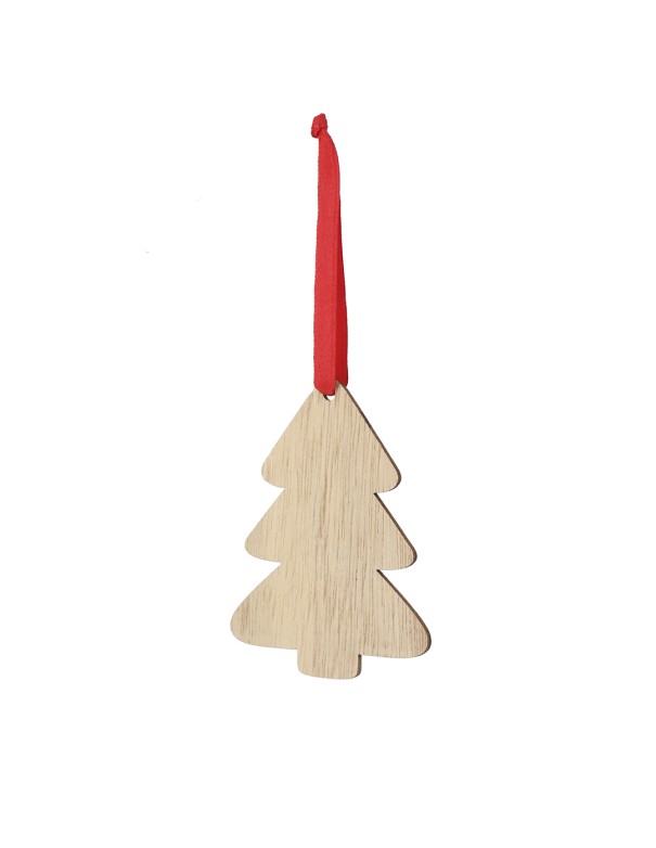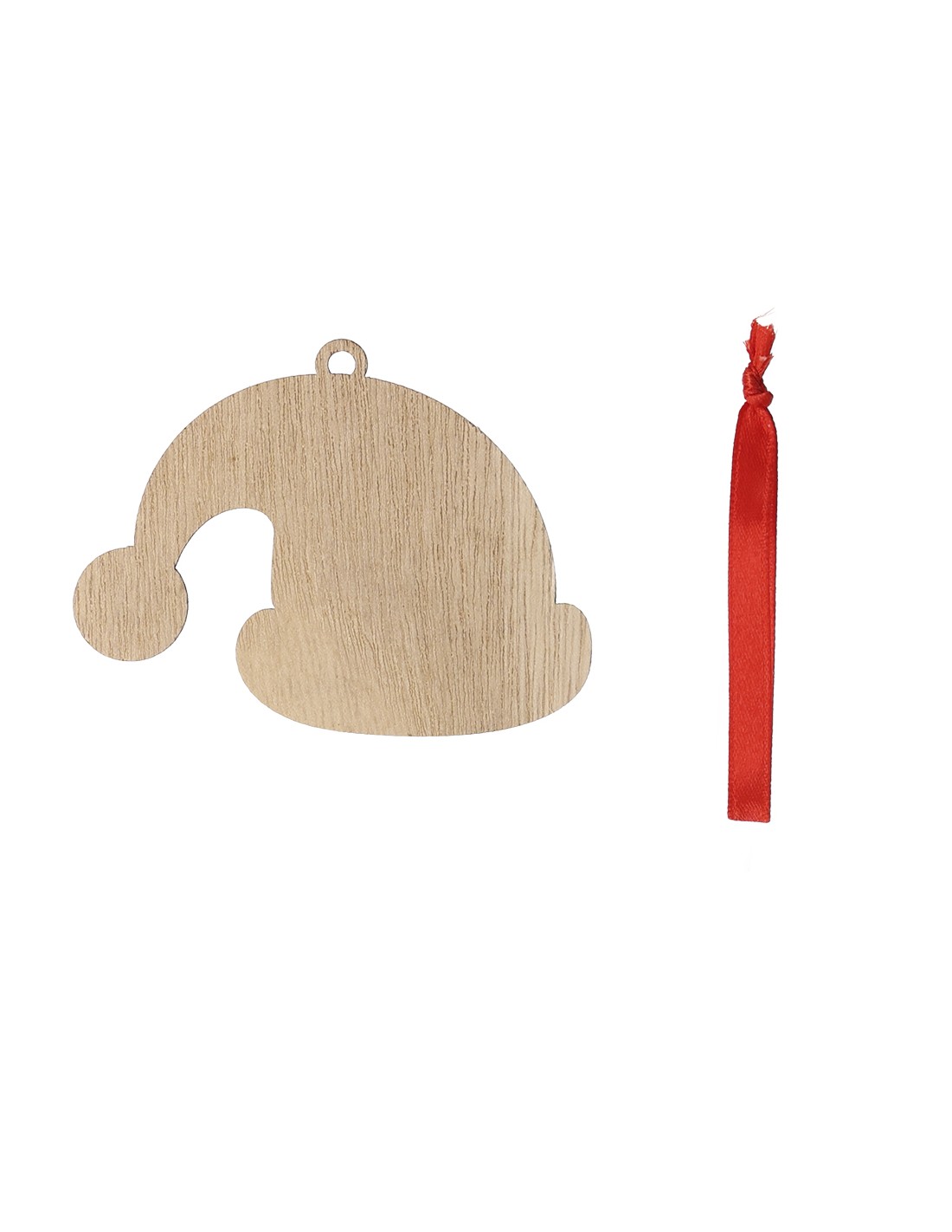 Adorno navideño fabricado en suave madera natural. Disponible en varios diseños: Gorro de Papá Noel, Árbol de Navidad y Bola de Navidad. Incluye lazo colgador en color rojo. Especialmente diseñado para marcaje en sublimación.Elaborado con elementos vegetales para fomentar así la utilización de materias primas naturales y reducir las emisiones contaminantes.