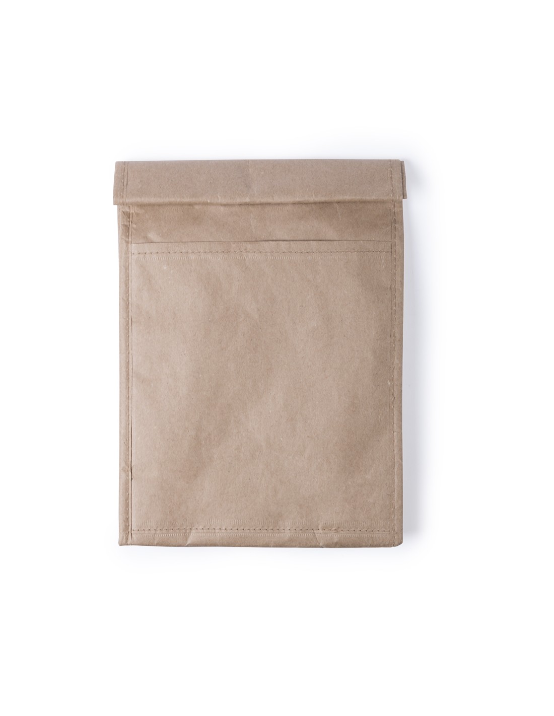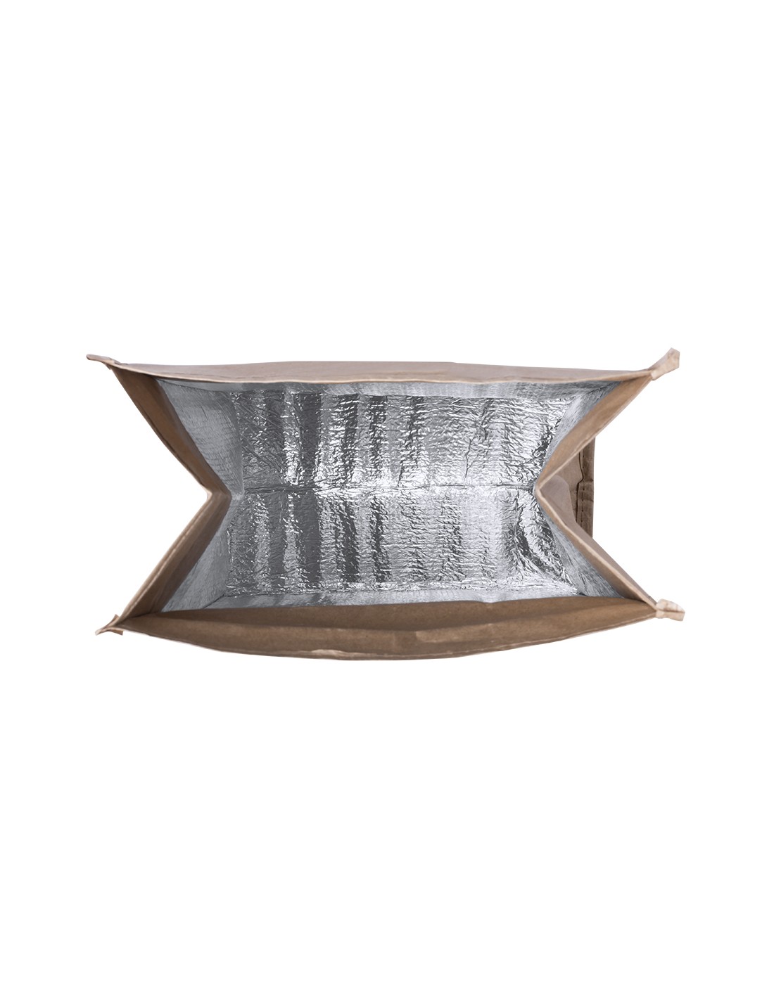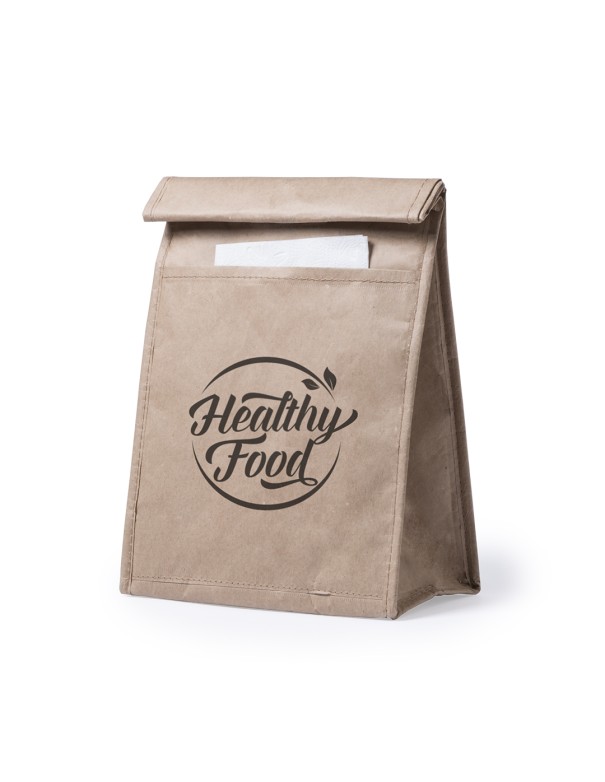 Bolsa térmica en papel resistente a la humedad de 85g/m2. Con interior isotermo acabado en aluminio, bolsillo exterior y cierre de velcro. 2,3 litros de capacidad.