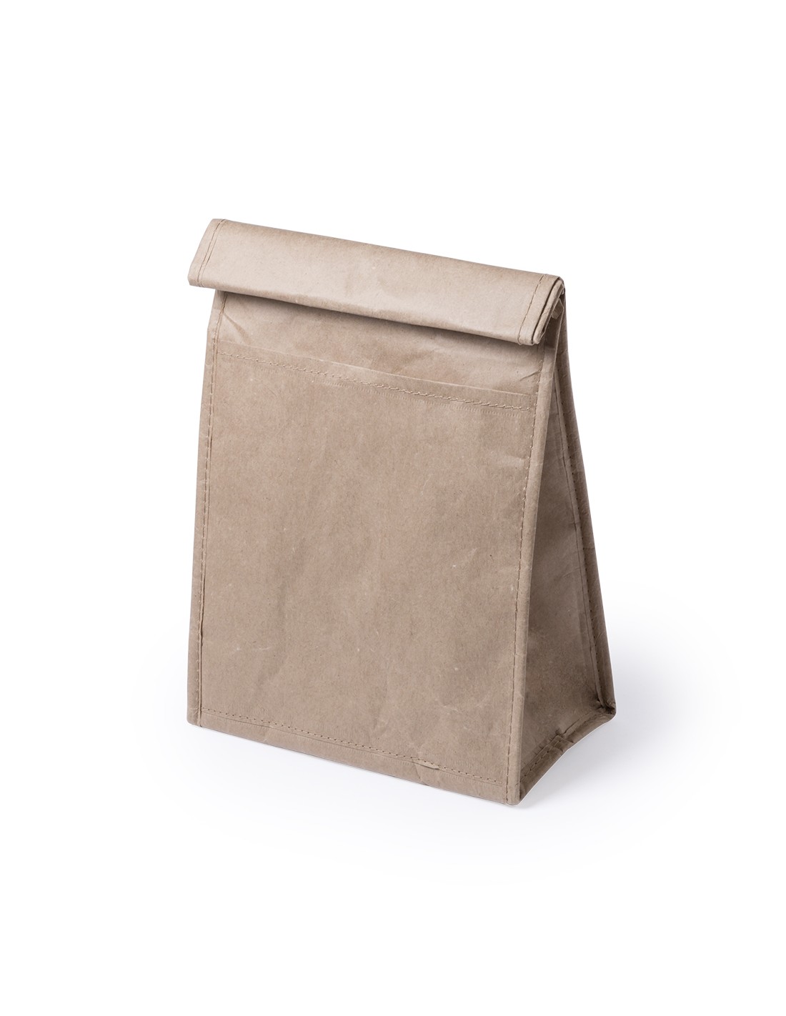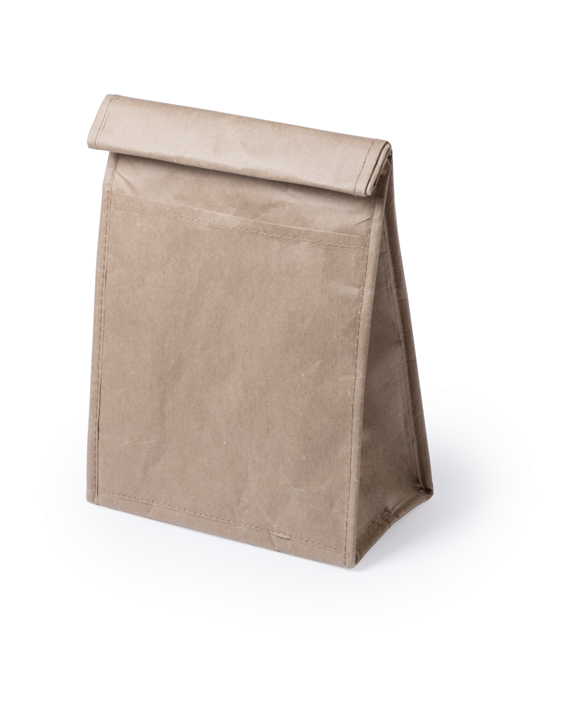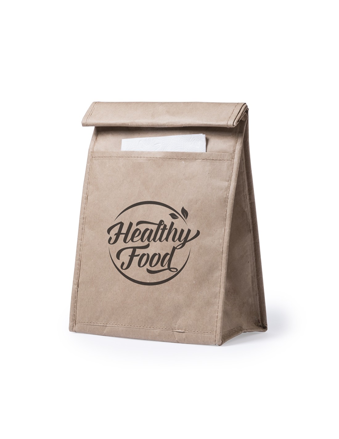 Bolsa térmica en papel resistente a la humedad de 85g/m2. Con interior isotermo acabado en aluminio, bolsillo exterior y cierre de velcro. 2,3 litros de capacidad.