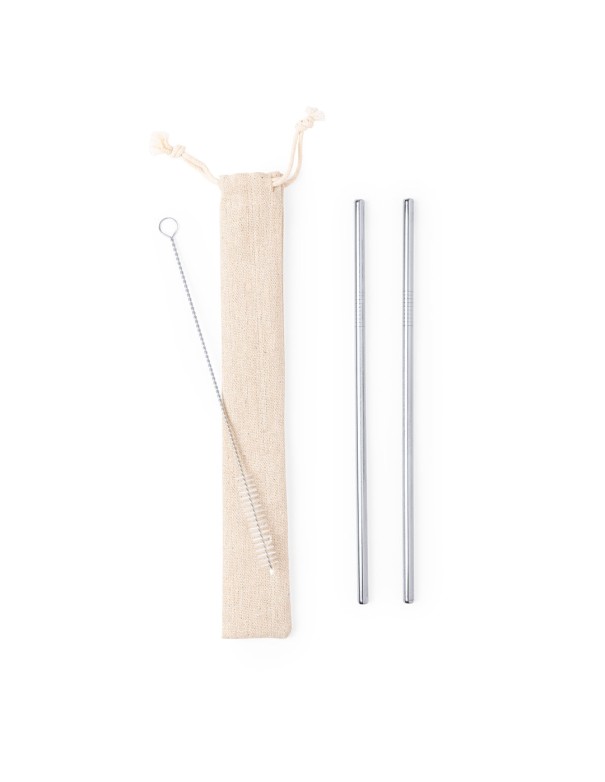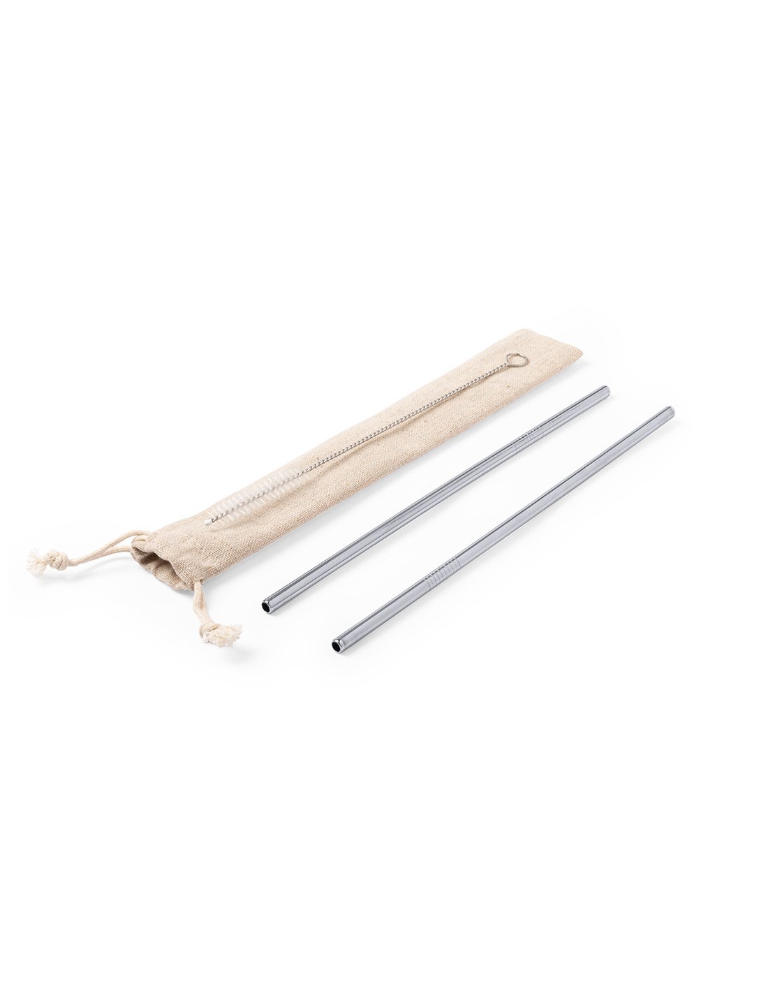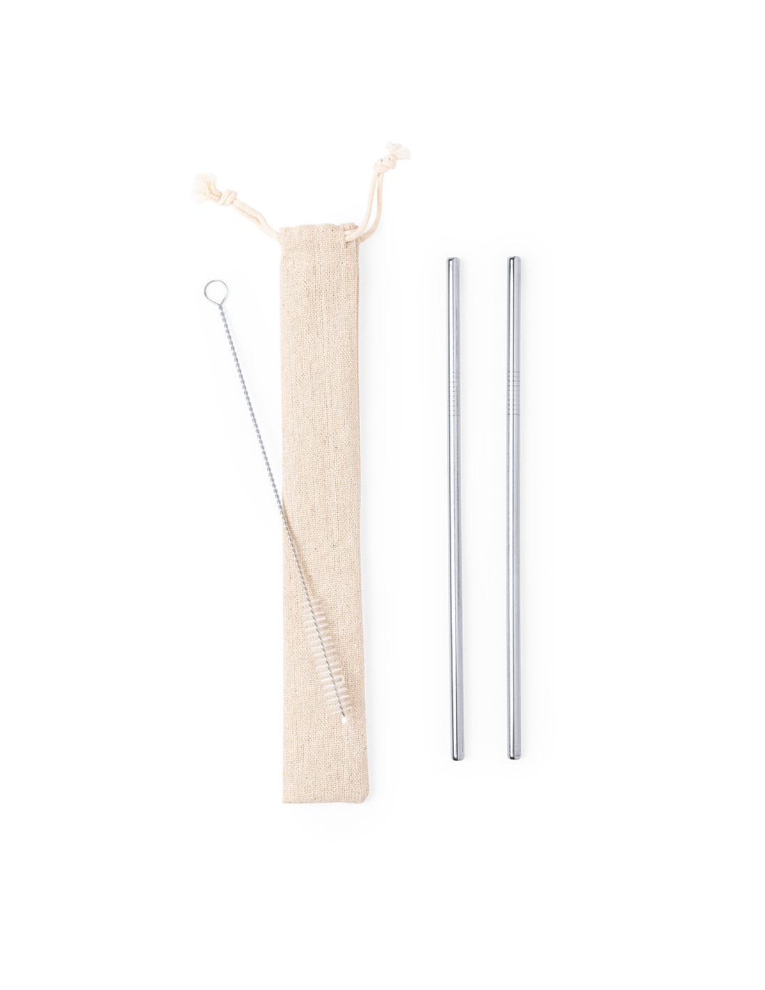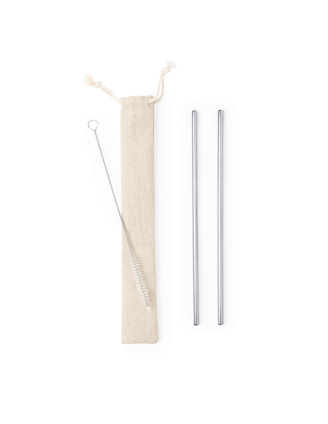 Set de 2 pajitas reutilizables en acero inoxidable. Con accesorio limpiador incluido y presentadas en bolsita de algodón natural con cuerdas autocierre.