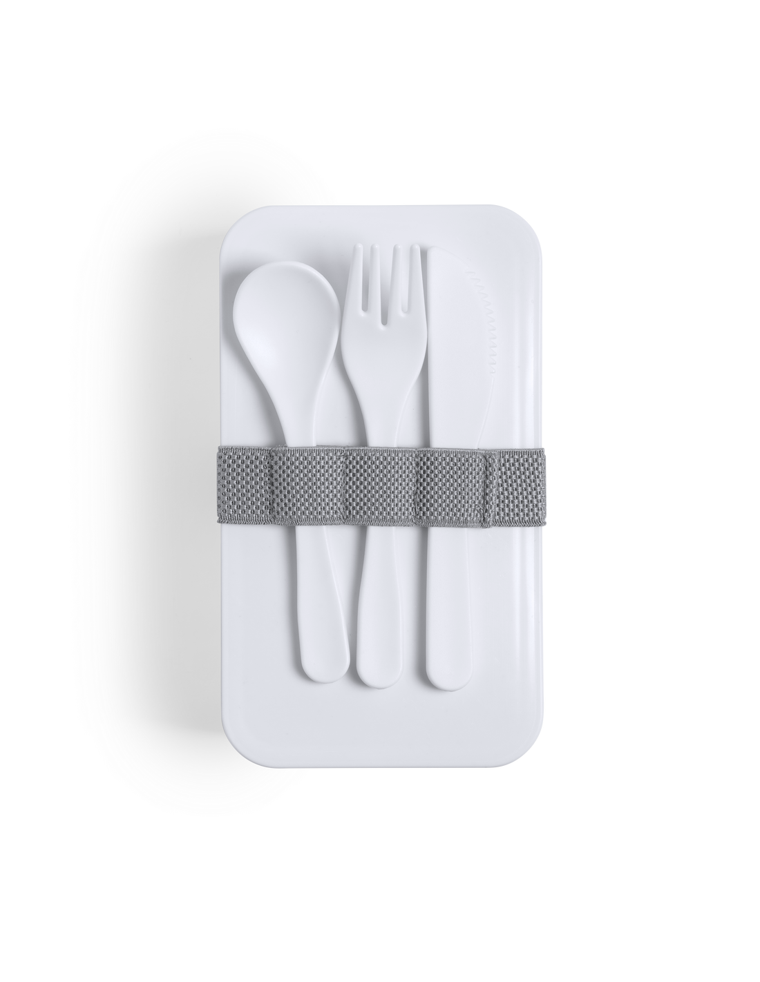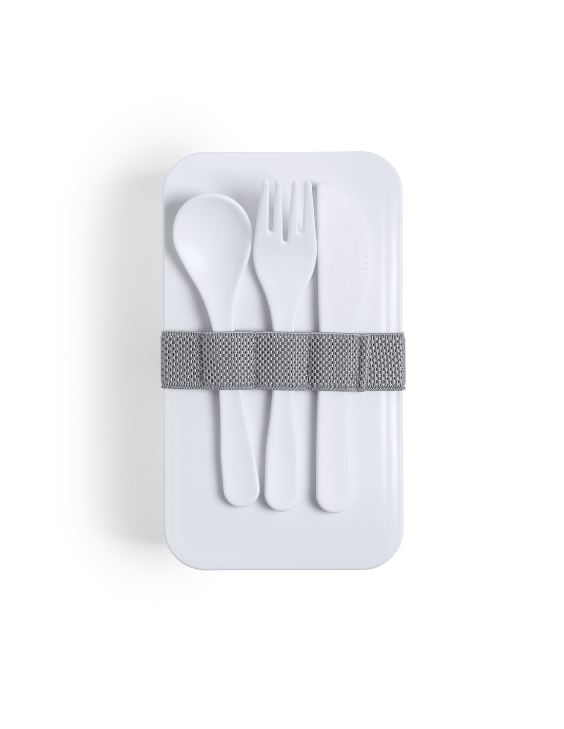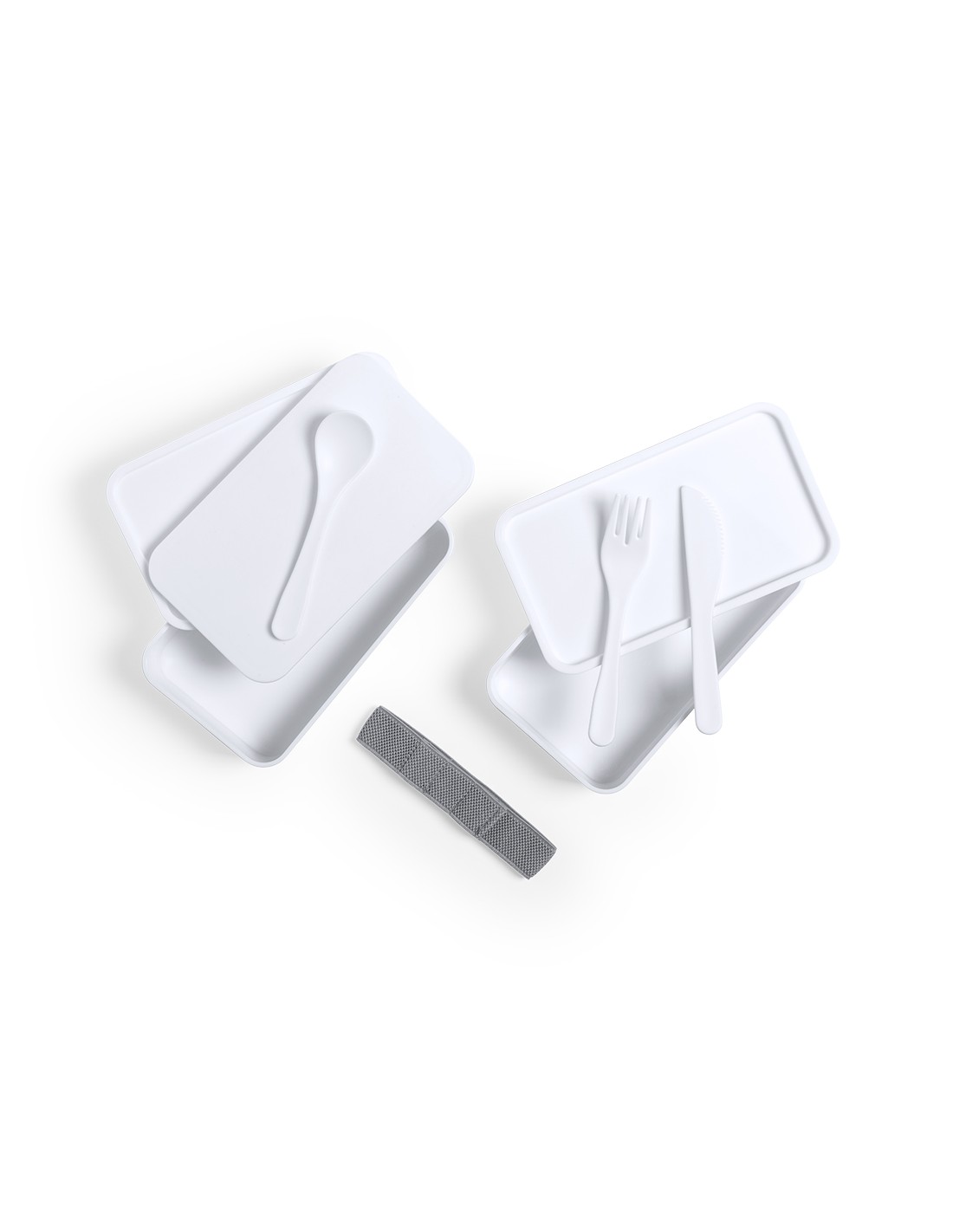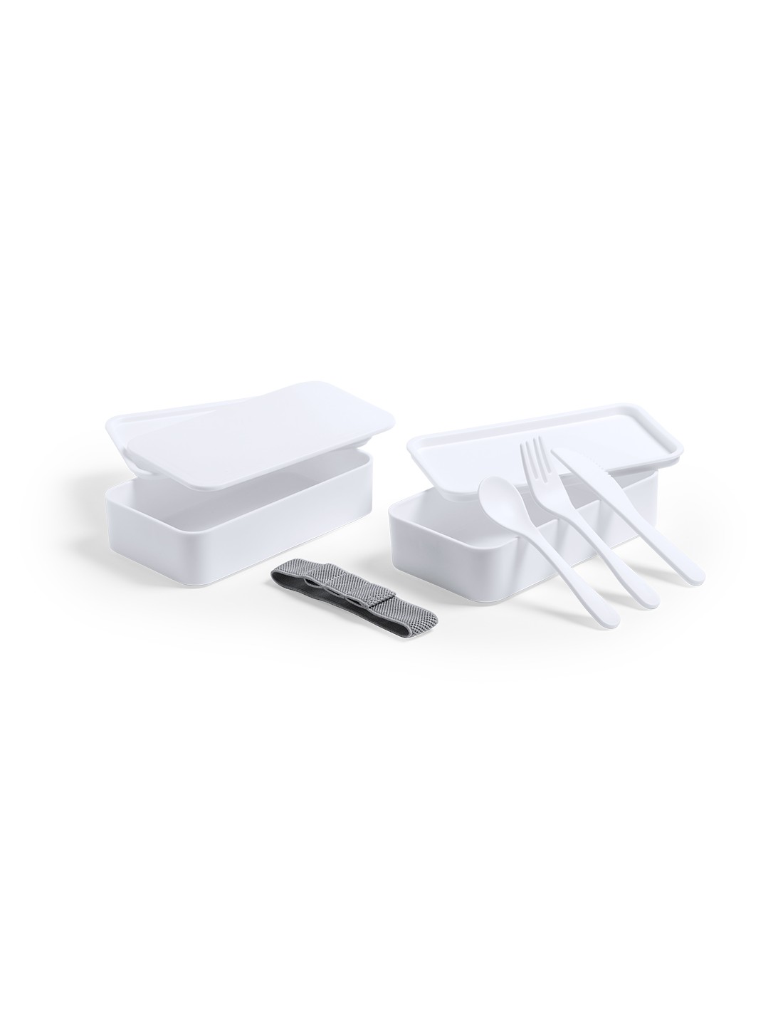 Fiambrera antibacteriana en resistente material PP de acabado sólido, libre de BPA. Dos compartimentos, cada uno de 700 ml de capacidad y cinta de seguridad con tenedor, cuchara y cuchillo. Los productos con tratamientos antibacterianos son capaces de reducir drásticamente las cargas bacterianas presentes en las superficies de los materiales, gracias a la incorporación de agentes microbianos permanentes estáticos, con alta efectividad para inhibir y prevenir la contaminación bacteriana. Artículo de acuerdo al estándar ISO 22196, que determina la actividad antibacteriana en materiales plásticos y superficies no porosas, lo que permite conocer la efectividad de inhibición microbiana que tienen los aditivos sobre los objetos tratados mediante una evaluación cuantitativa.