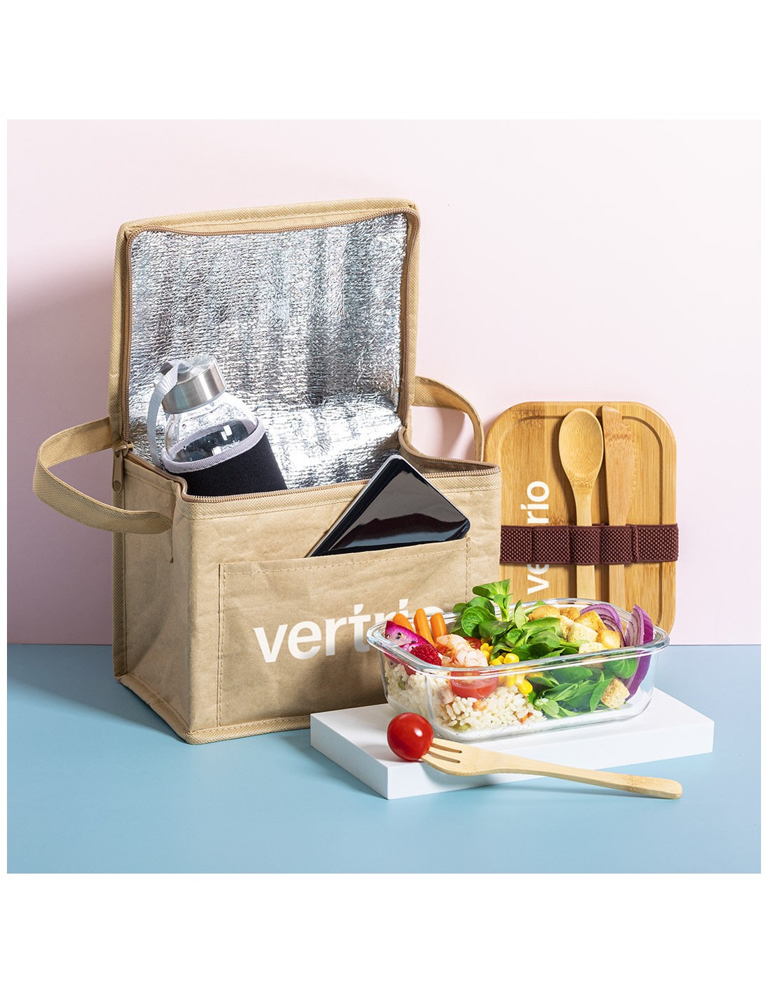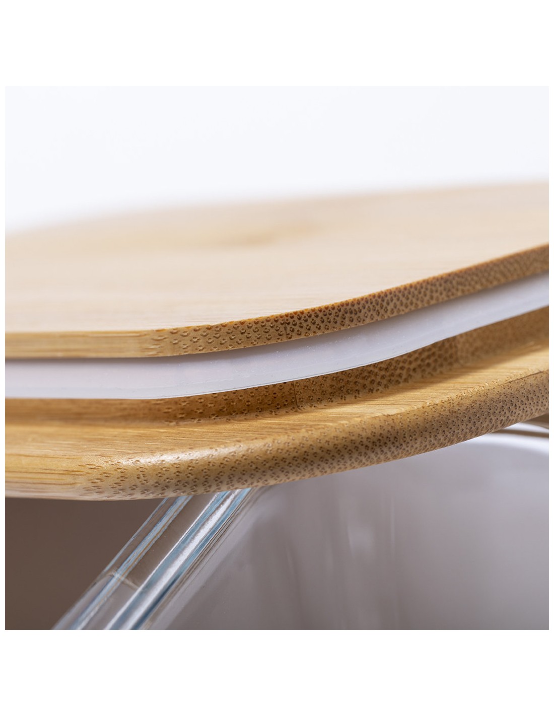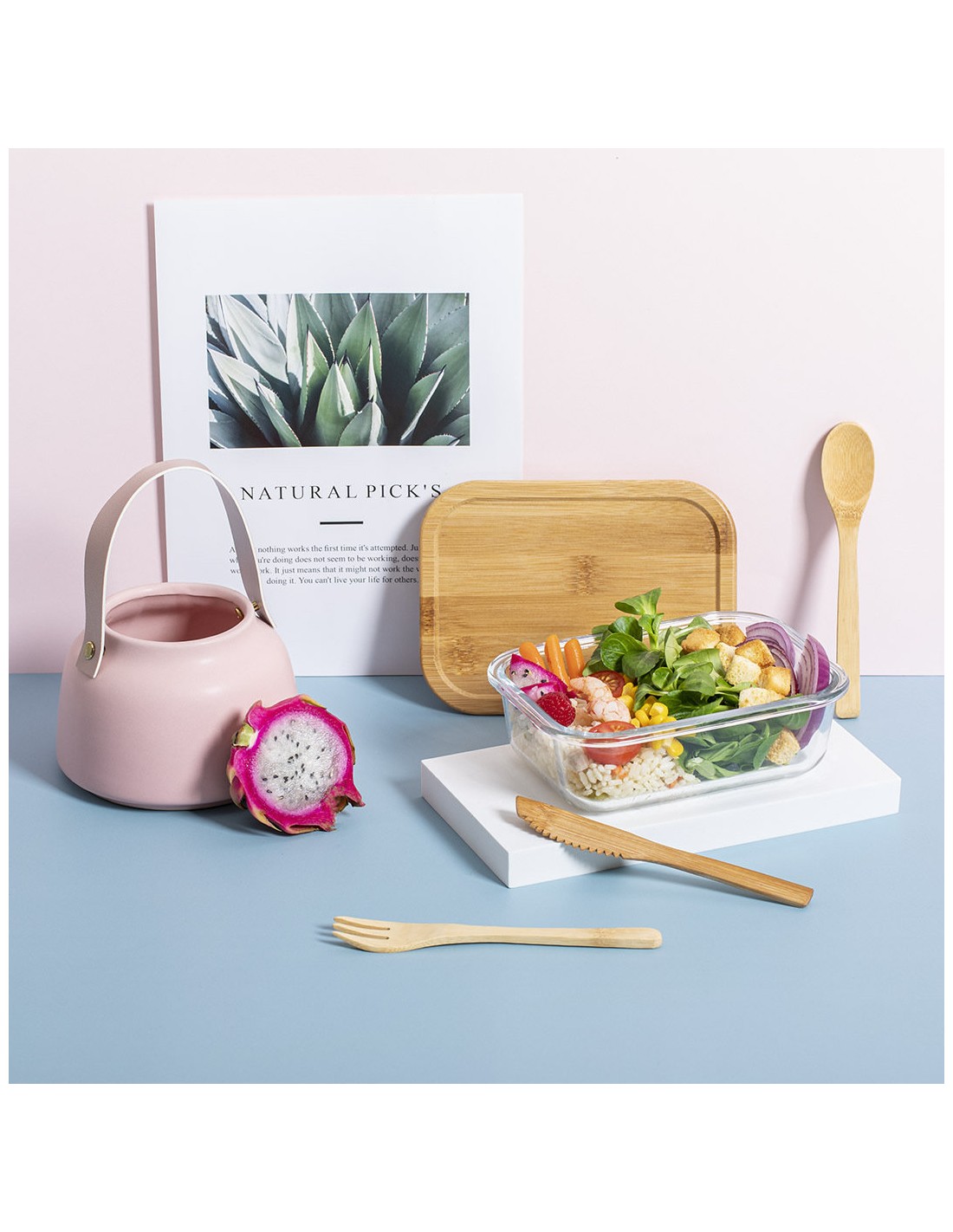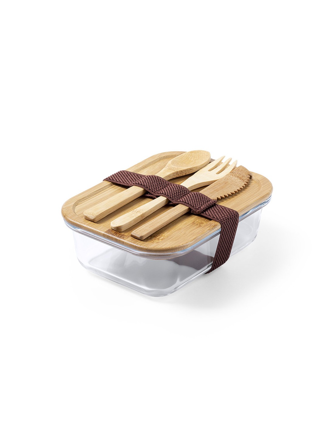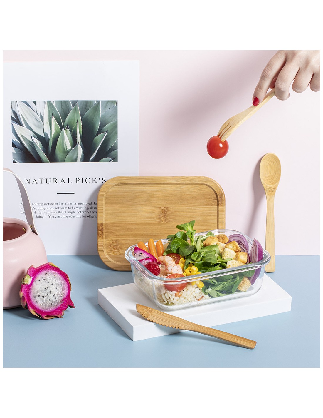 Fiambrera de línea nature de 700 ml de capacidad. Fabricada en cristal, con tapa hermética de bambú pulido, con banda de goma para evitar derrames y rebaje para usarla como bandeja. Incluye cinta de seguridad con tenedor, cuchara y cuchillo. Presentada en atractiva caja individual de diseño eco.