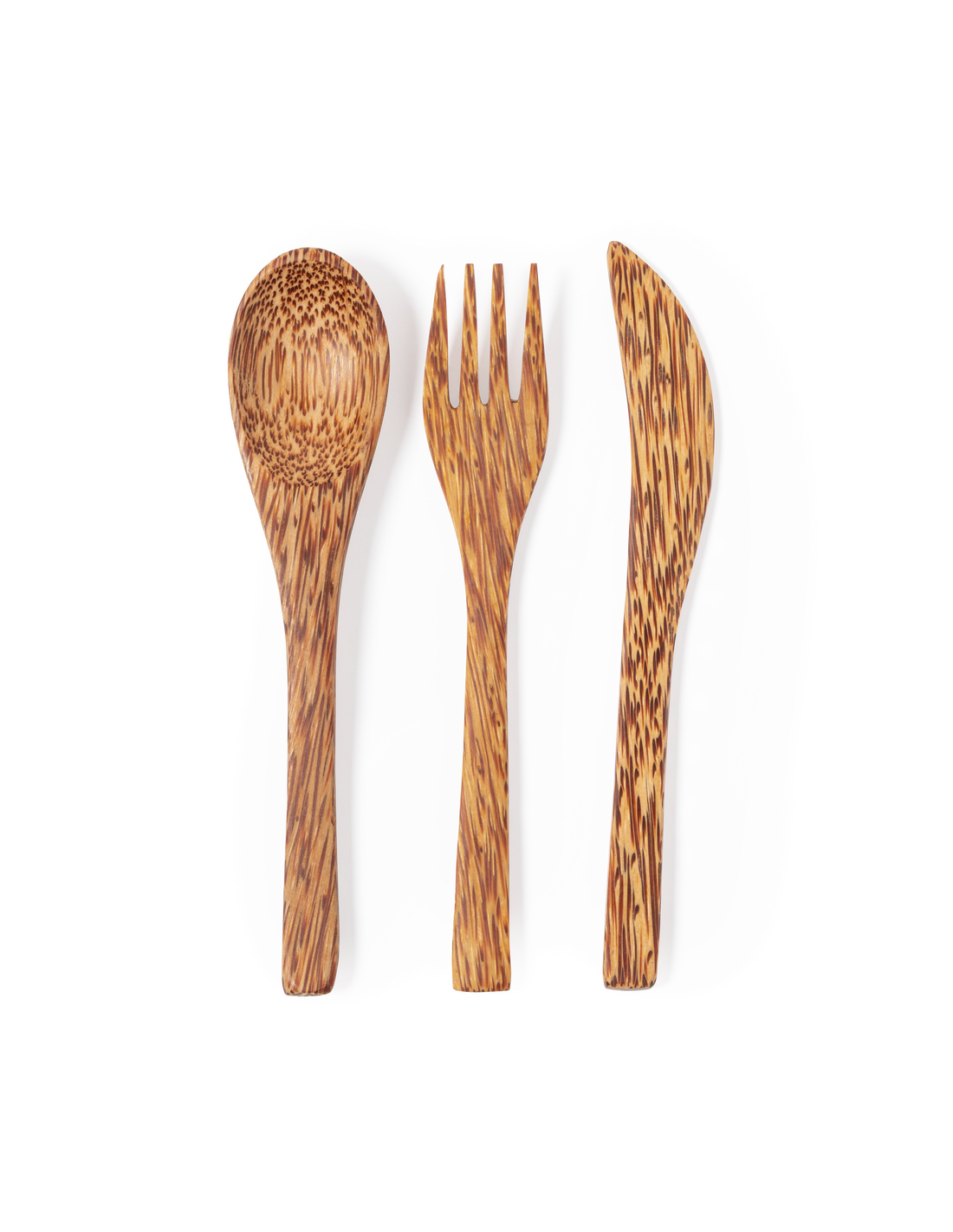 Set de cubiertos reutilizables de línea nature fabricados en coco. Tras el consumo de su fruto, del coco y su planta se pueden obtener multitud de productos, contribuyendo a la sostenibilidad del planeta y fomentando el uso de materias primas naturales. Incluye cuchara, cuchillo y tenedor. Presentados en bolsita individual de algodón con cierre de cordón.