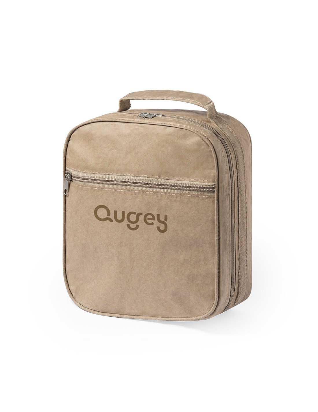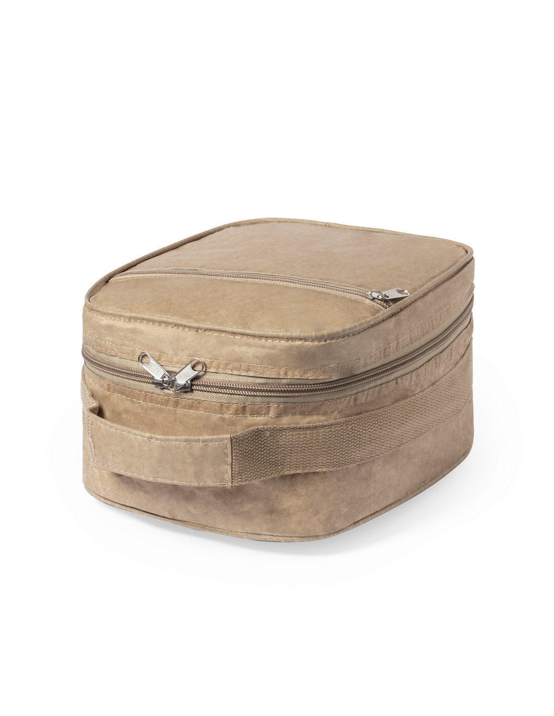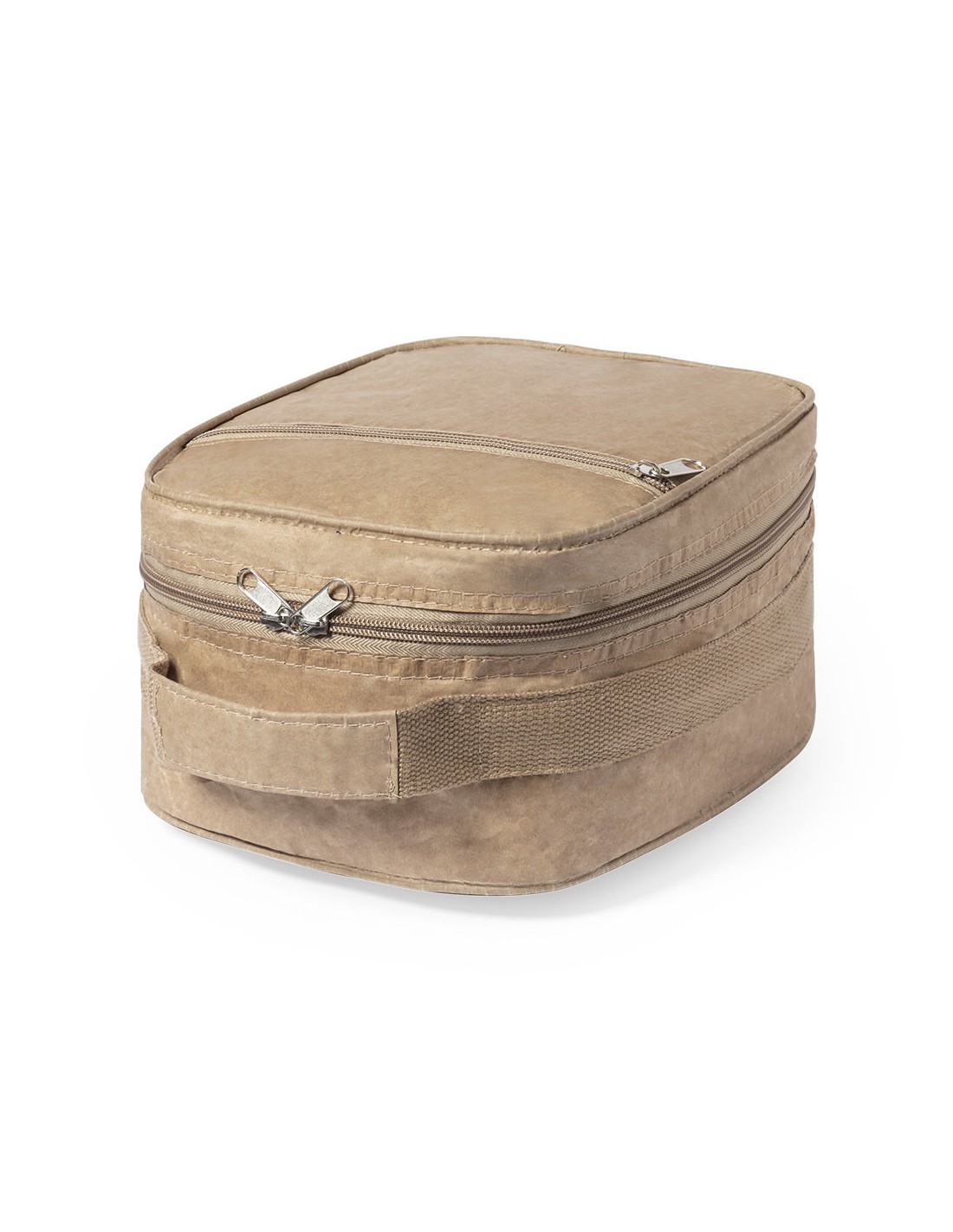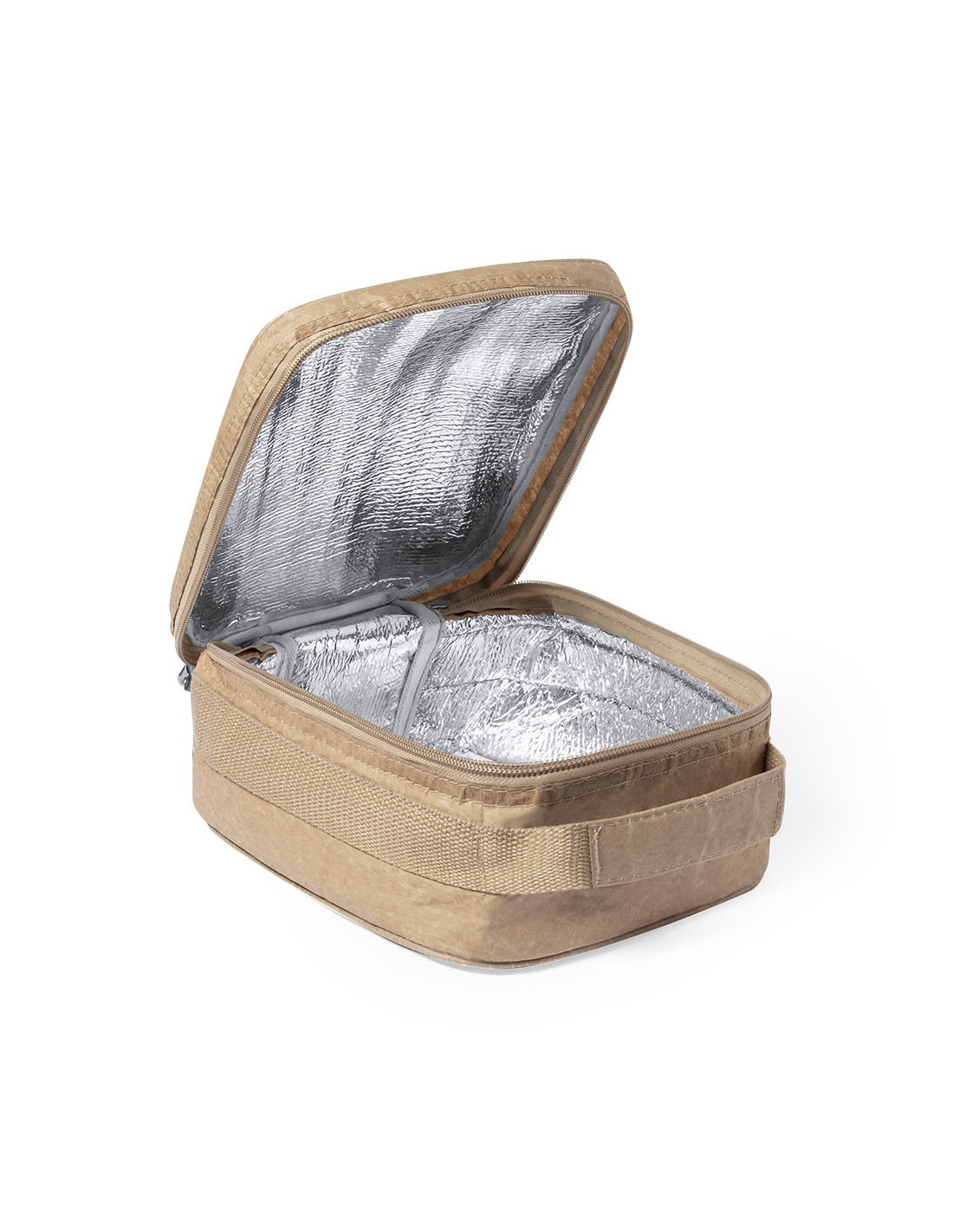 Nevera de línea nature, fabricada en papel reciclado. Con dos compartimentos independientes de cierre de cremallera con tiradores metálicos. Asa de transporte reforzada e interior isotermo en aluminio.