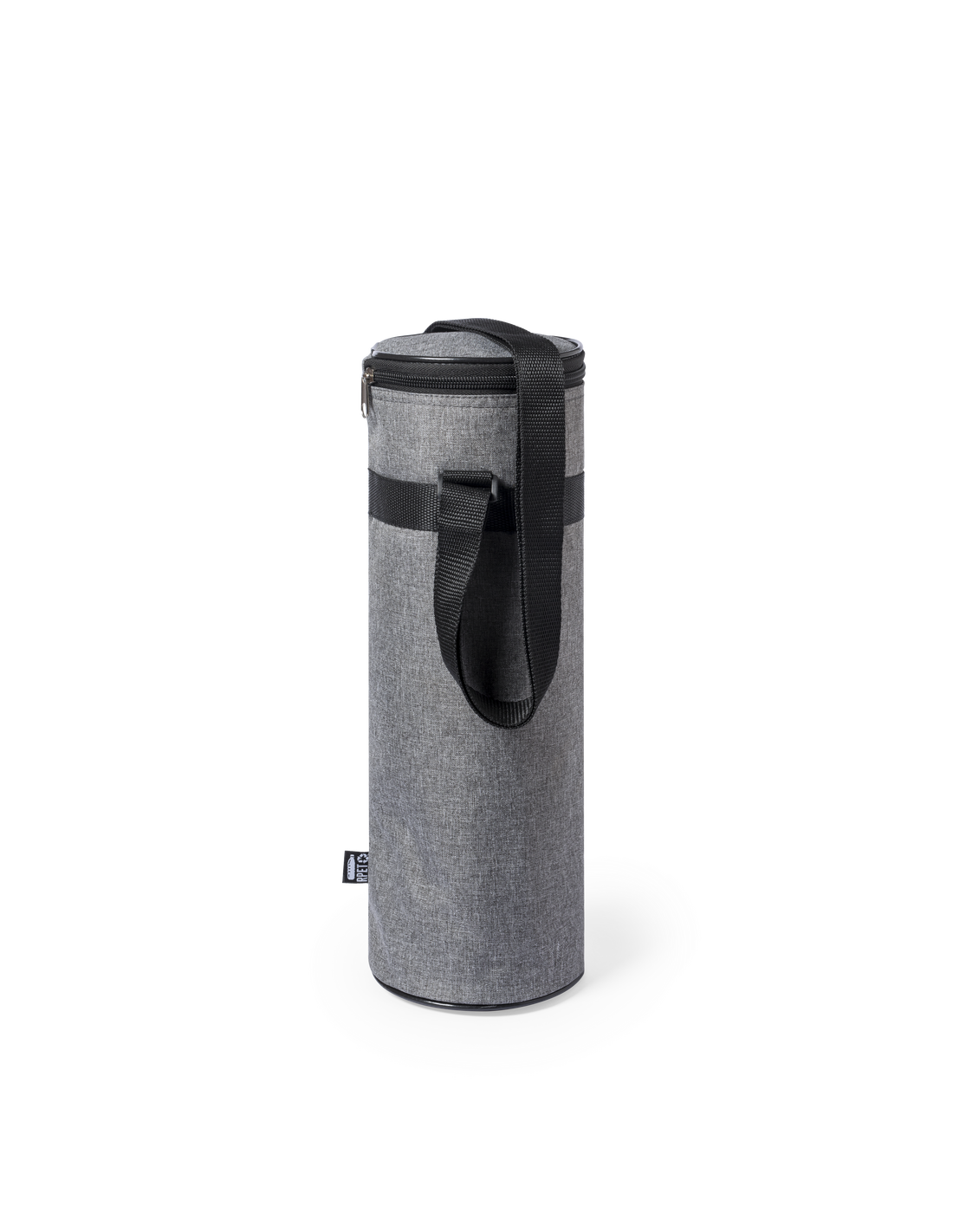 Nevera de línea nature para botellas de hasta 1,5l, fabricada en resistente poliéster 300D RPET, elaborado a partir de plástico reciclado para así fomentar la reutilización de residuos plásticos y contribuir a la sostenibilidad del planeta. Con cierre de cremallera y cómoda cinta para hombro ajustable. Interior isotermo en aluminio, con distintivo RPET en etiqueta.