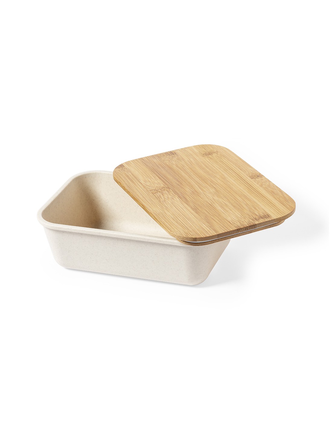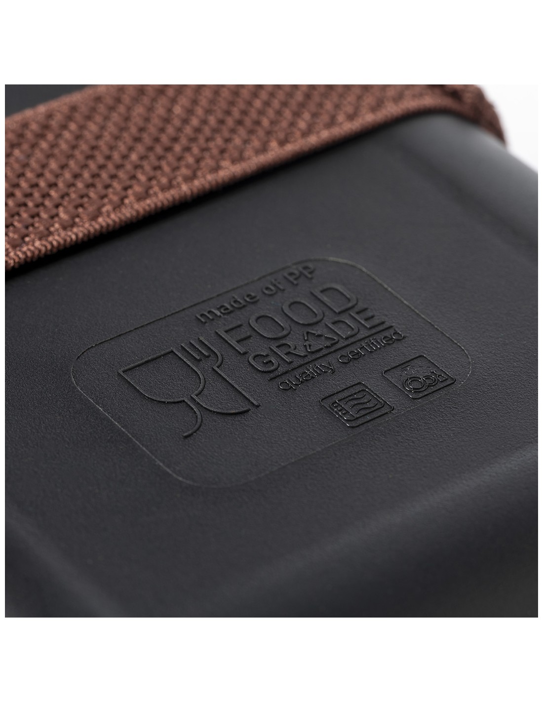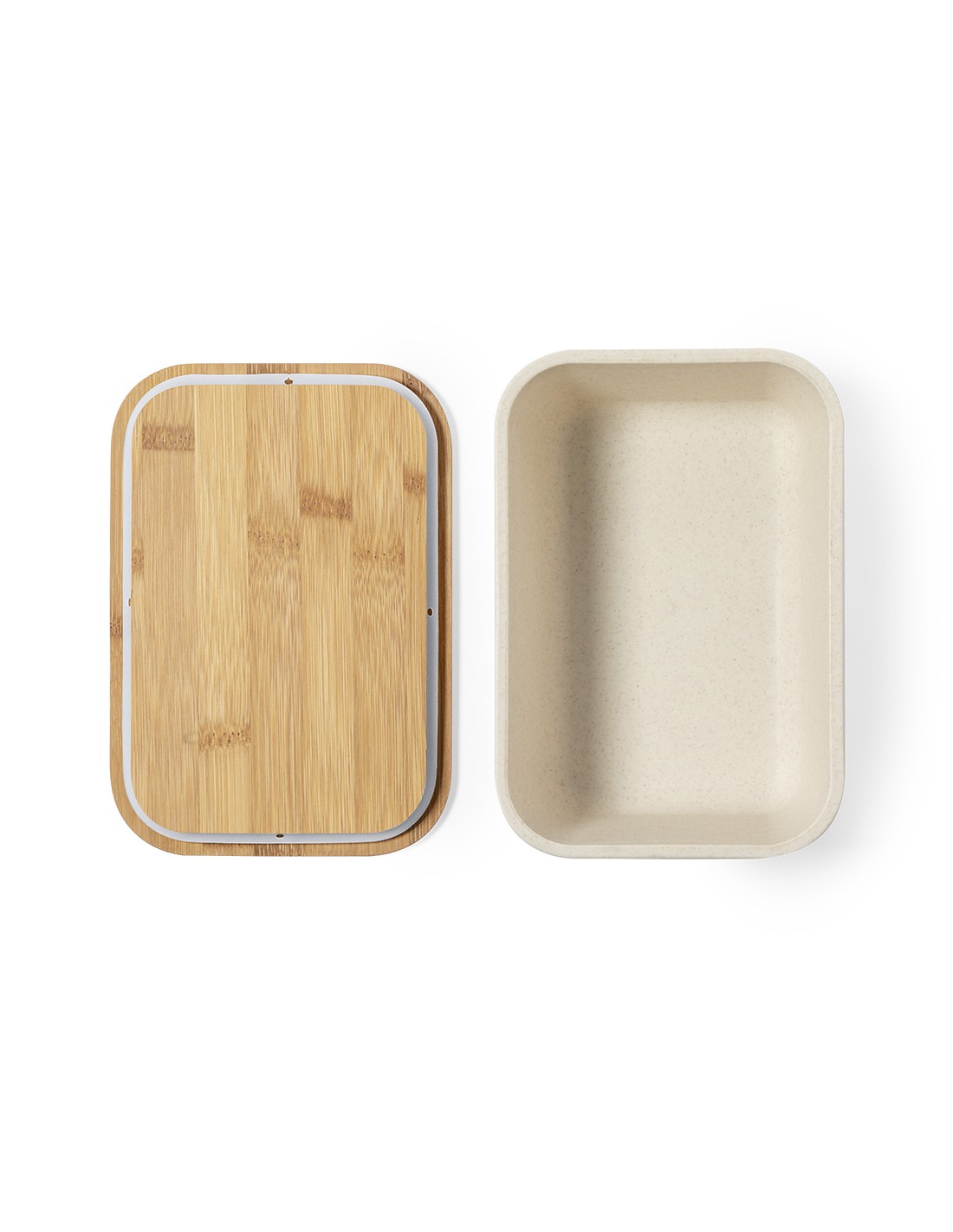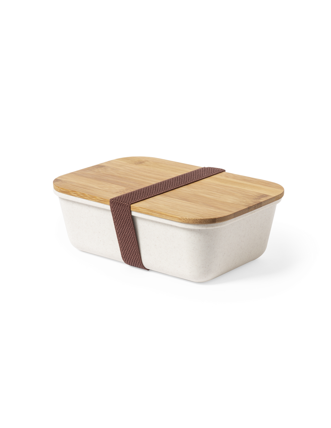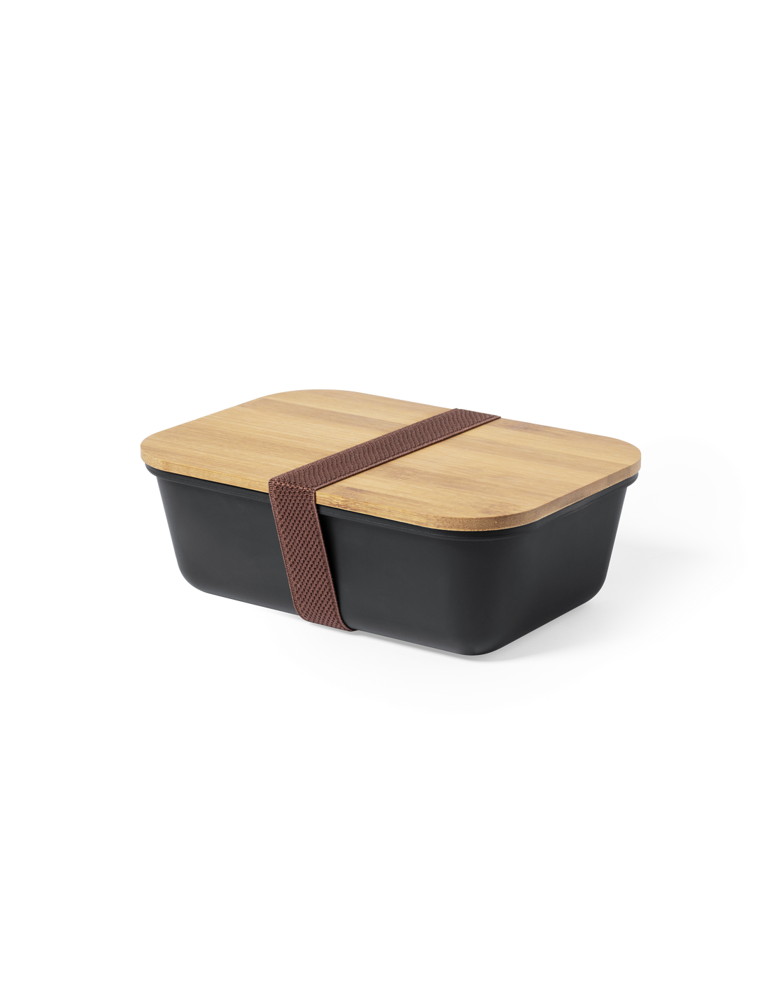 Fiambrera de 1l en resistente material PP veteado libre de BPA, con tapa de bambú. Cinta elástica de seguridad en tapa y certificación Food Grade, garantizando la seguridad cuando los alimentos entran en contacto con el material usado para fabricar el producto.