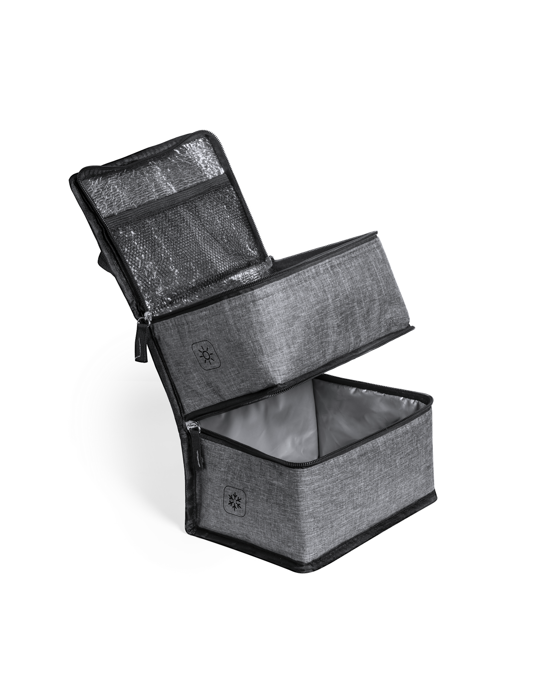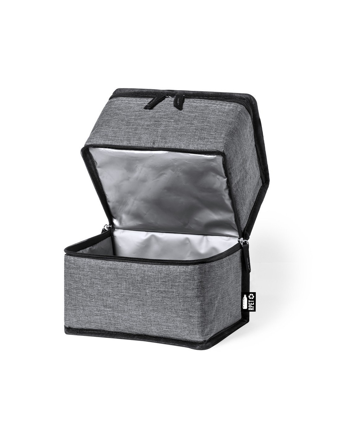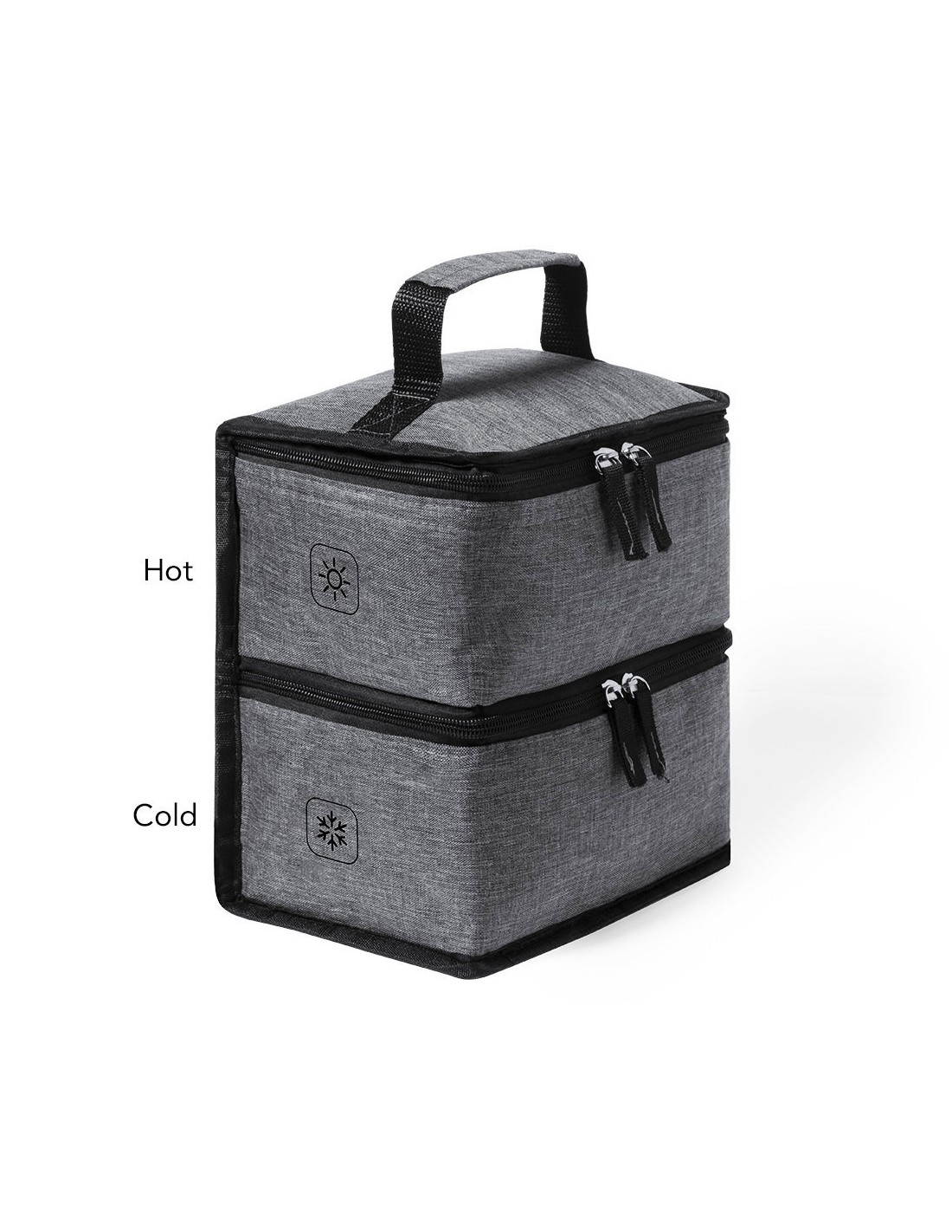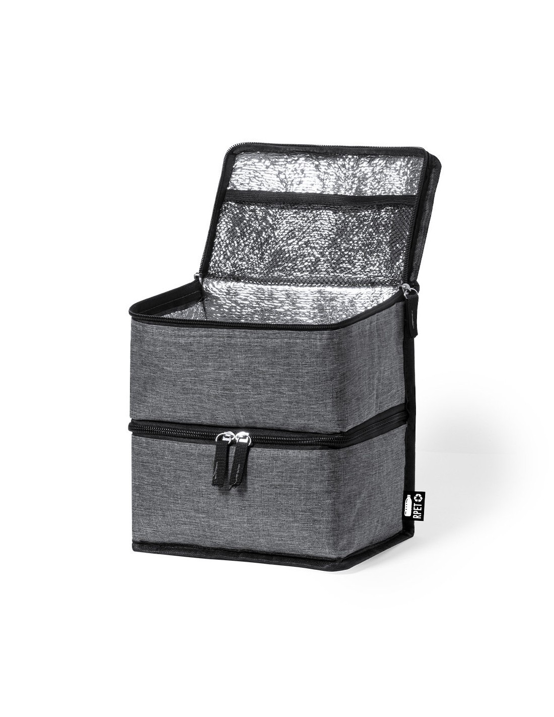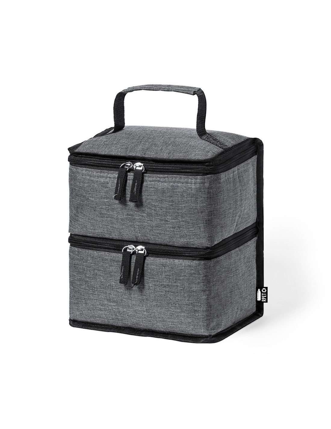 Práctica nevera de línea nature y doble compartimento fabricada en poliéster 600D RPET de alta calidad, elaborado a partir de plástico reciclado para así fomentar la reutilización de residuos plásticos y contribuir a la sostenibilidad del planeta. Asa de transporte reforzada, incluye 2 compartimentos con cierre de cremallera y doble tirador de tela, con distintivo RPET en etiqueta exterior: Compartimento superior diseñado para conservar el calor, con interior isotermo en aluminio. Compartimento inferior diseñado para conservar el frío, con interior isotermo en PEVA.