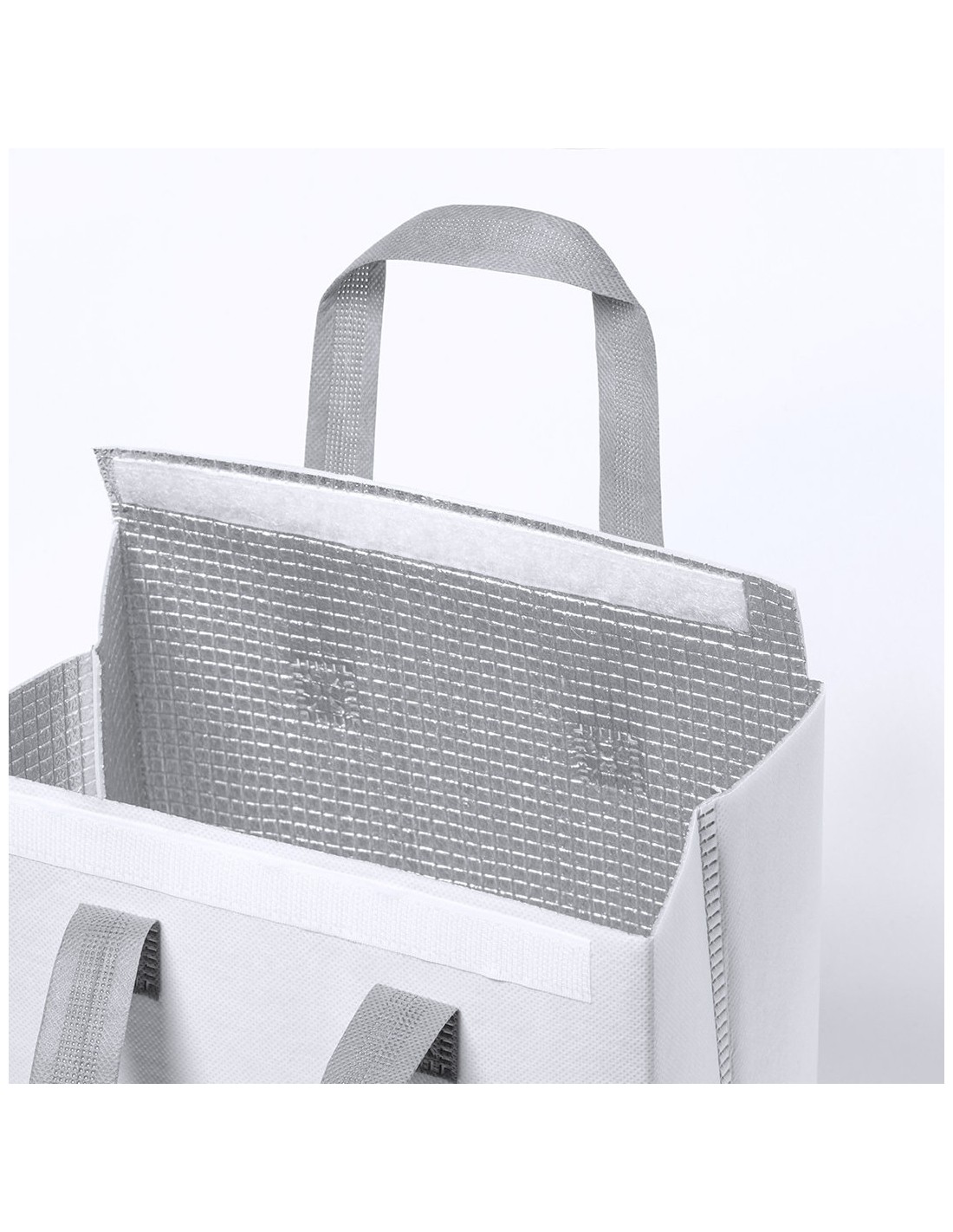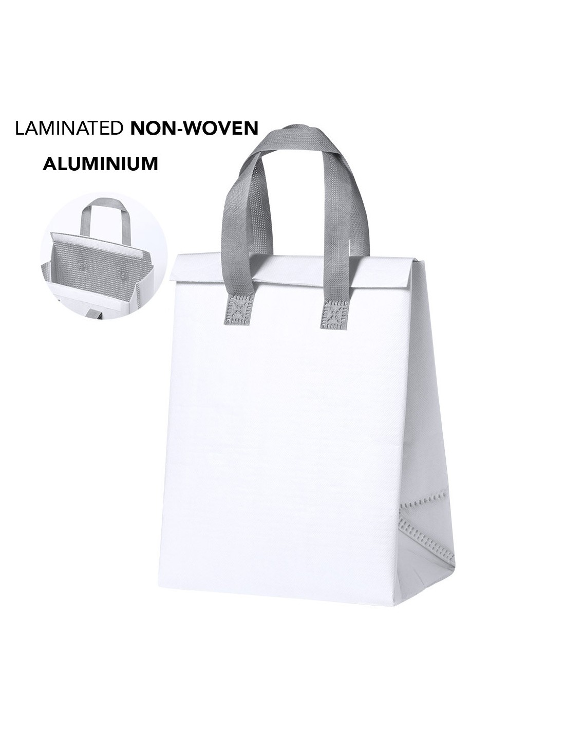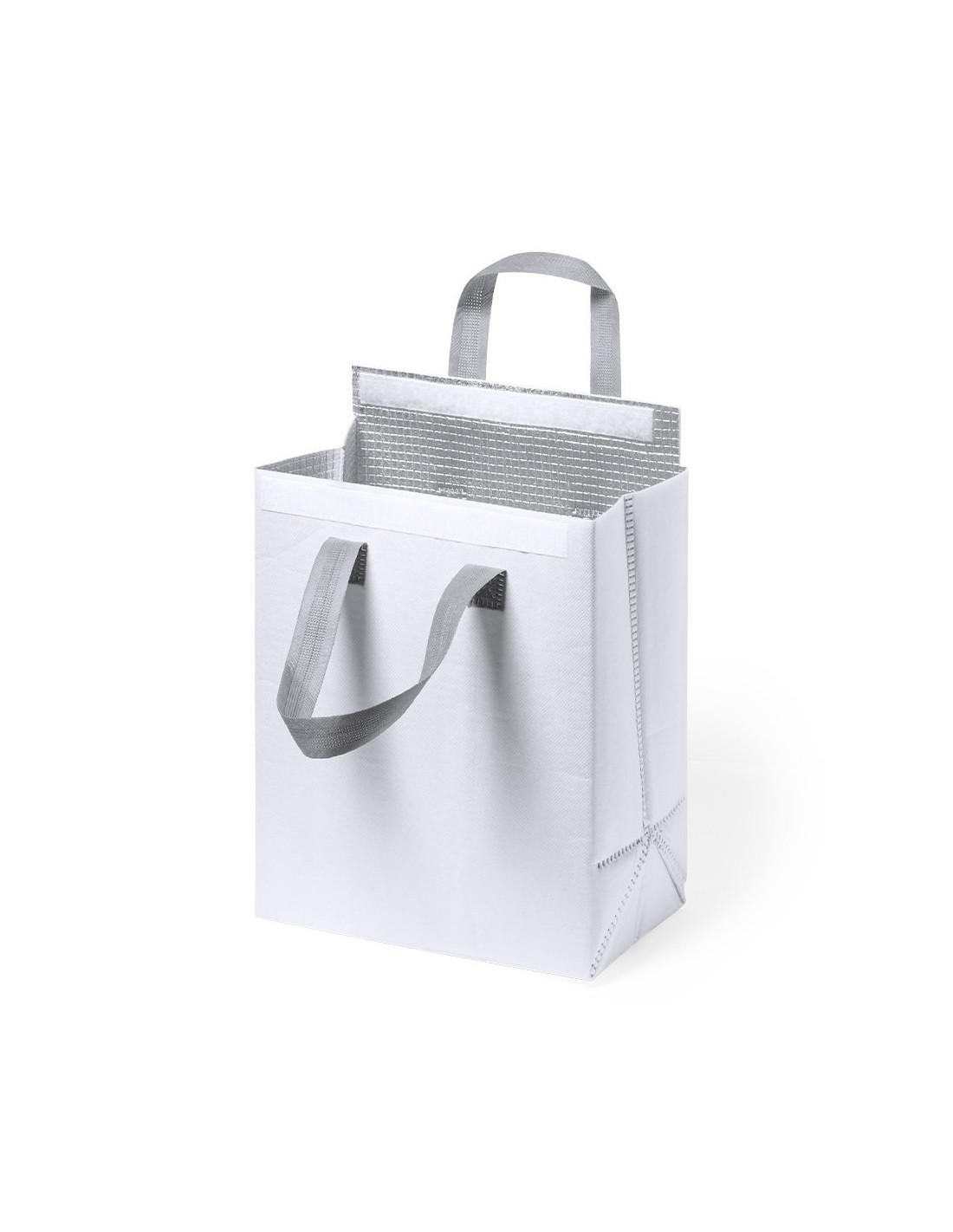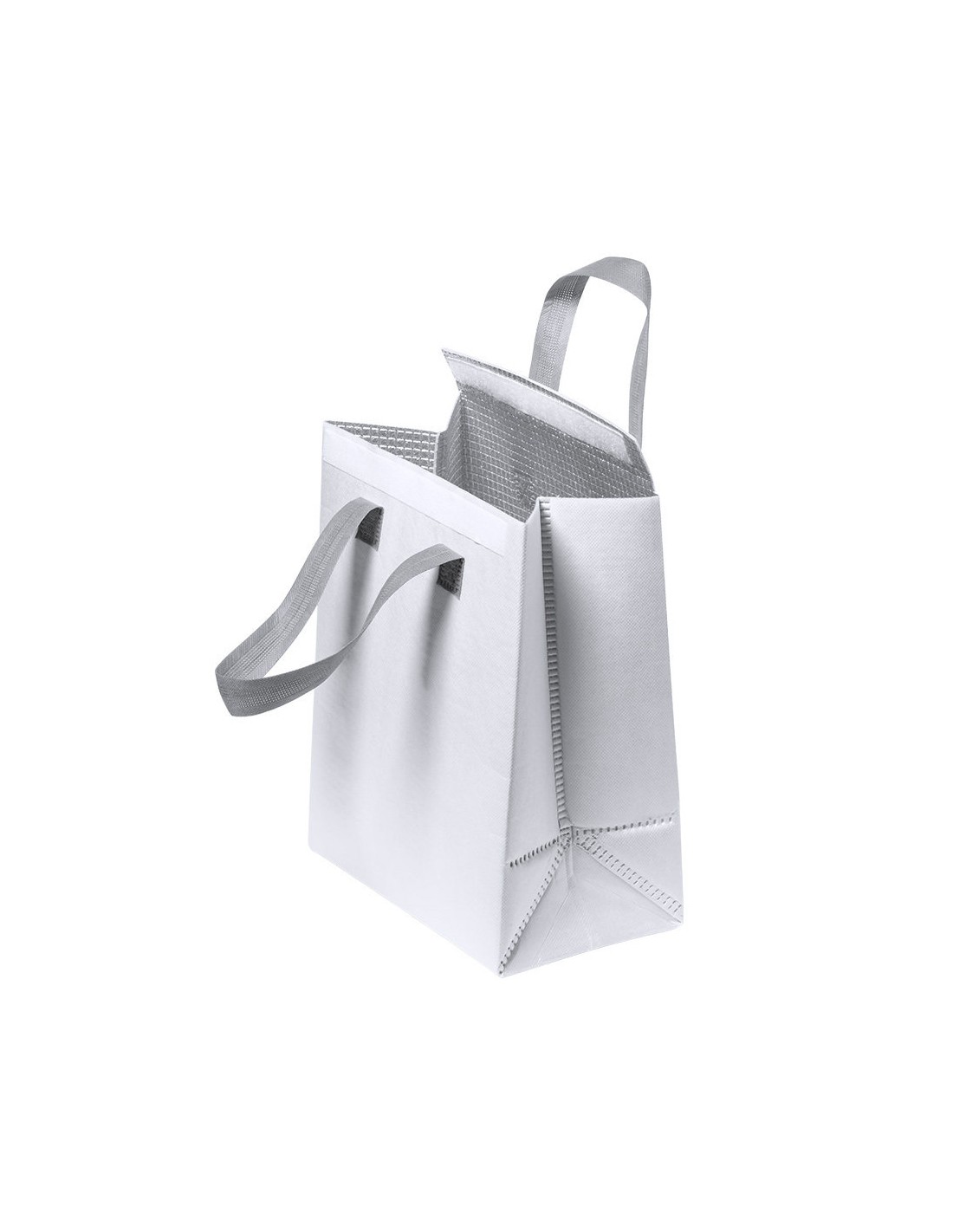 Bolsa nevera en non-woven laminado. Compartimento principal con cierre de velcro e interior isotermo de aluminio. De acabado termosellado, con fuelle y asas reforzadas. Disponible en variada gama de colores.