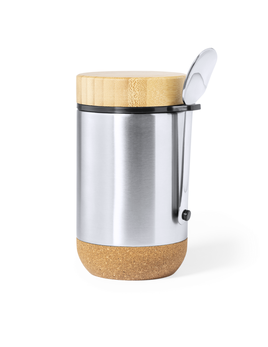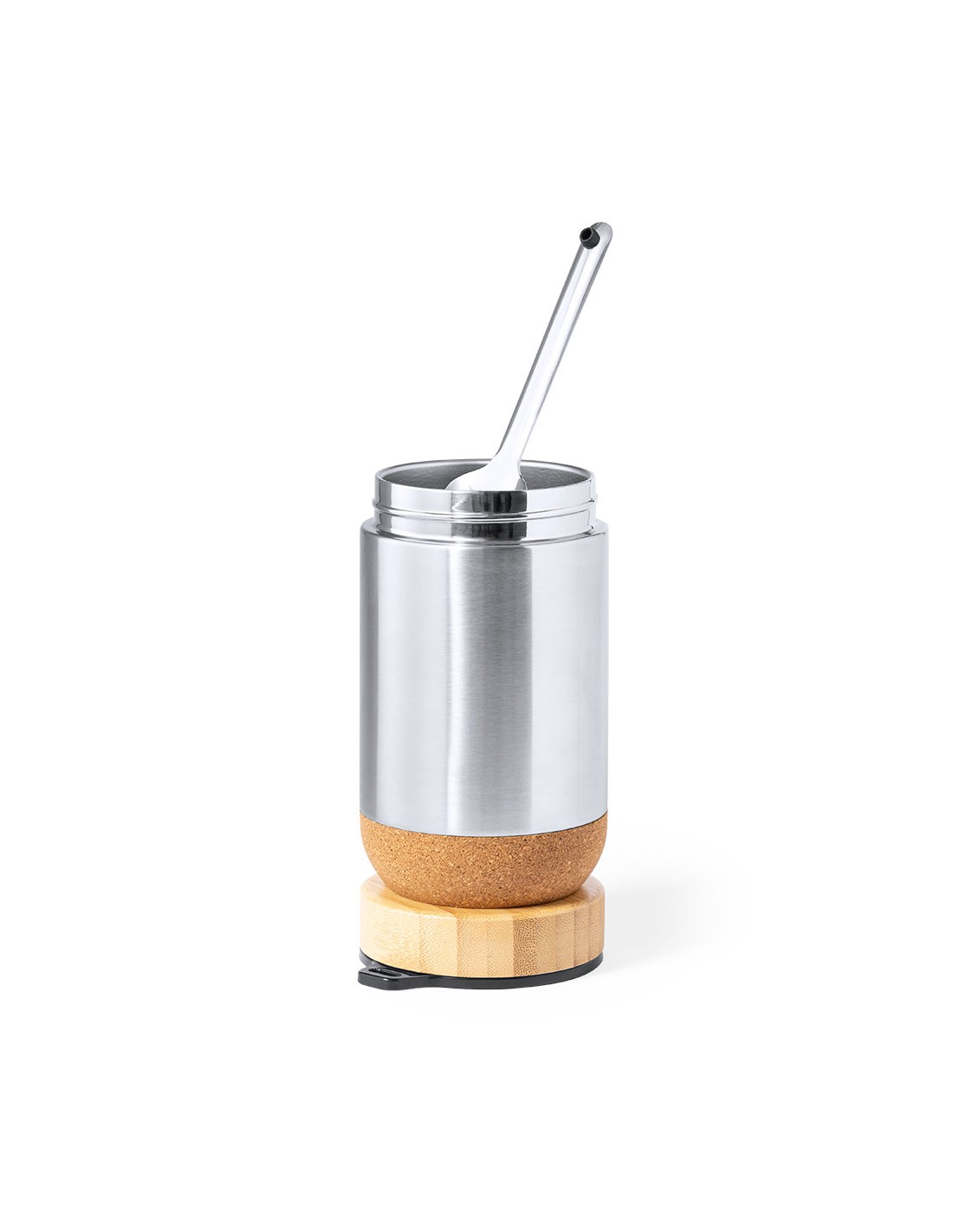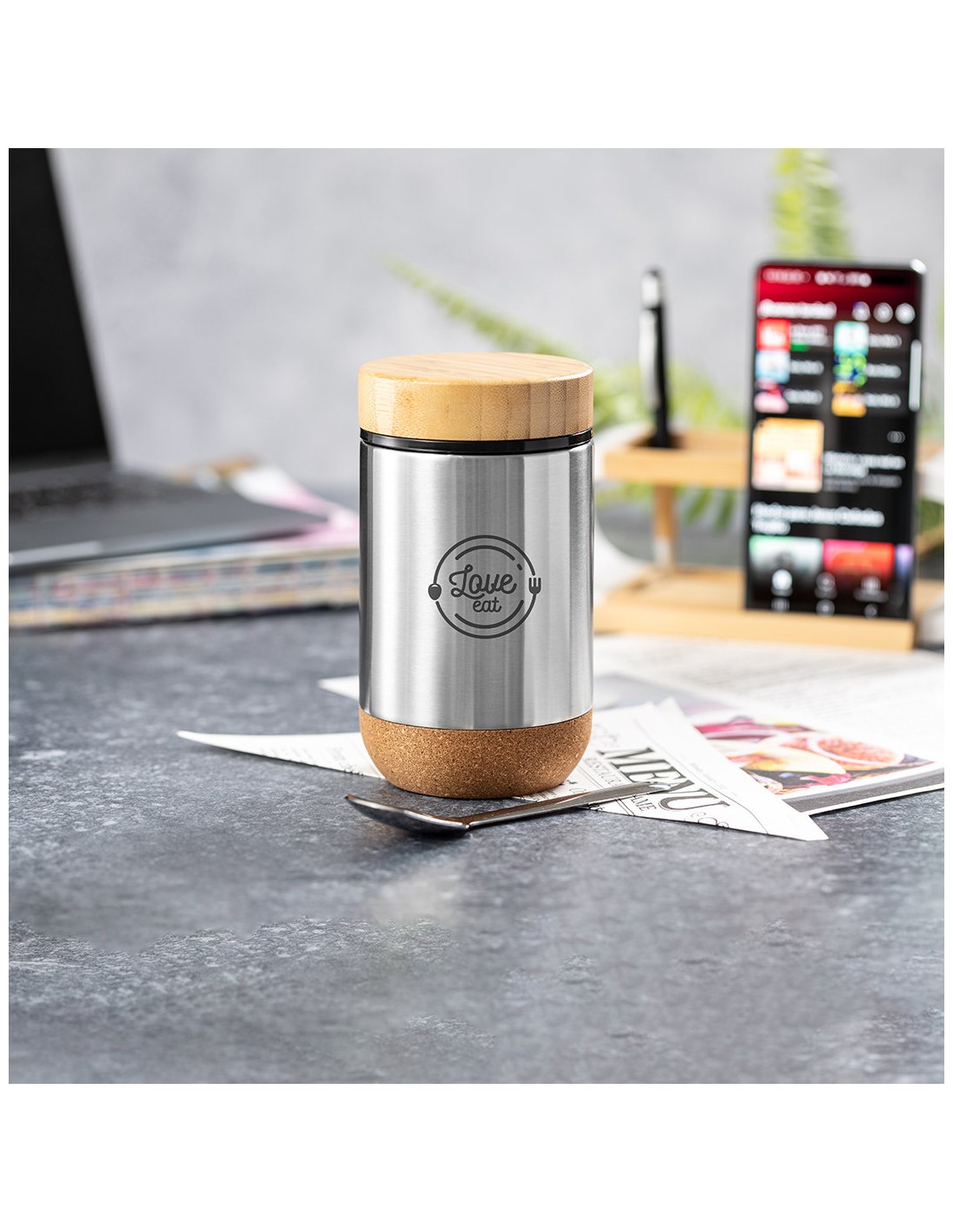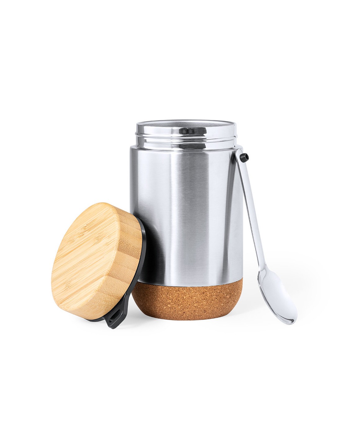 Fiambrera de línea nature y 450 ml de capacidad. Cuerpo en acero inox, con base de corcho para mantener la temperatura y tapón de seguridad en bambú, con accesorio de fijación para la cuchara de acero inox (incluida). Presentada en caja individual de diseño eco en cartón kraft.