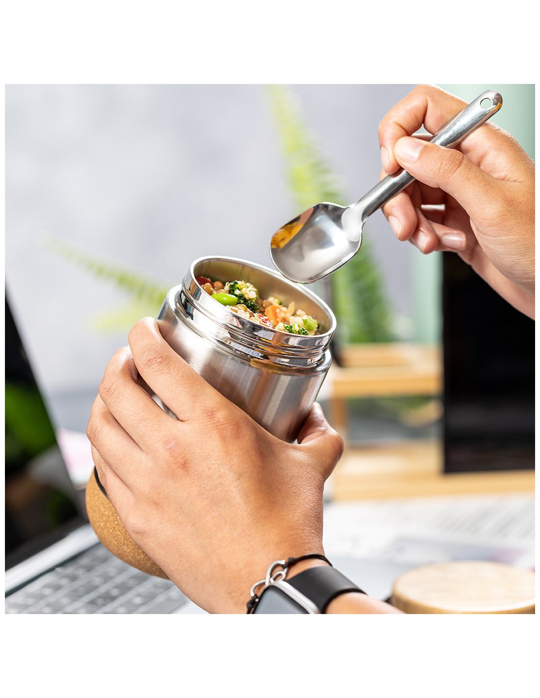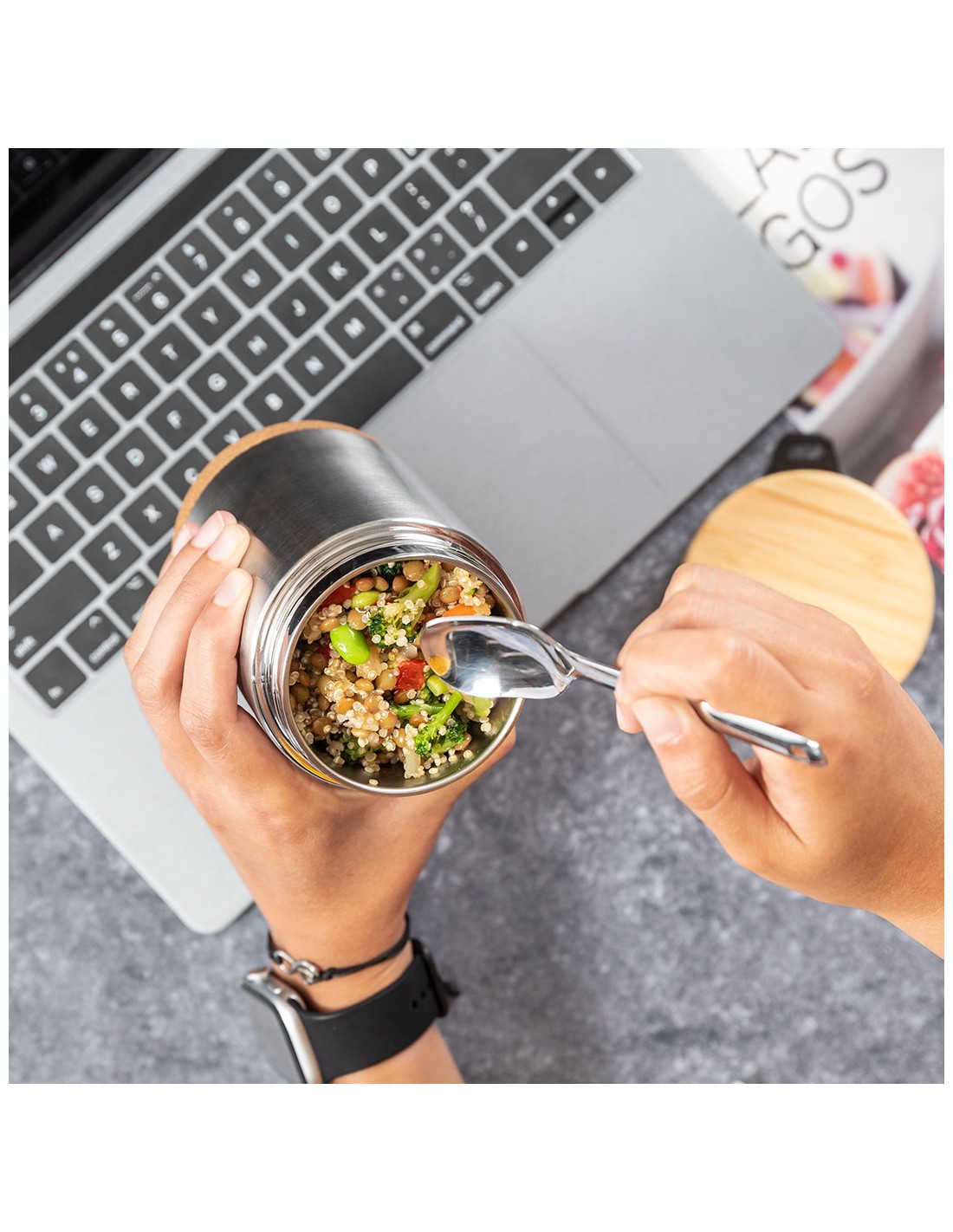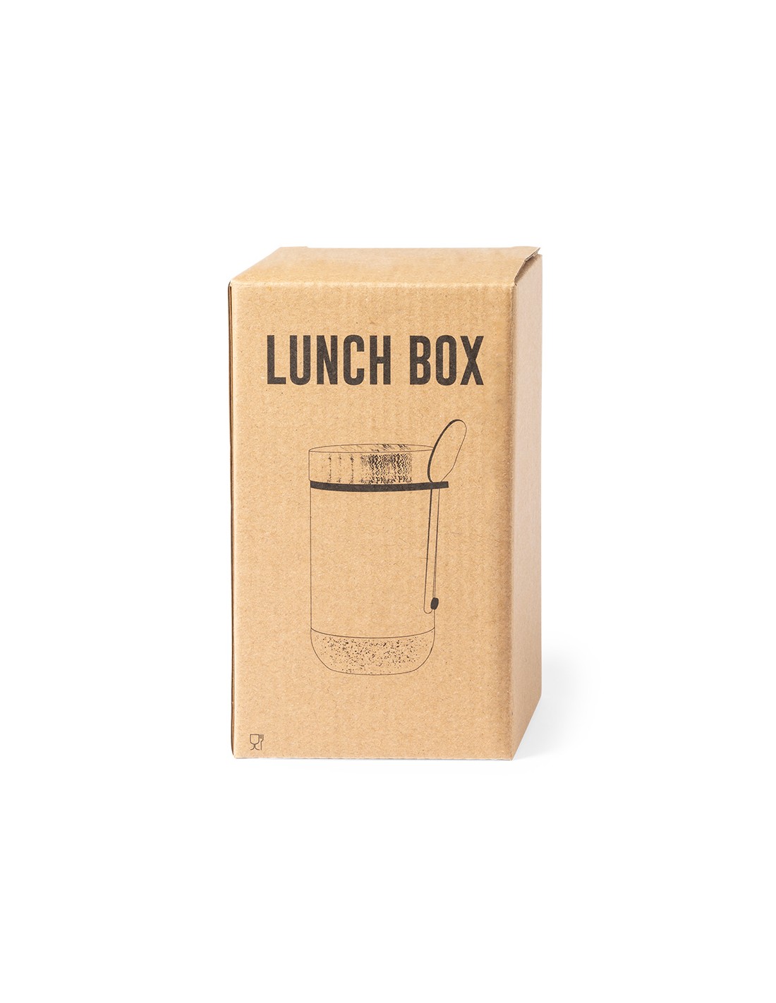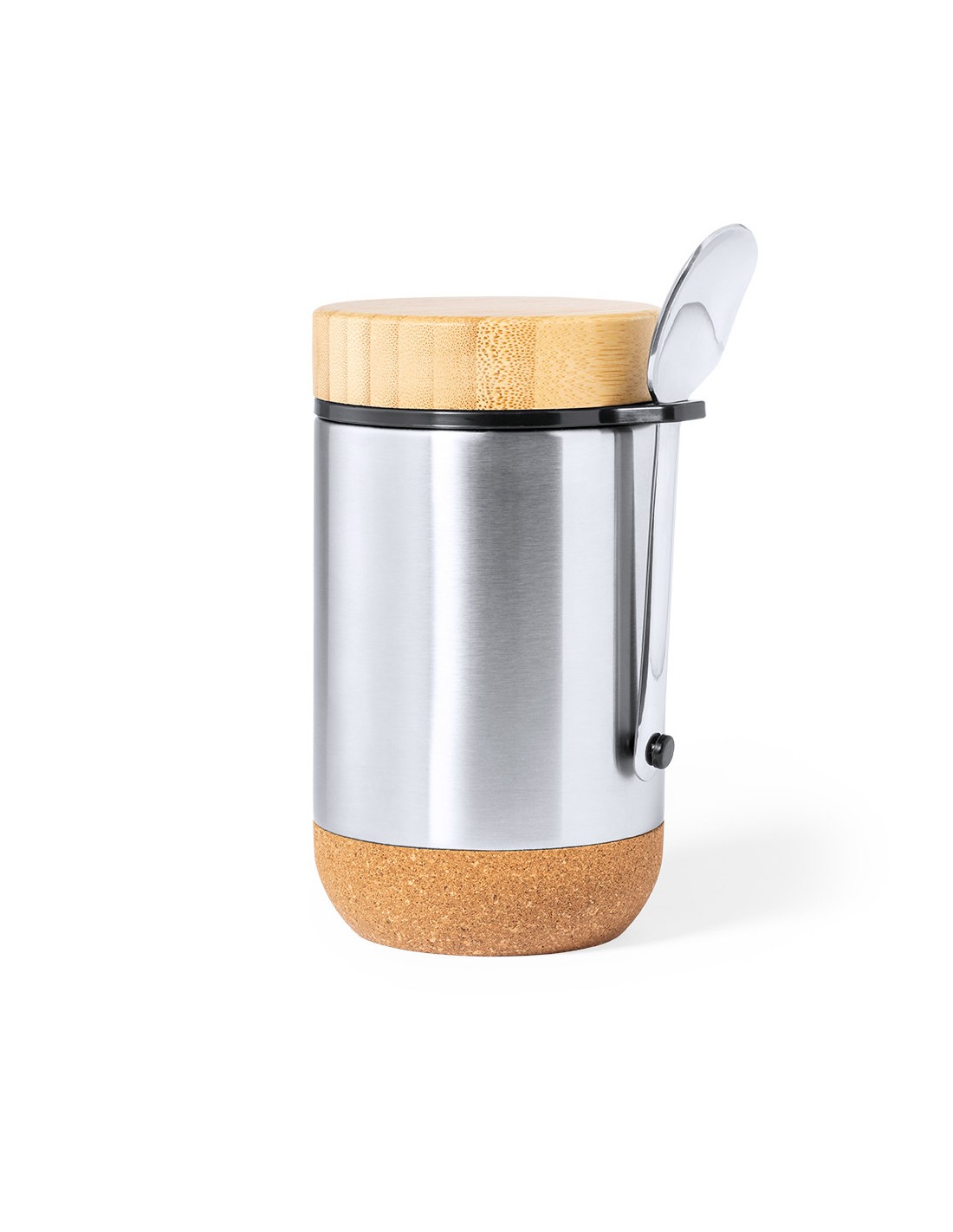 Fiambrera de línea nature y 450 ml de capacidad. Cuerpo en acero inox, con base de corcho para mantener la temperatura y tapón de seguridad en bambú, con accesorio de fijación para la cuchara de acero inox (incluida). Presentada en caja individual de diseño eco en cartón kraft.