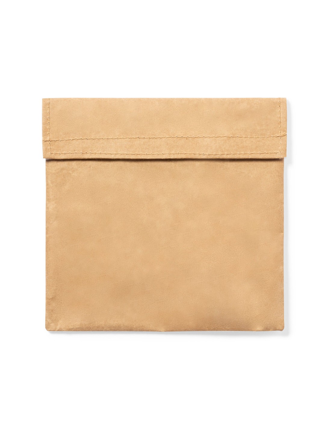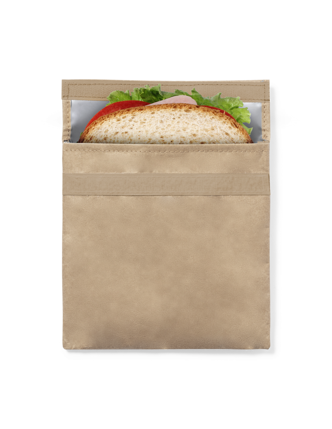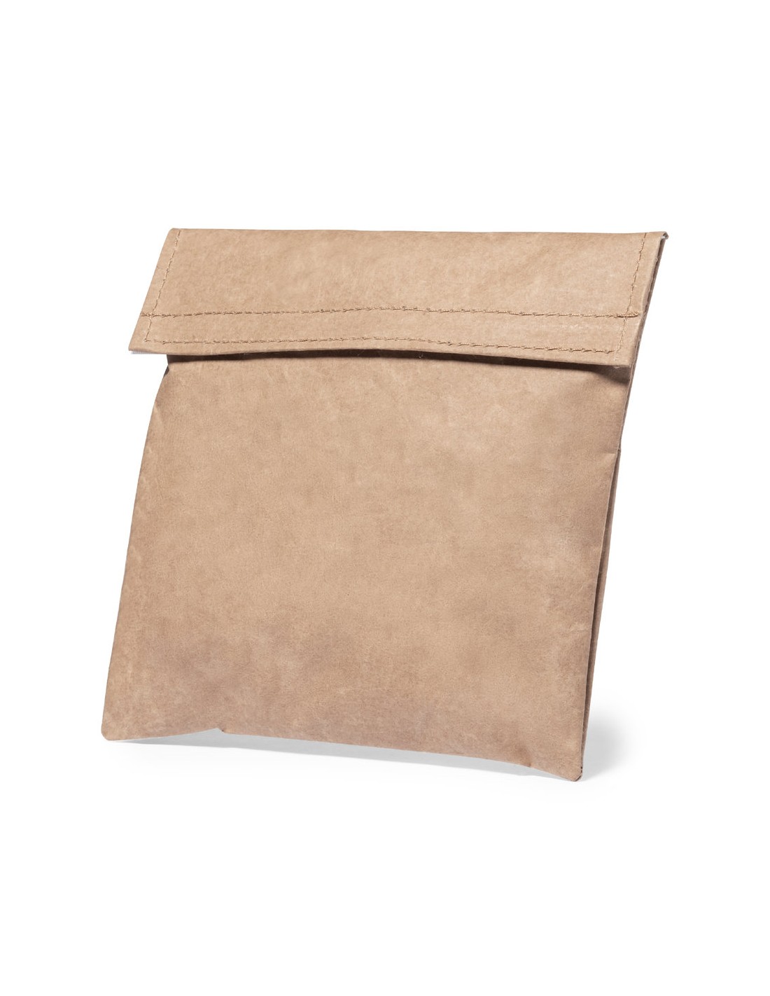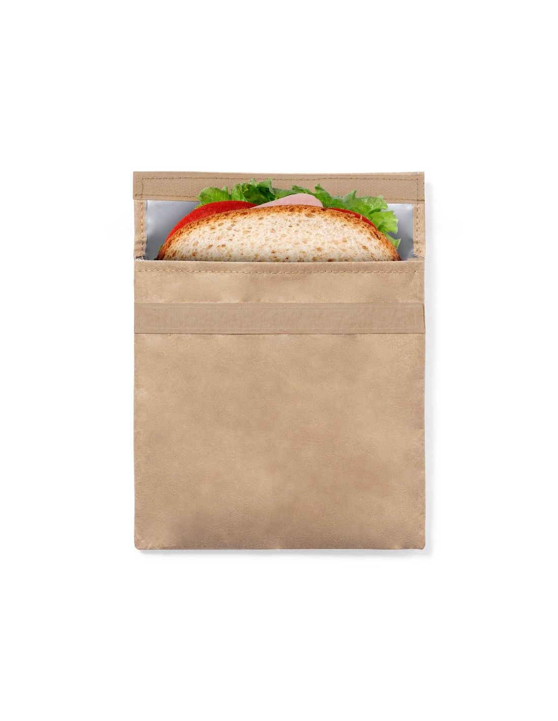 Portasnacks térmico de línea nature. Exterior fabricado en resistente papel reciclado laminado, e interior isotermo en PEVA. Con cierre de velcro.