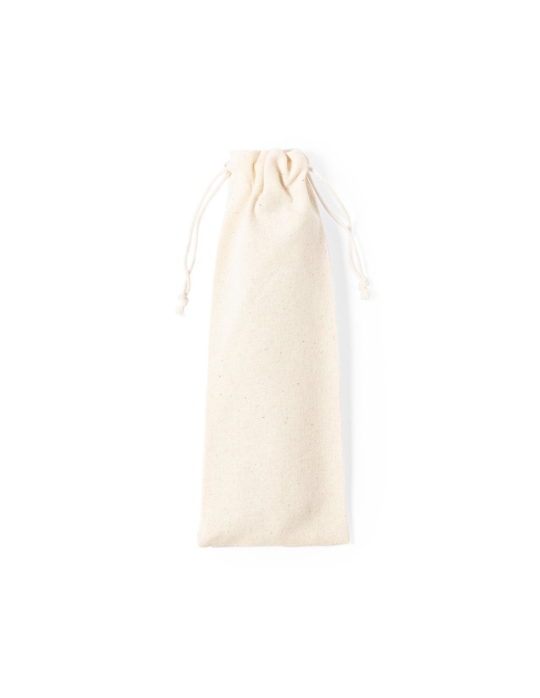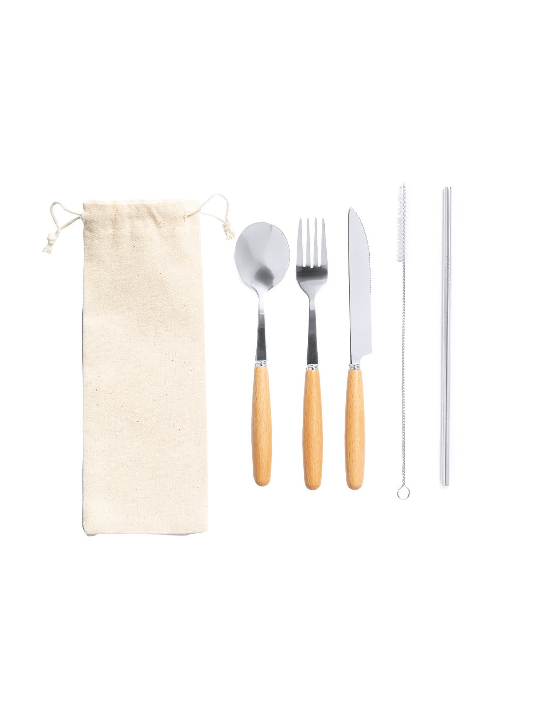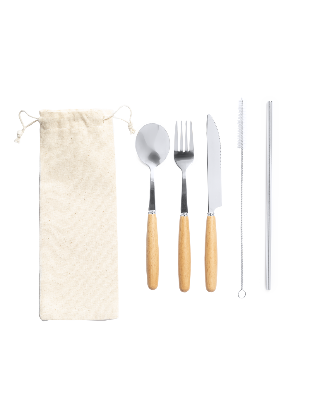 Set de cubiertos de 5 piezas fabricados en acero inox, con mango en madera natural. Incluye cuchara, tenedor, cuchillo, pajita reutilizable y cepillo limpiador para la pajita. Presentación en funda de algodón natural con cordón de cierre.
