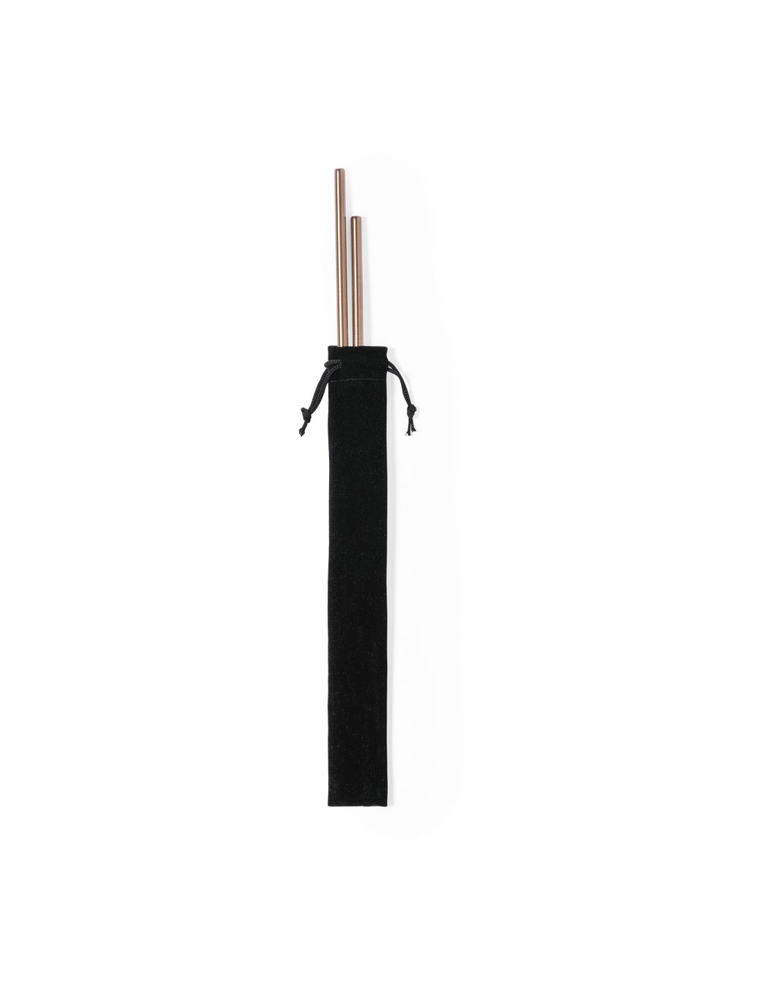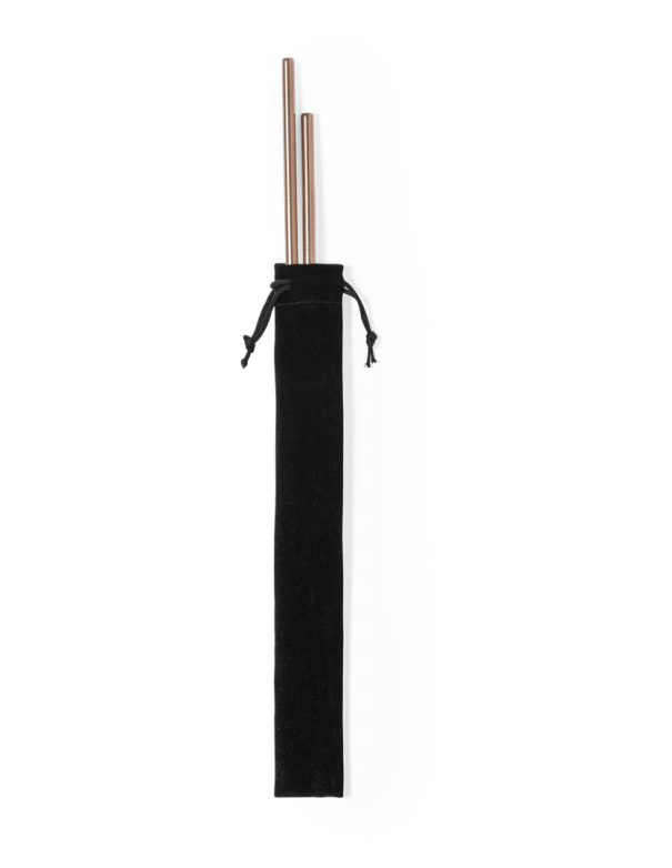 Set de pajitas de 2 piezas fabricadas en acero inox con recubrimiento exterior de cobre galvanizado. Con cepillo limpiador incluido y presentadas en funda de antelina negra con cordón de cierre.