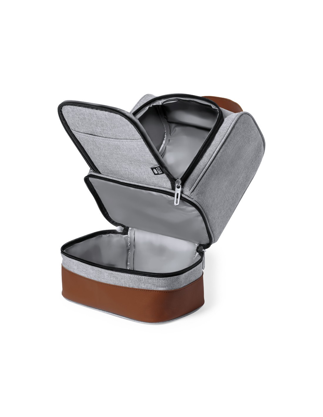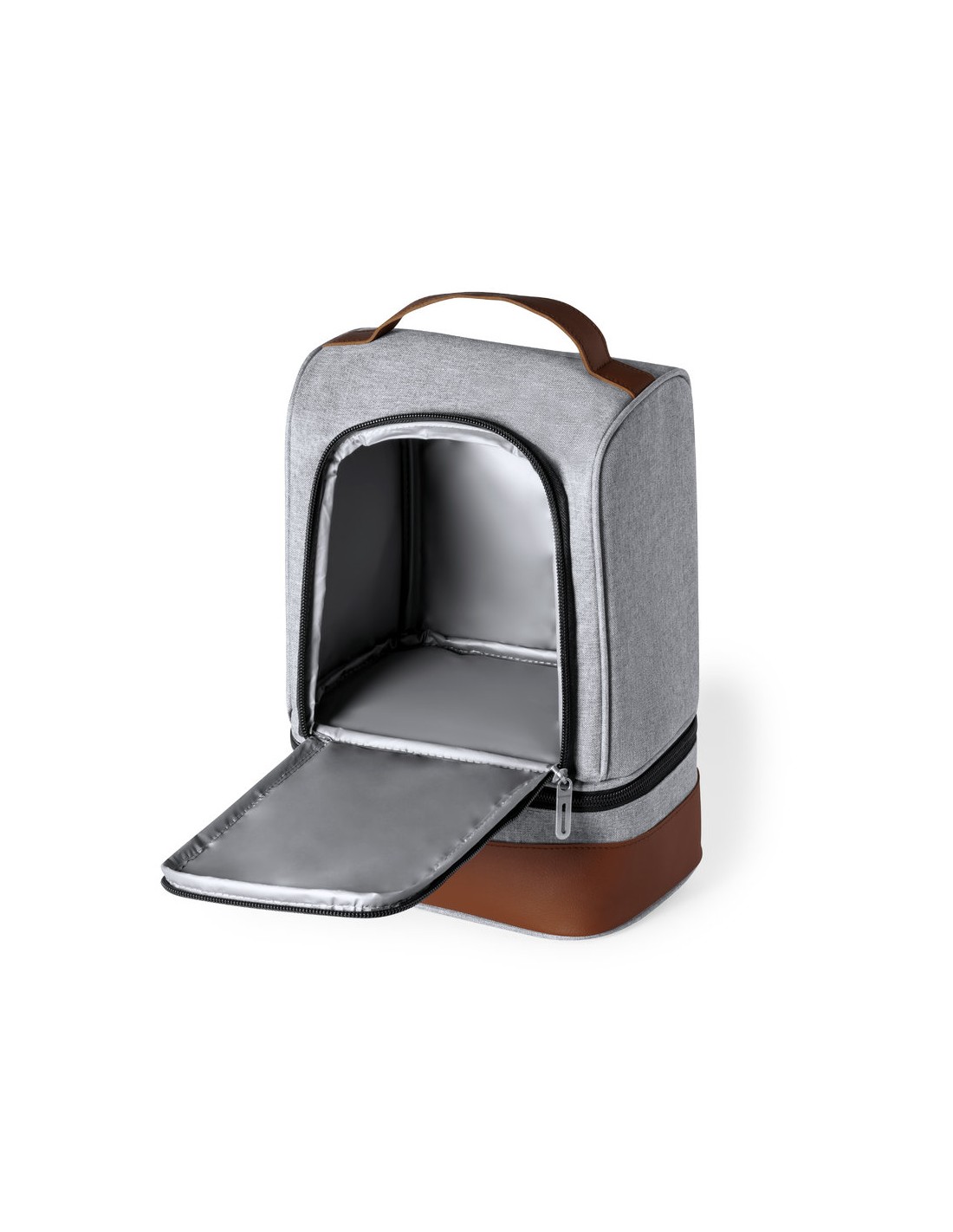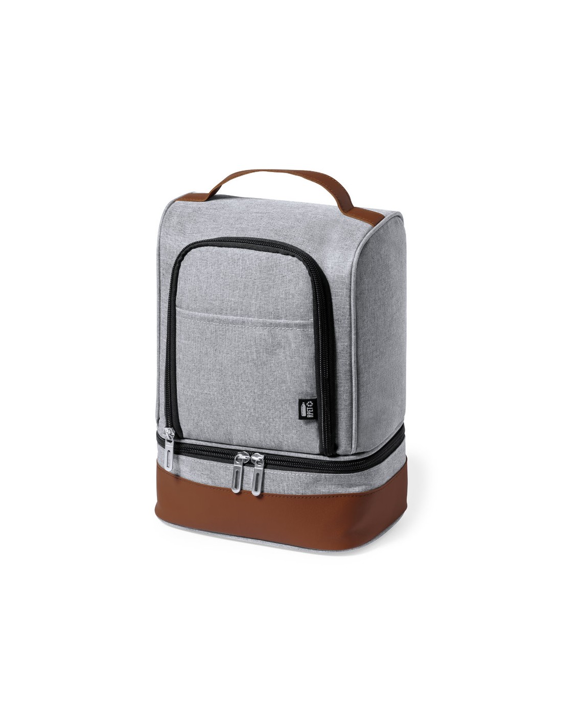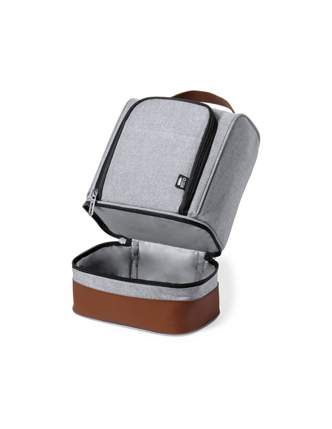 Nevera fabricada en resistente 600D RPET. Acabado en color gris, con base y asa de transporte en polipiel marrón. Incluye 2 compartimentos independientes, con cierre de cremallera y tiradores metálicos. Interior isotermo en PEVA y etiqueta exterior con distintivo RPET.El material RPET se elabora a partir de plástico reciclado, para así fomentar la reutilización de residuos plásticos y ayudar a la sostenibilidad del planeta.